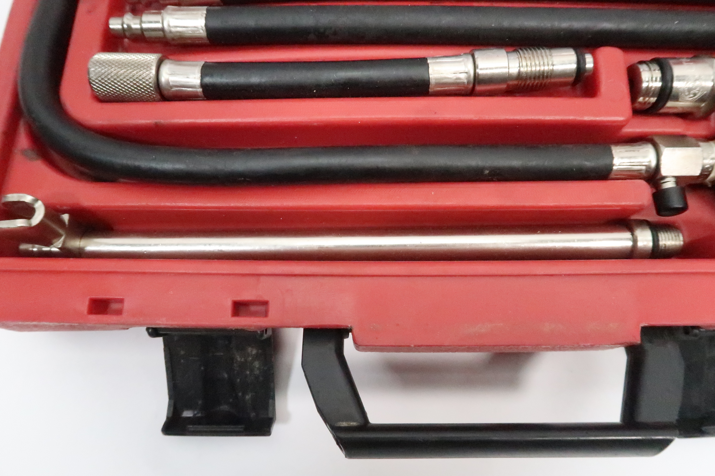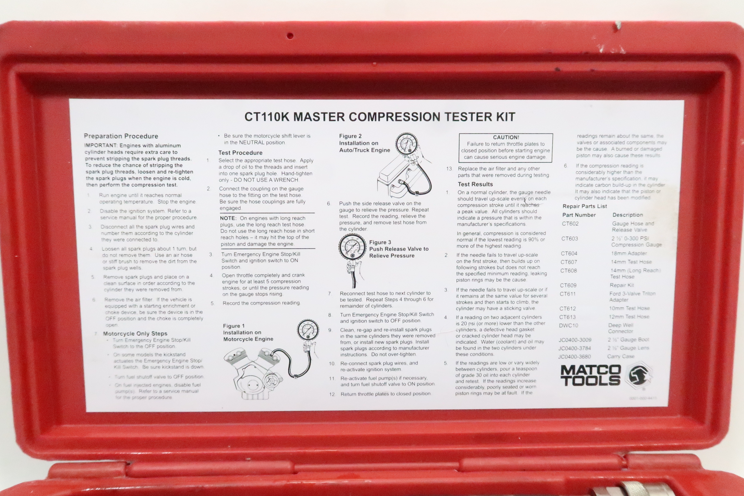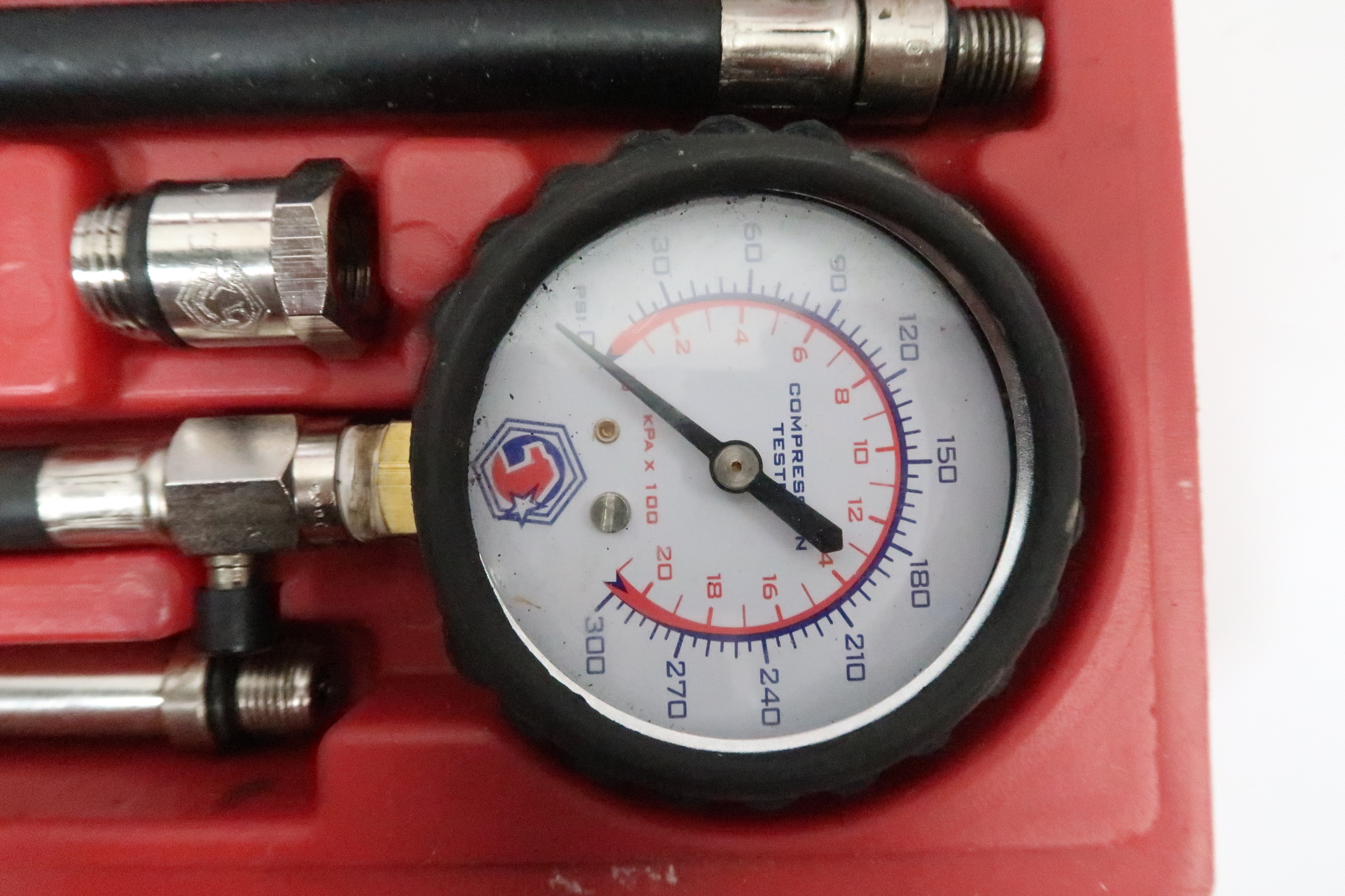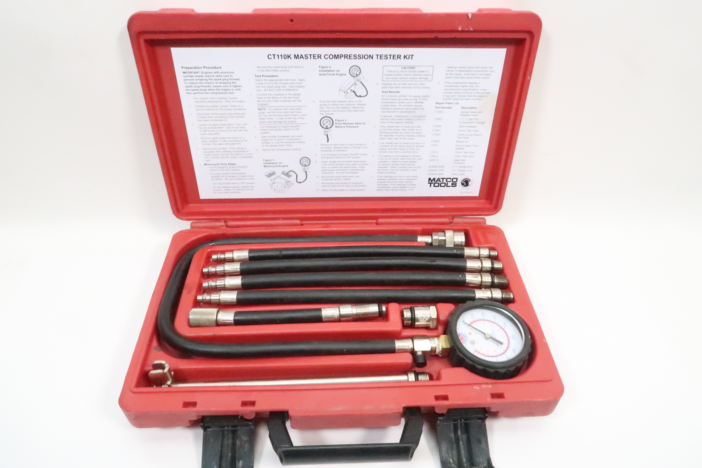 Comprehensive compression testing set for most gasoline engine applications including import, domestic, motorcycles, marine and small engines