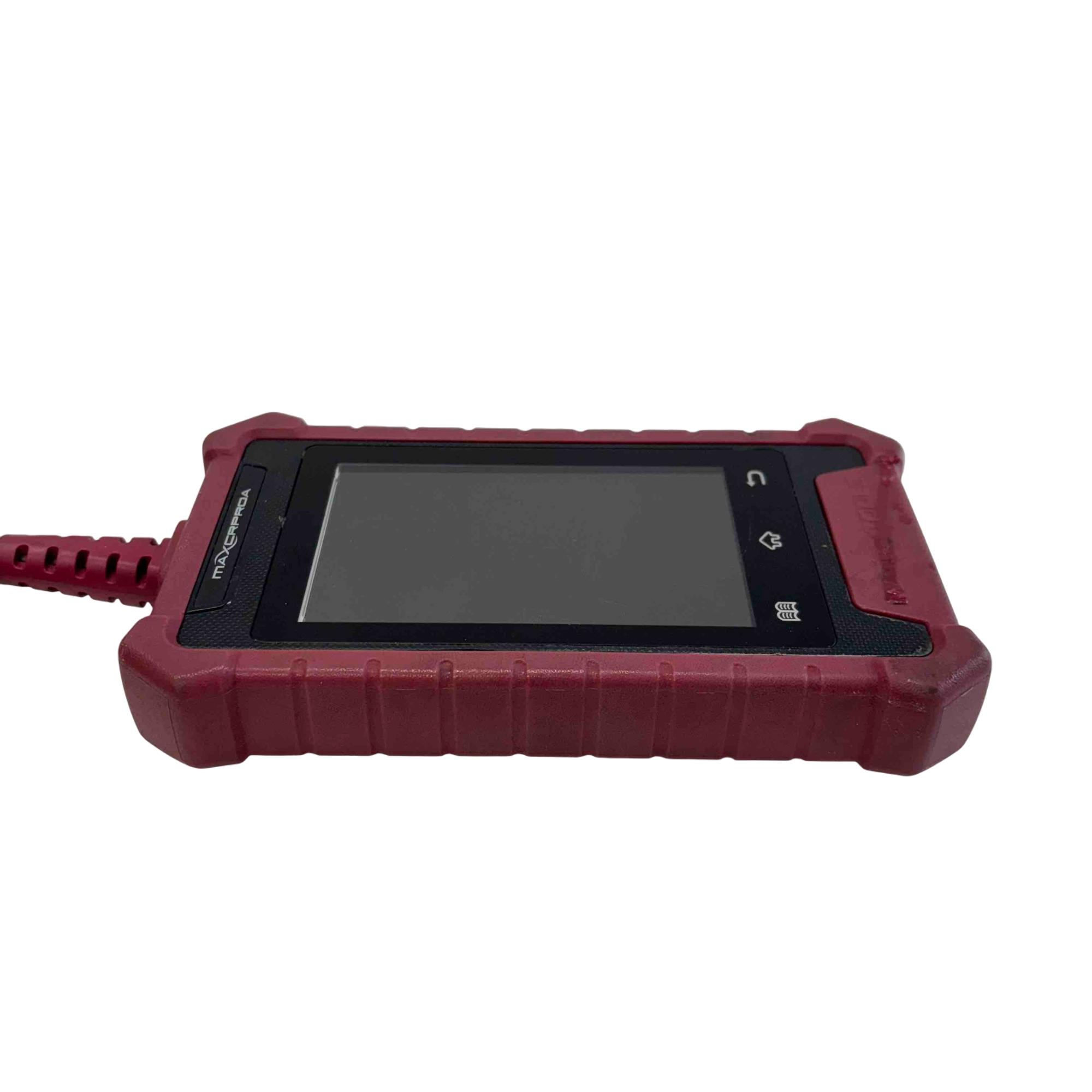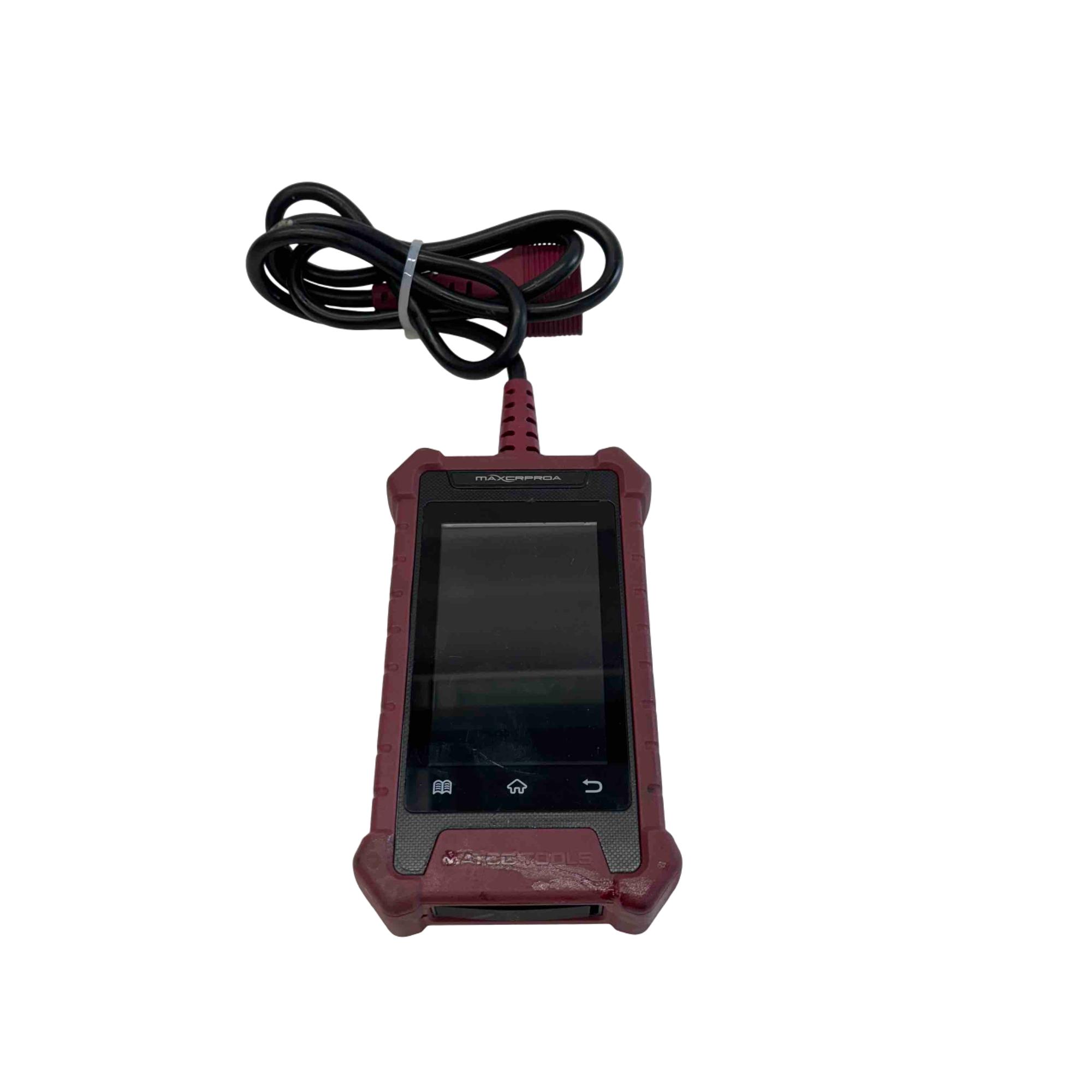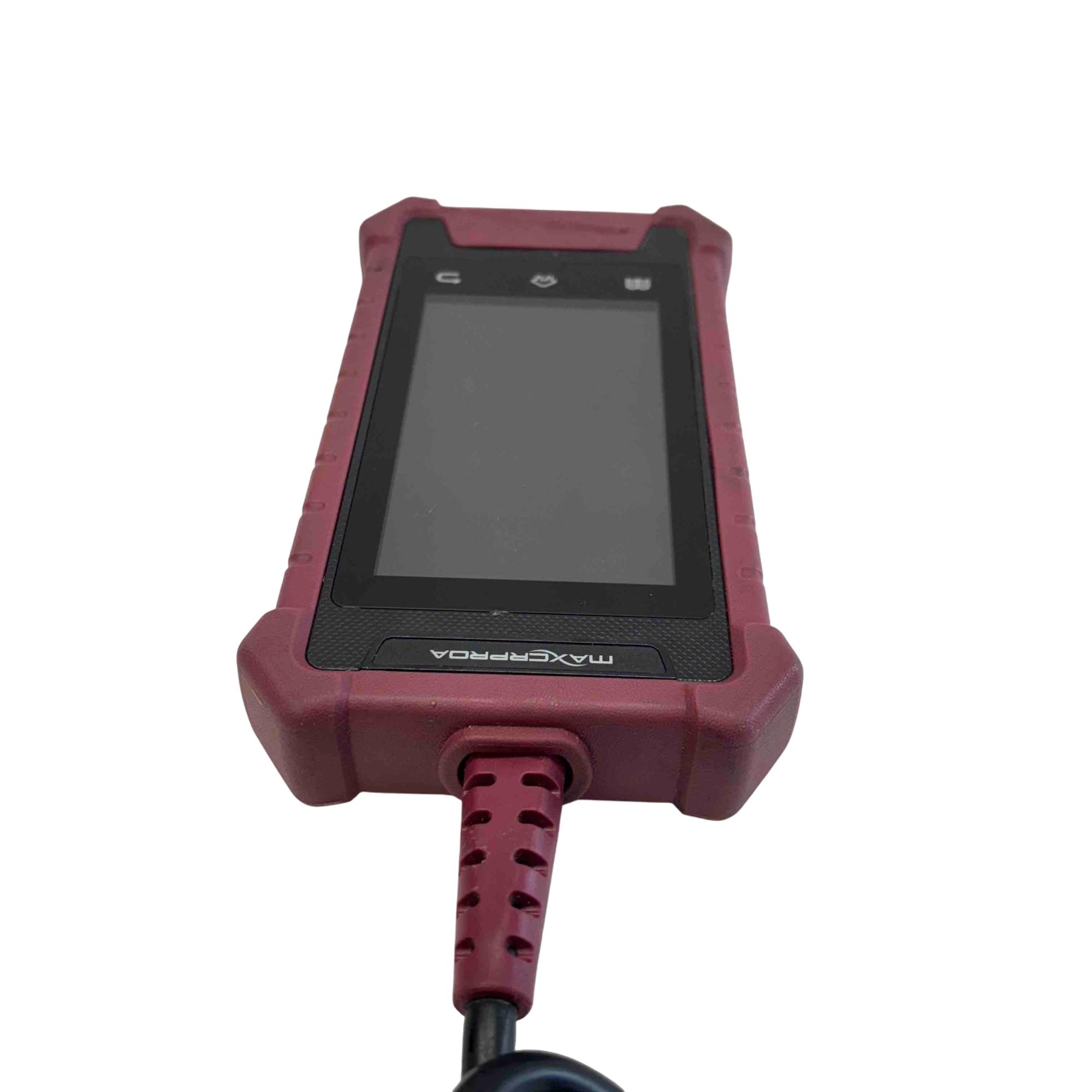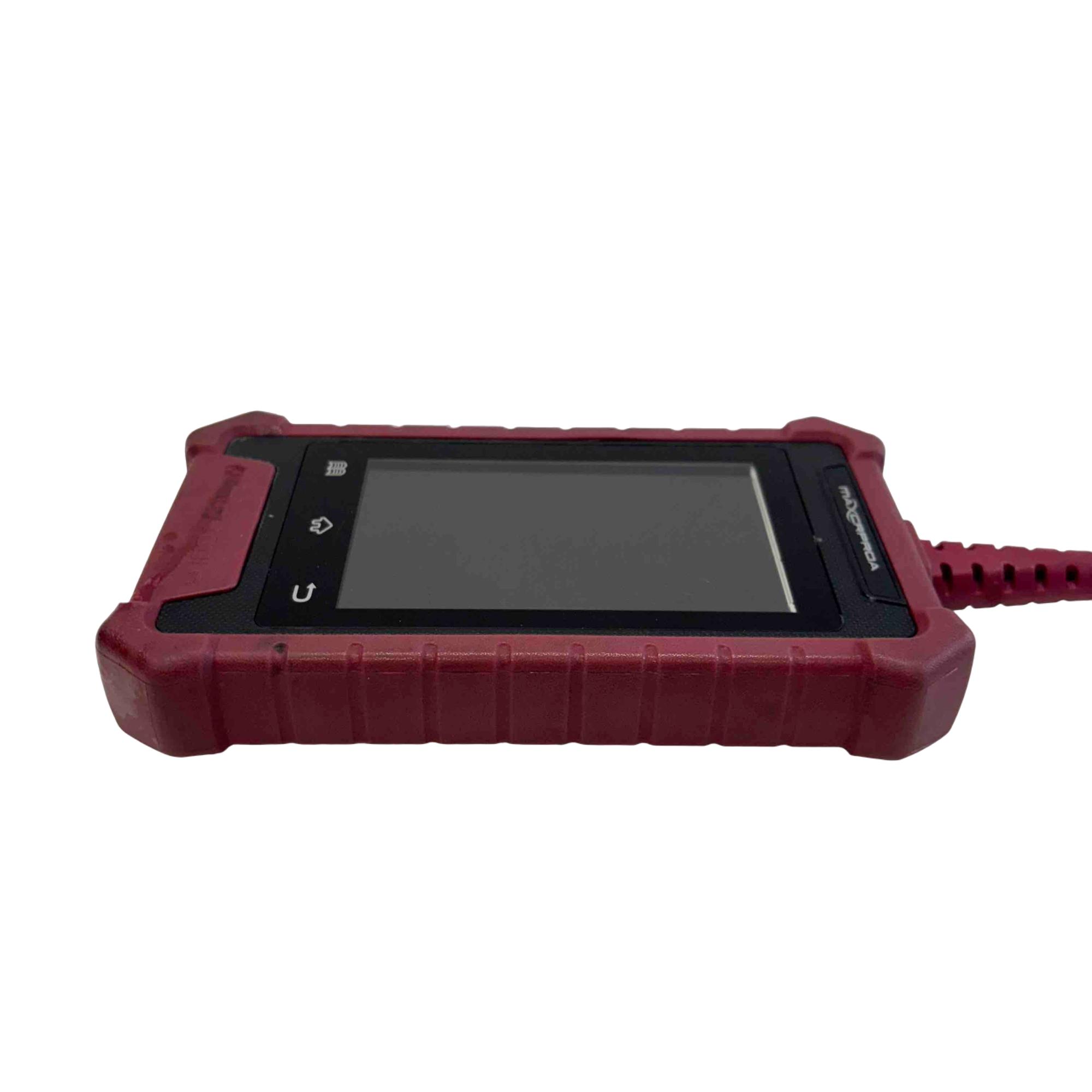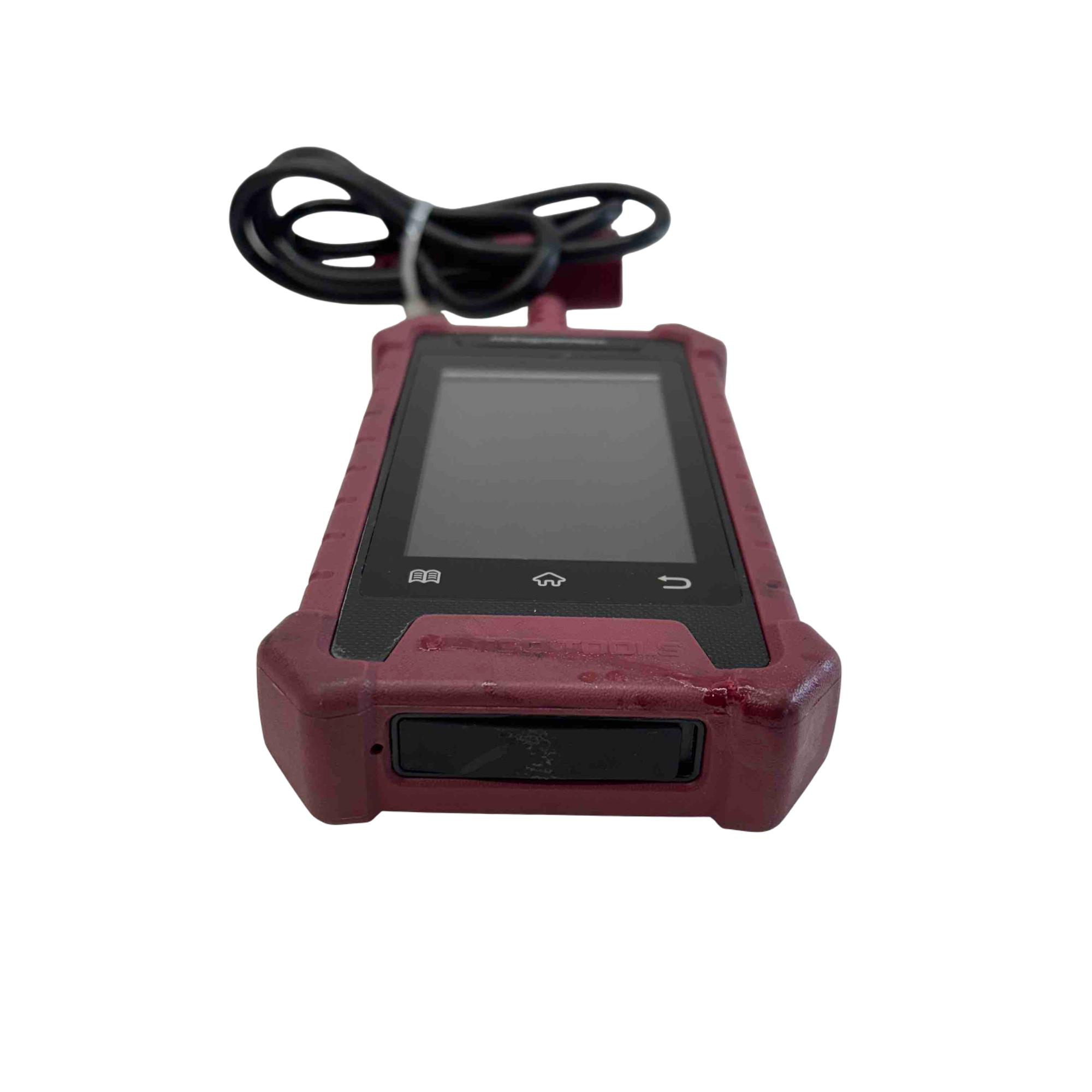 4" color touchscreen, an Android-based platform, and support for OBDII modes 1-10. It can read/clear trouble codes, view freeze frame data, display live data streams, and perform service resets like oil light, electronic parking brake, and battery management