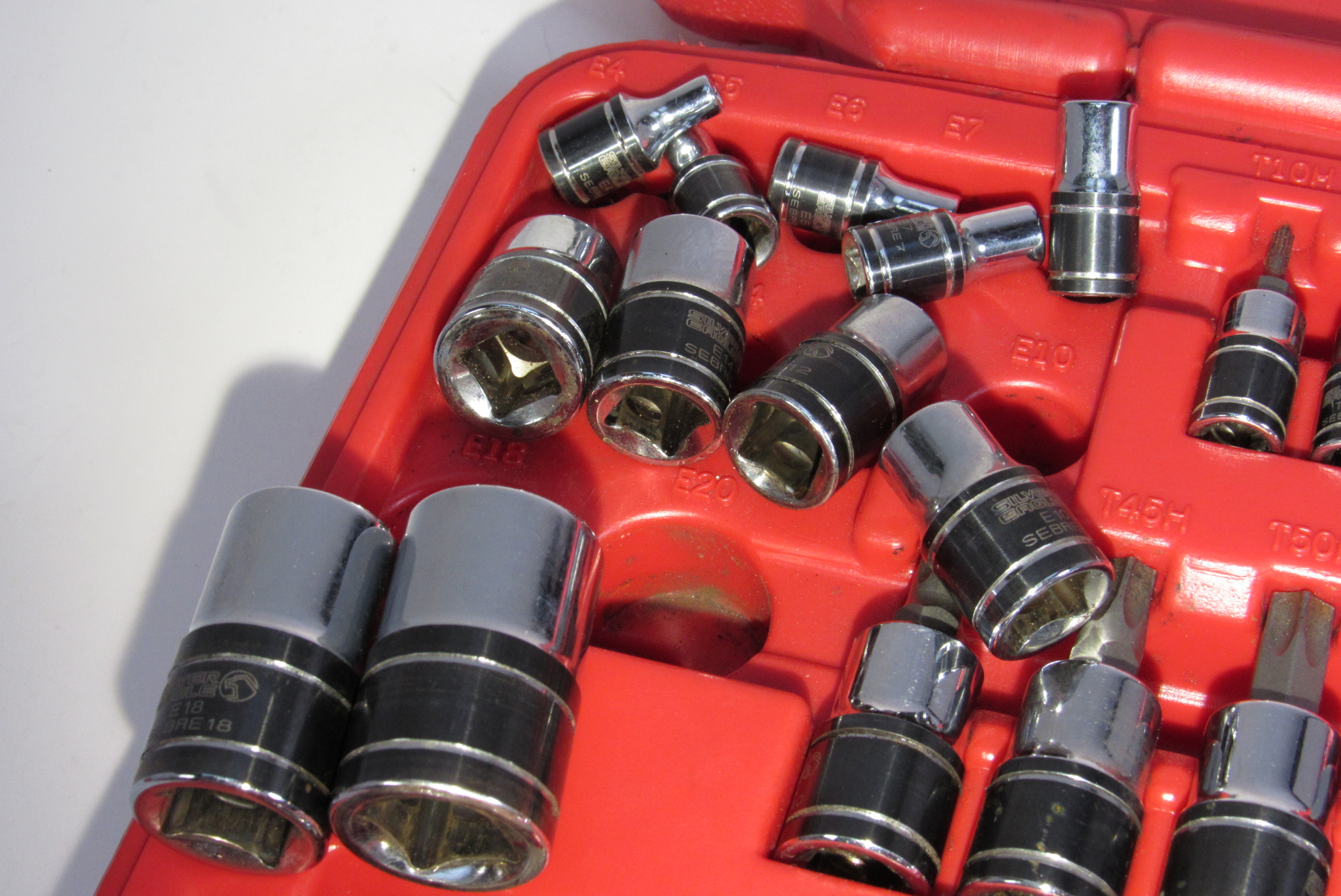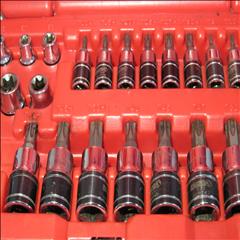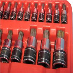 Extensive assortment of socket bit drivers including 7 hex socket bit drivers, 13 TORX socket bit drivers, 10 tamperproof TORX socket bit drivers and 11 recessed TORX socket bit drivers.