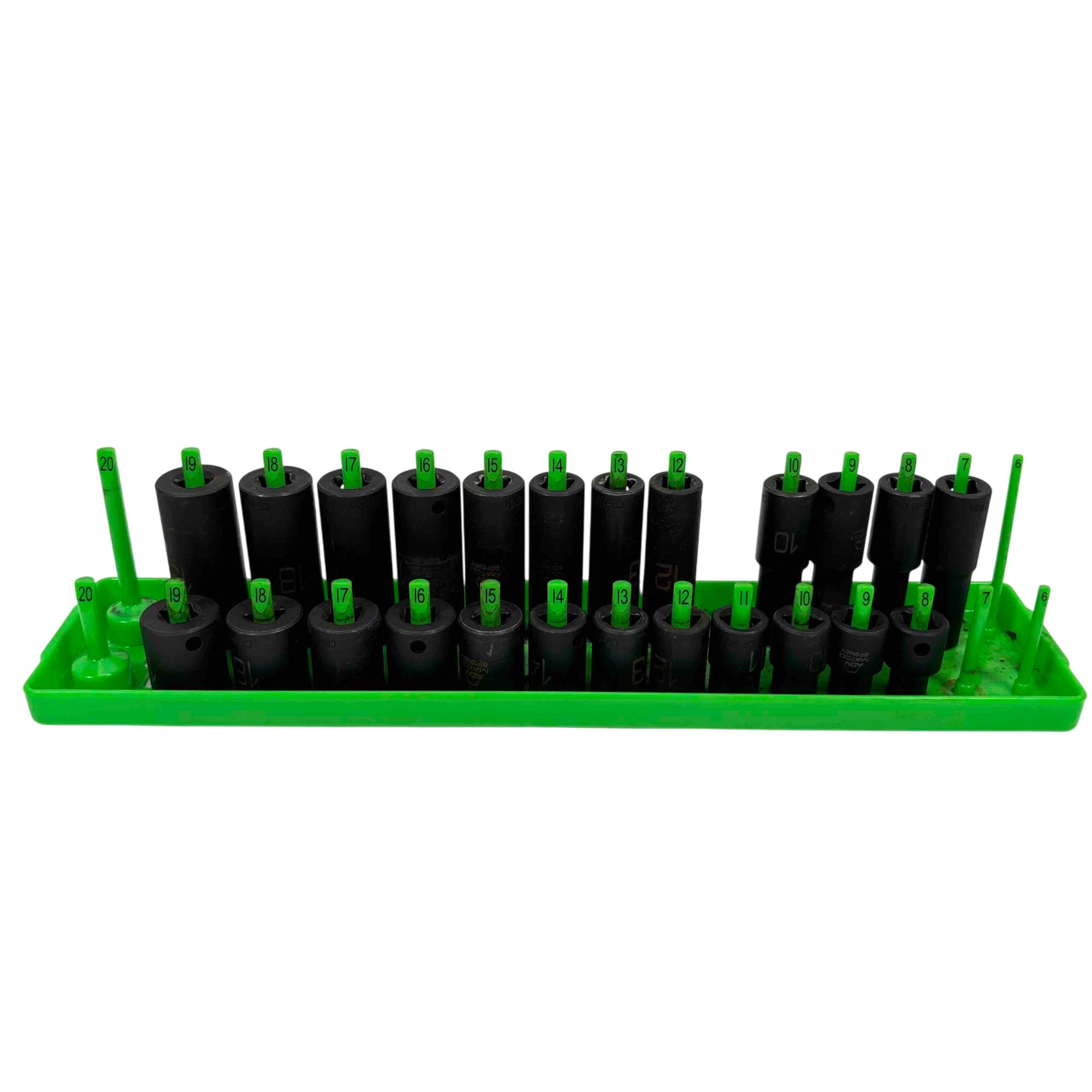 This is a high-quality Matco Tools CR-MO (chromium-molybdenum steel) metric impact socket set, ranging from 8mm to 19mm. Designed for automotive and mechanical work, each socket is clearly marked and securely organized in a durable green tray. Perfect for professionals or enthusiasts seeking reliability and organization in their hand tools.