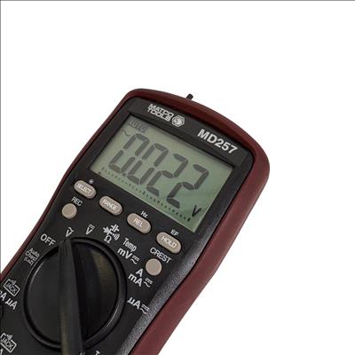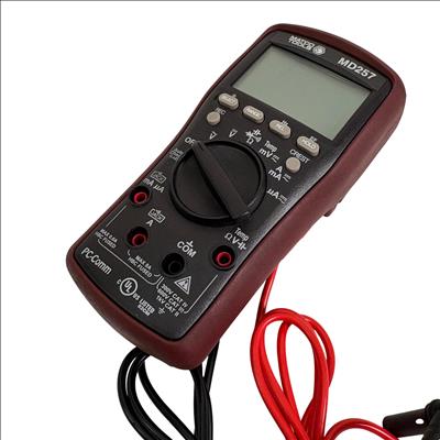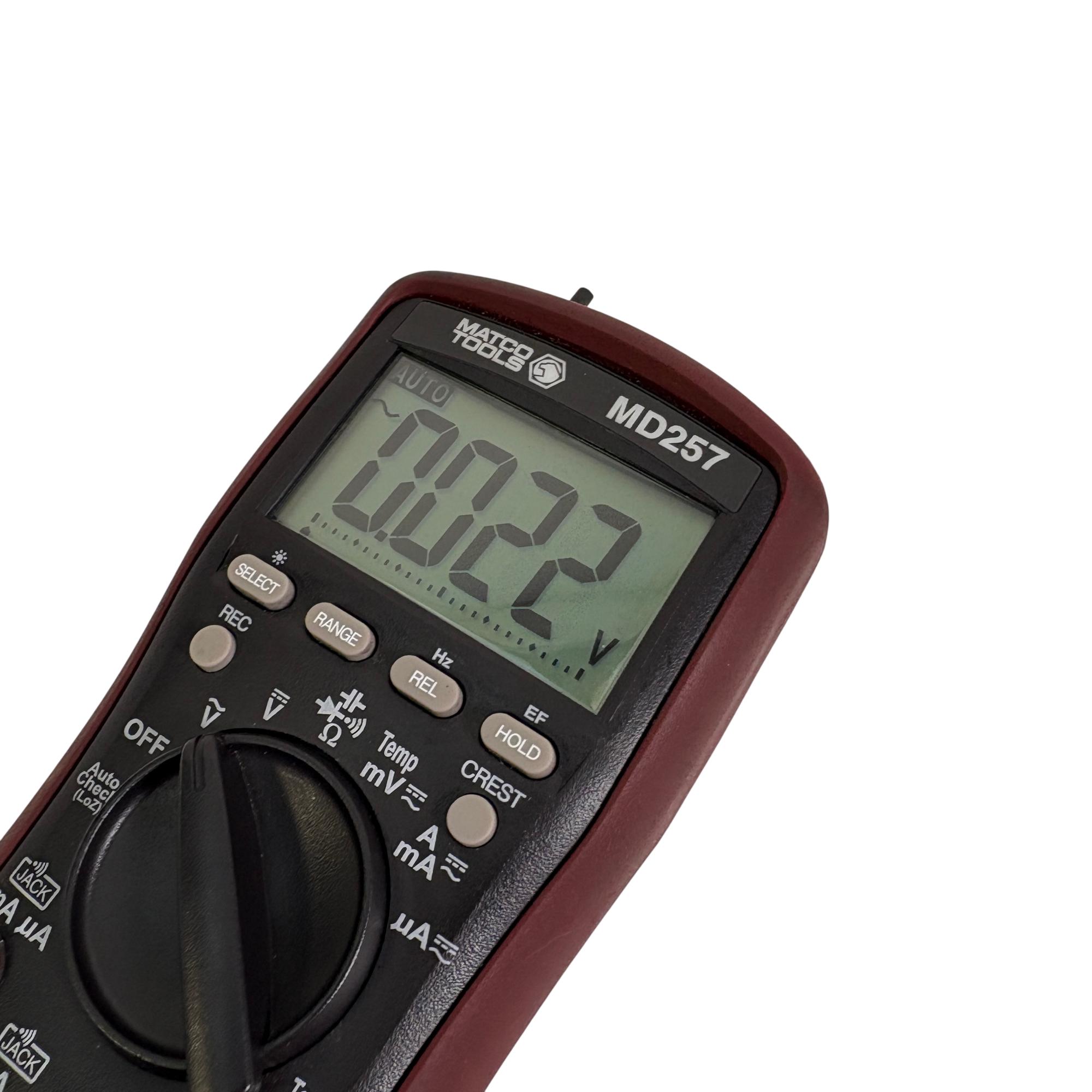Matco Tools Digital Multimeter MD257 is a professional-grade electronic measuring instrument designed for precise voltage, current, and resistance testing. It features a rugged black and red design with multiple function buttons, a clear digital display, and heavy-duty test leads, making it suitable for automotive and industrial applications. This device supports high measurement categories up to CAT IV 600V, ensuring reliable performance in demanding electrical environments.