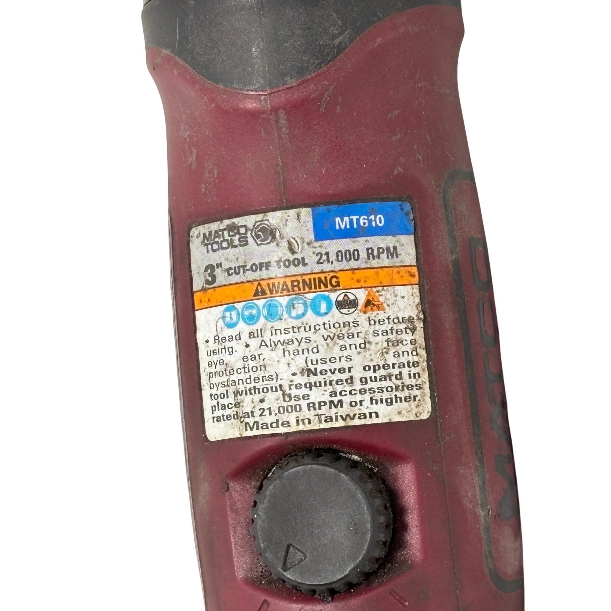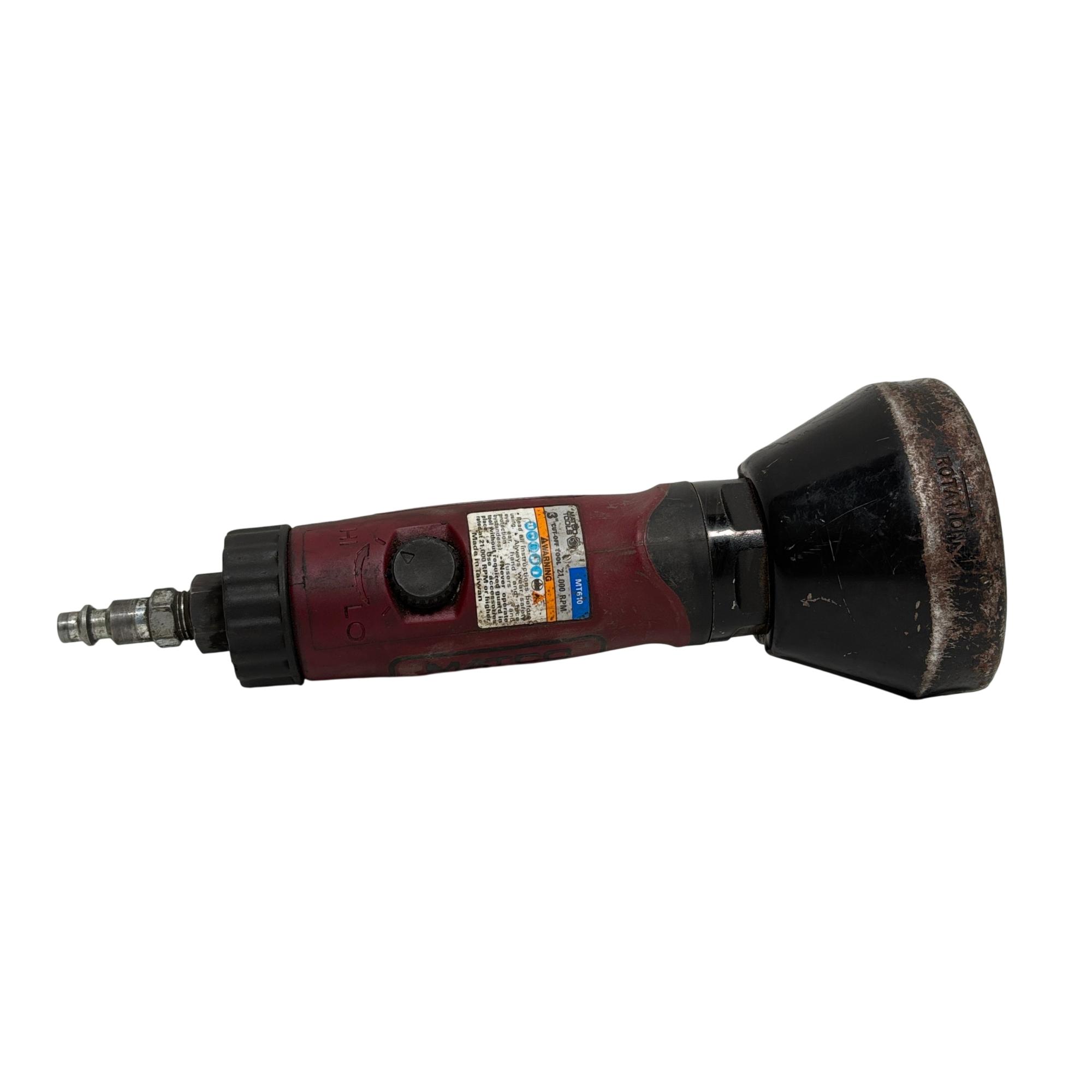 Matco Tools MT610 0.5 HP 3" Air Cut Off Tool delivers precision cutting with its powerful 0.5 horsepower motor and compact 3-inch wheel size. Engineered for durability and efficiency, this pneumatic tool offers a 90-degree angle design that enhances control and accessibility in tight spaces. Ideal for professional use, it combines robust metal construction with an ergonomic black and red handle for comfortable operation.