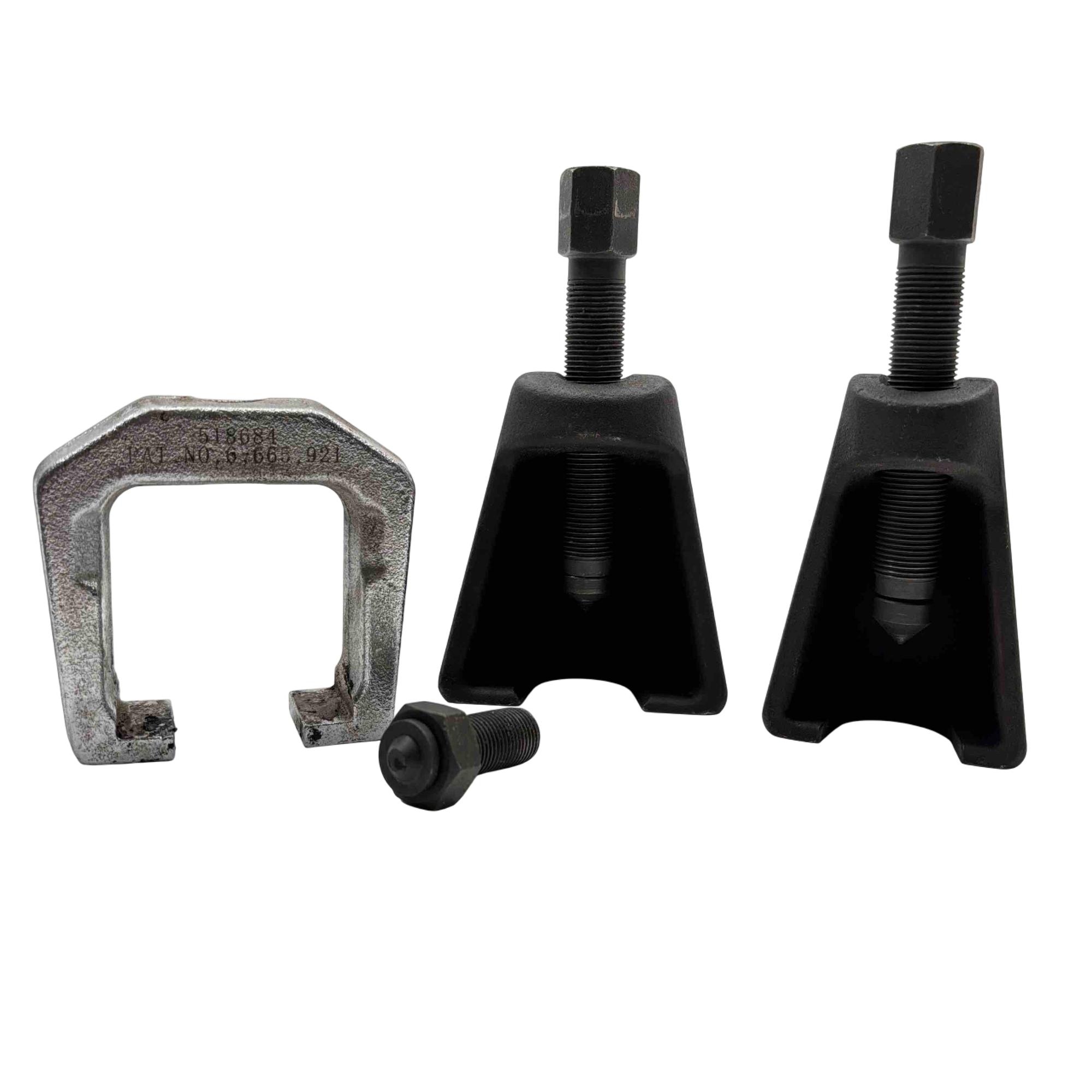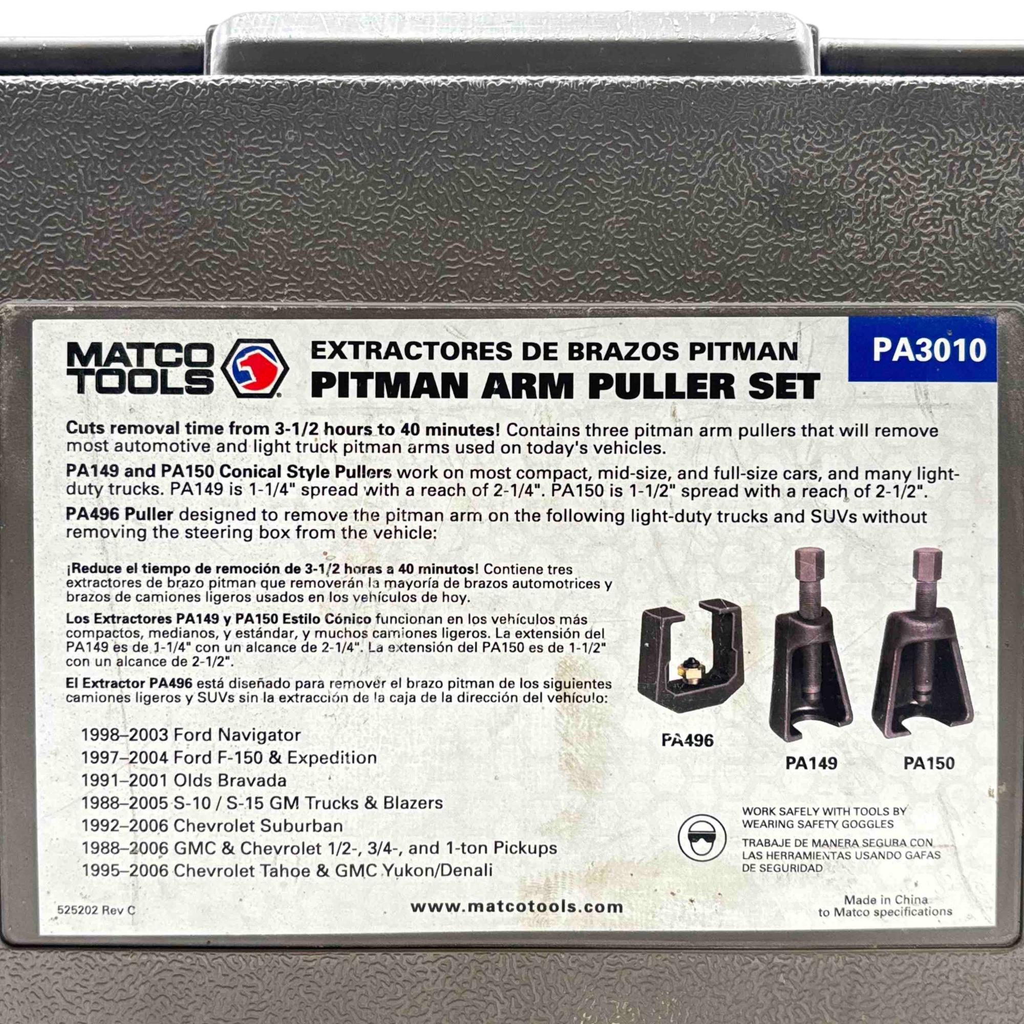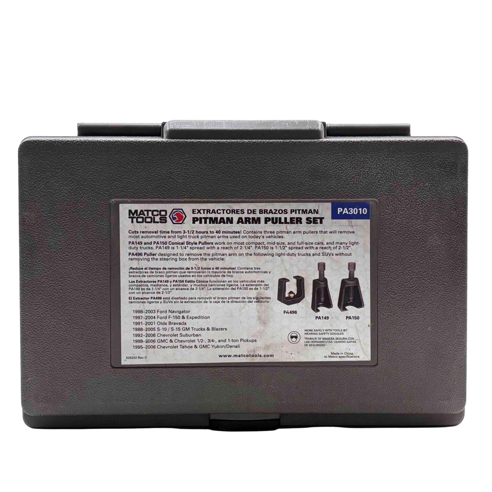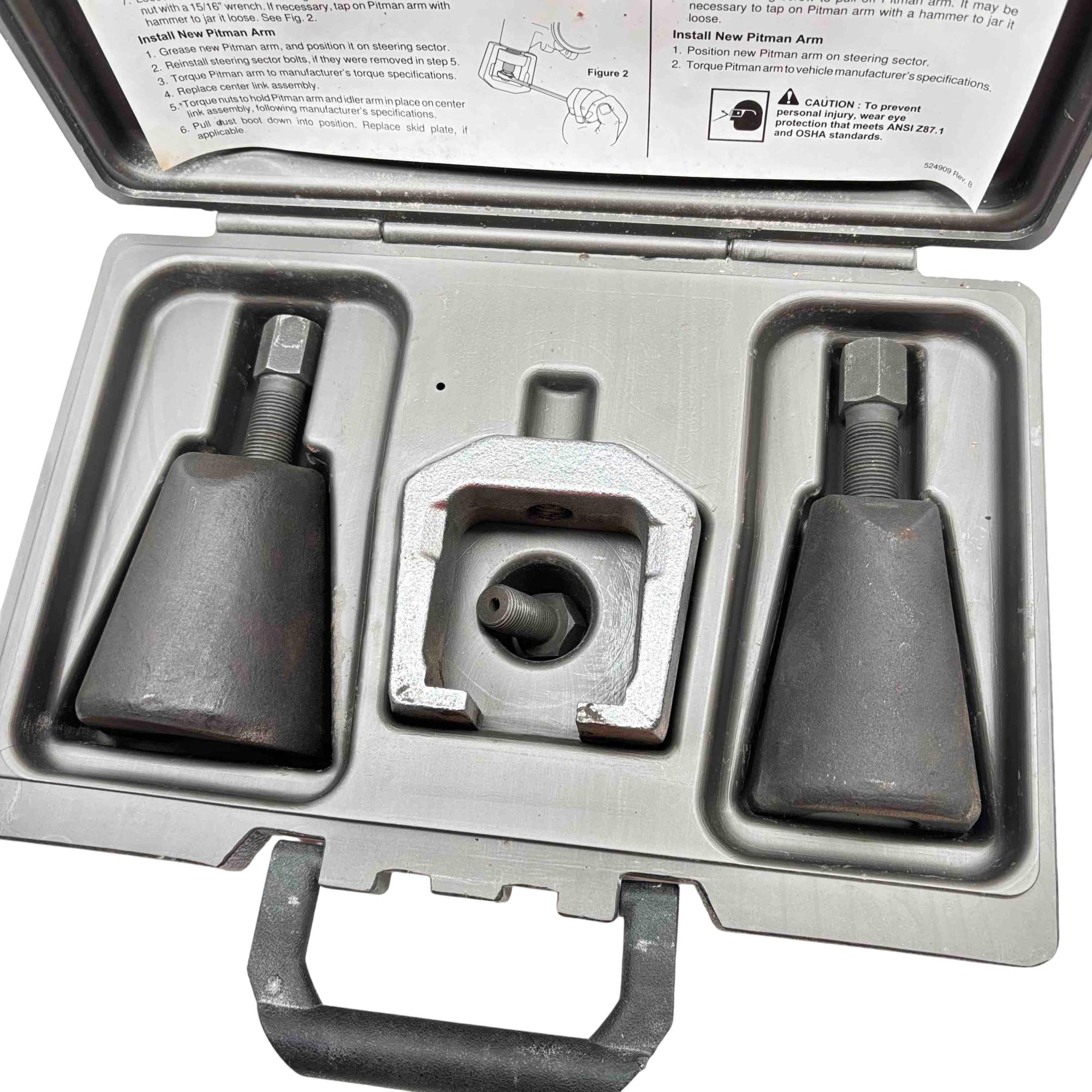 Includes three specialized Pitman arm pullers designed to remove most automotive and light truck Pitman arms. The set features an open puller specifically engineered for accessing and removing Pitman arms in tight or low-clearance areas commonly found on light trucks and SUVs. This set is crafted to provide effective solutions for a range of vehicle maintenance tasks involving steering system components.