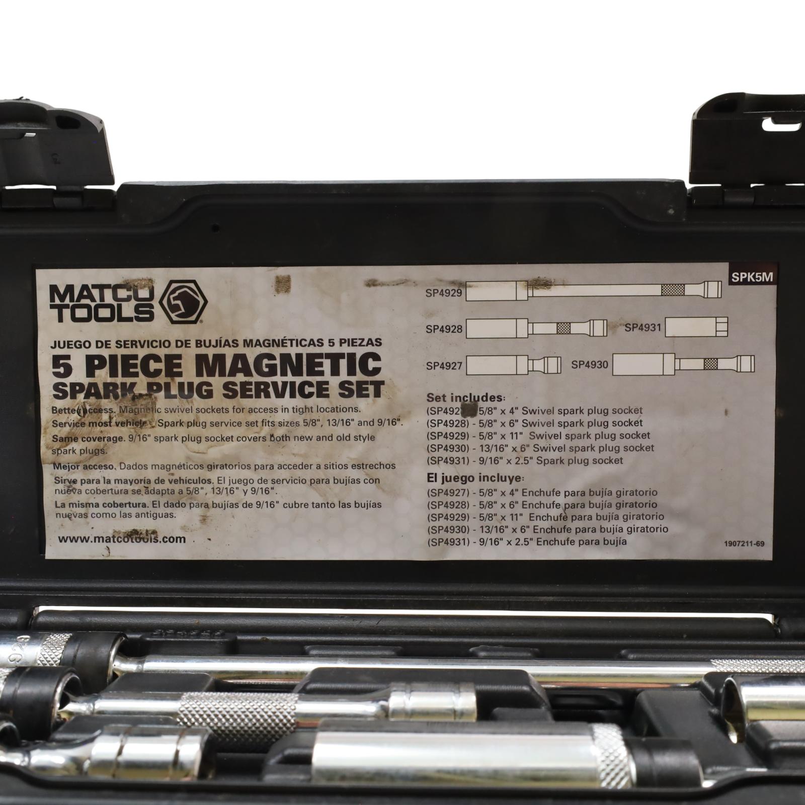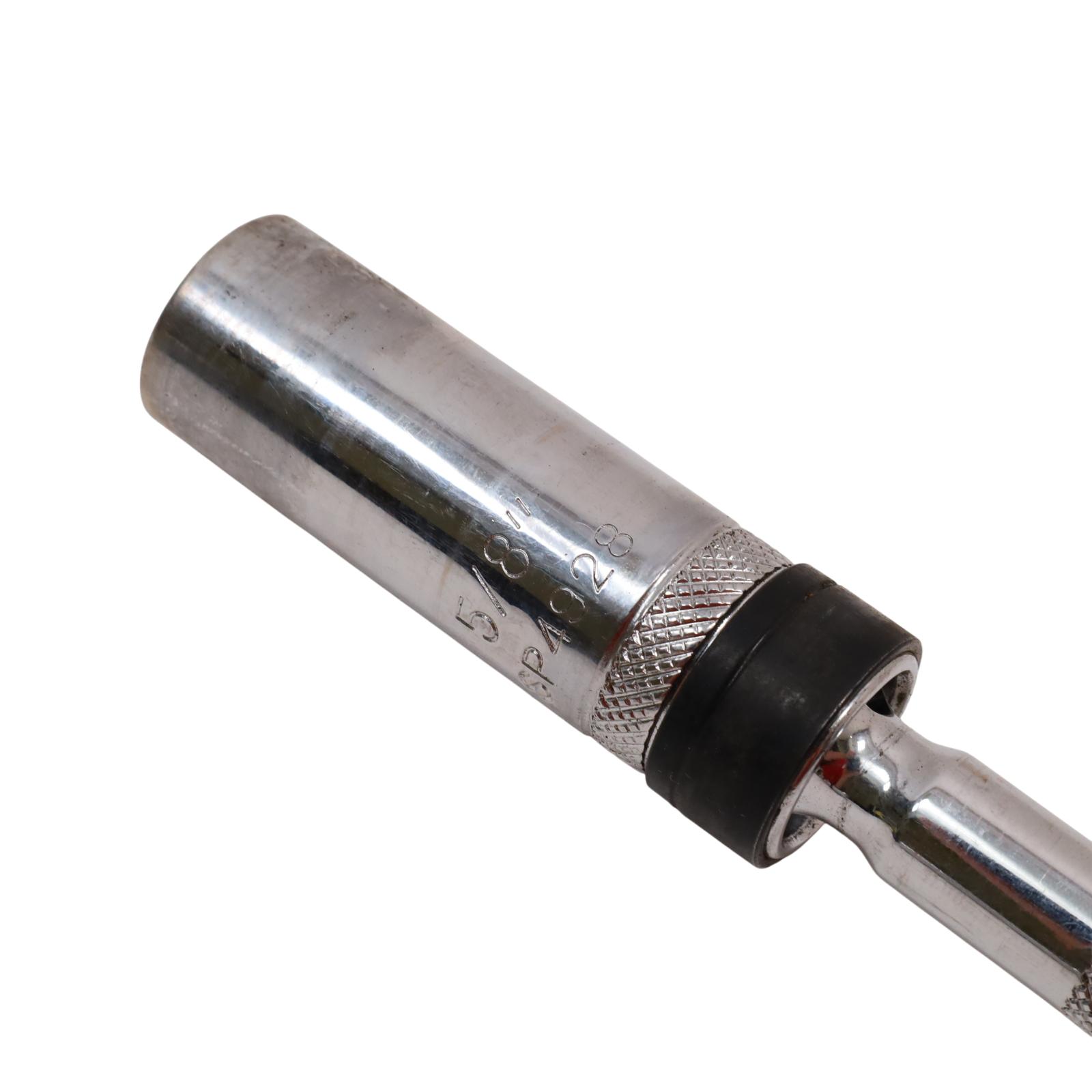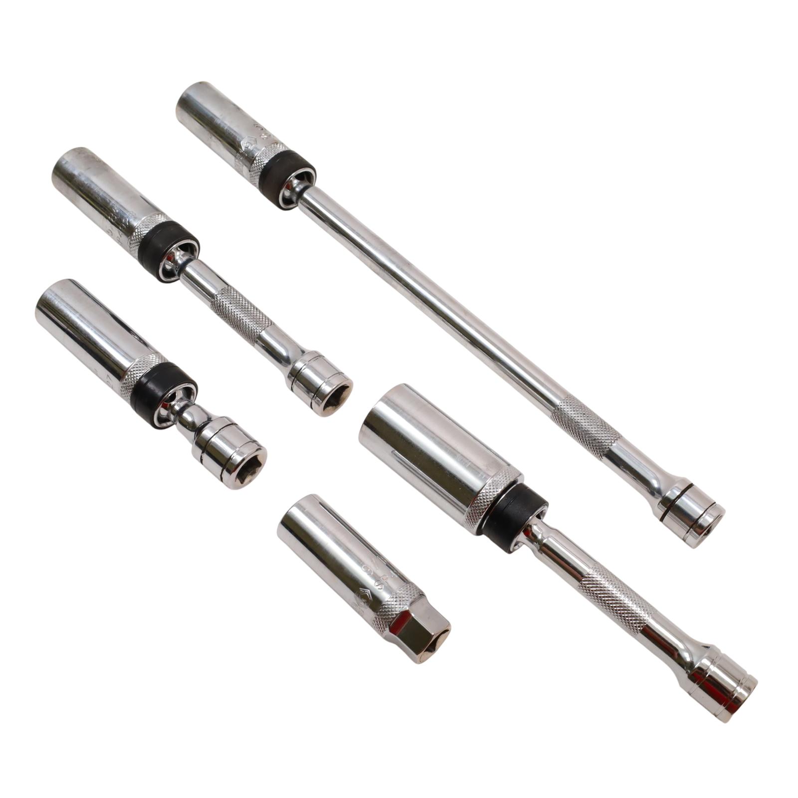 Includes magnetic swivel sockets designed to provide easy access in tight spaces. It covers common spark plug sizes of 5/8", 13/16", and 9/16", with the 9/16" socket accommodating both new and old style spark plugs. Built with a 3/8" drive size, these chrome 6-point sockets offer secure engagement and reliable durability, while the magnetic feature helps hold plugs firmly in place during installation or removal. This set is SAE measured and well-suited for efficient spark plug service.