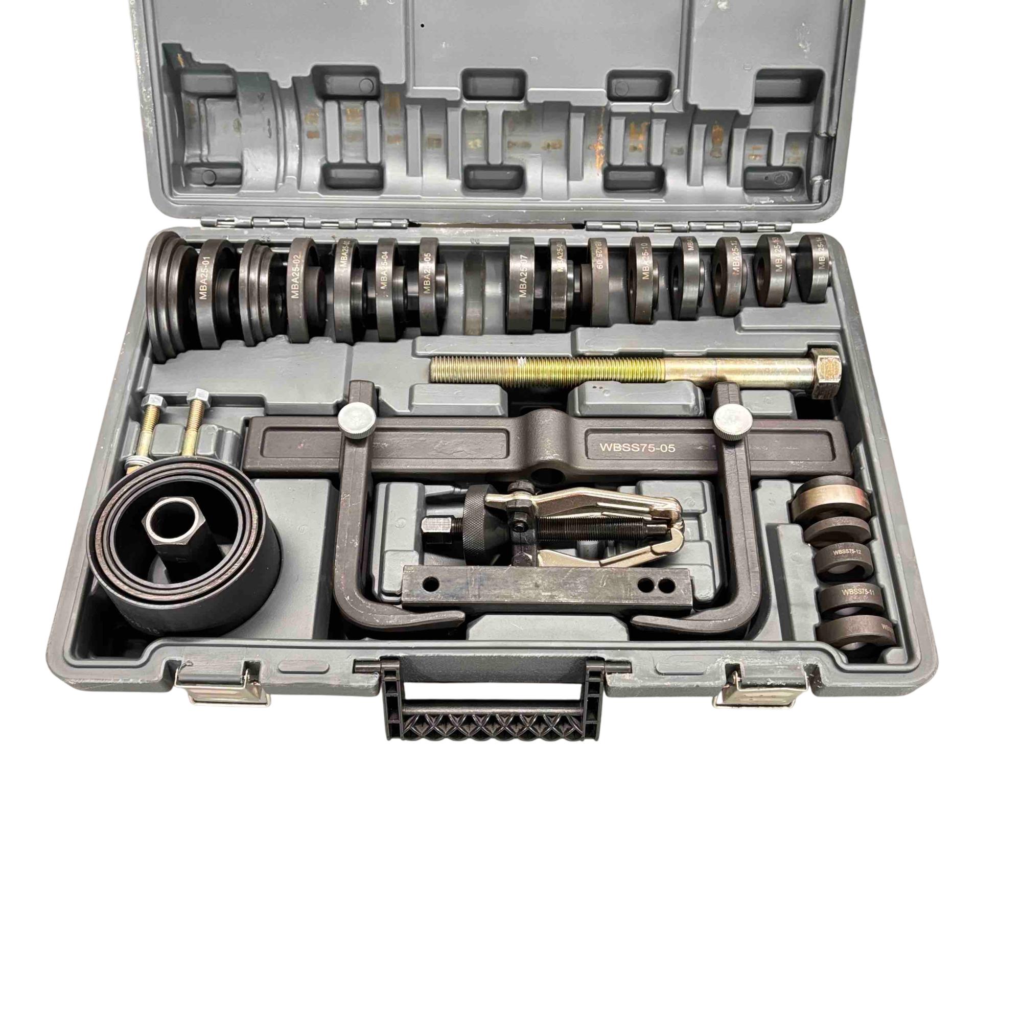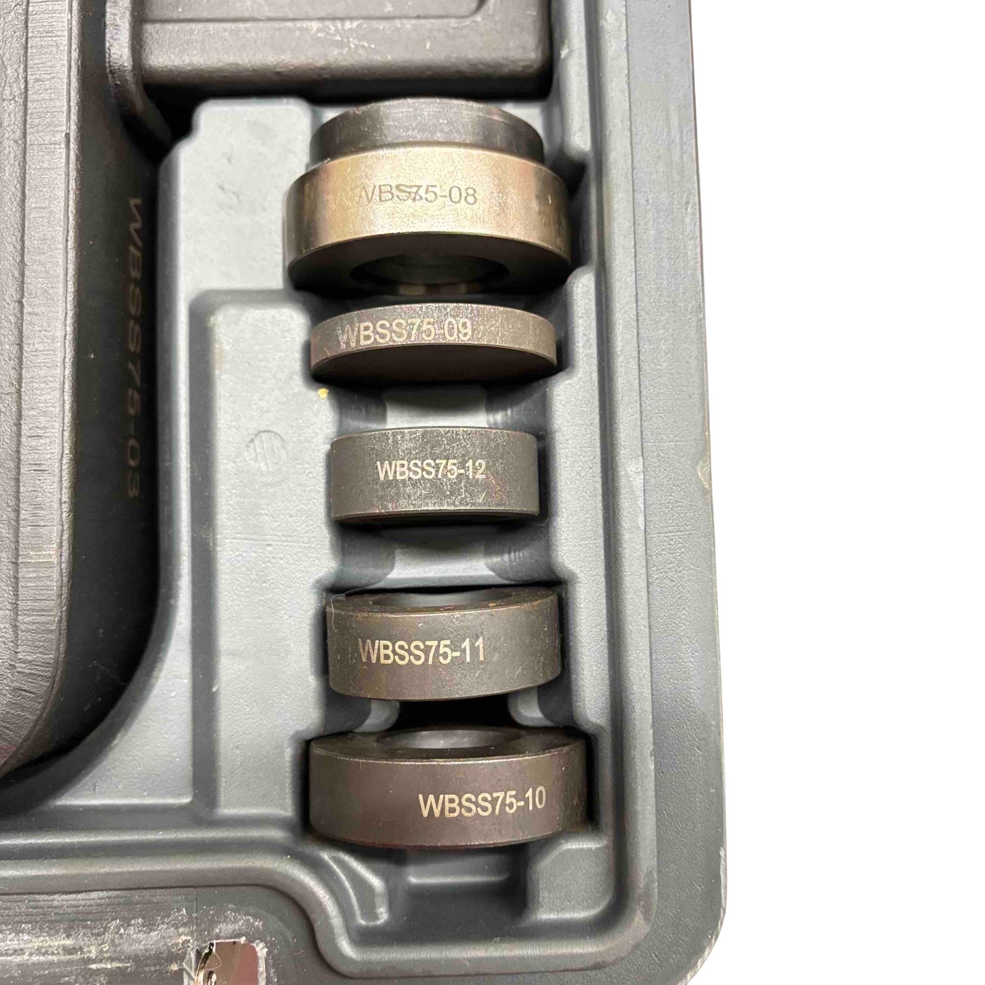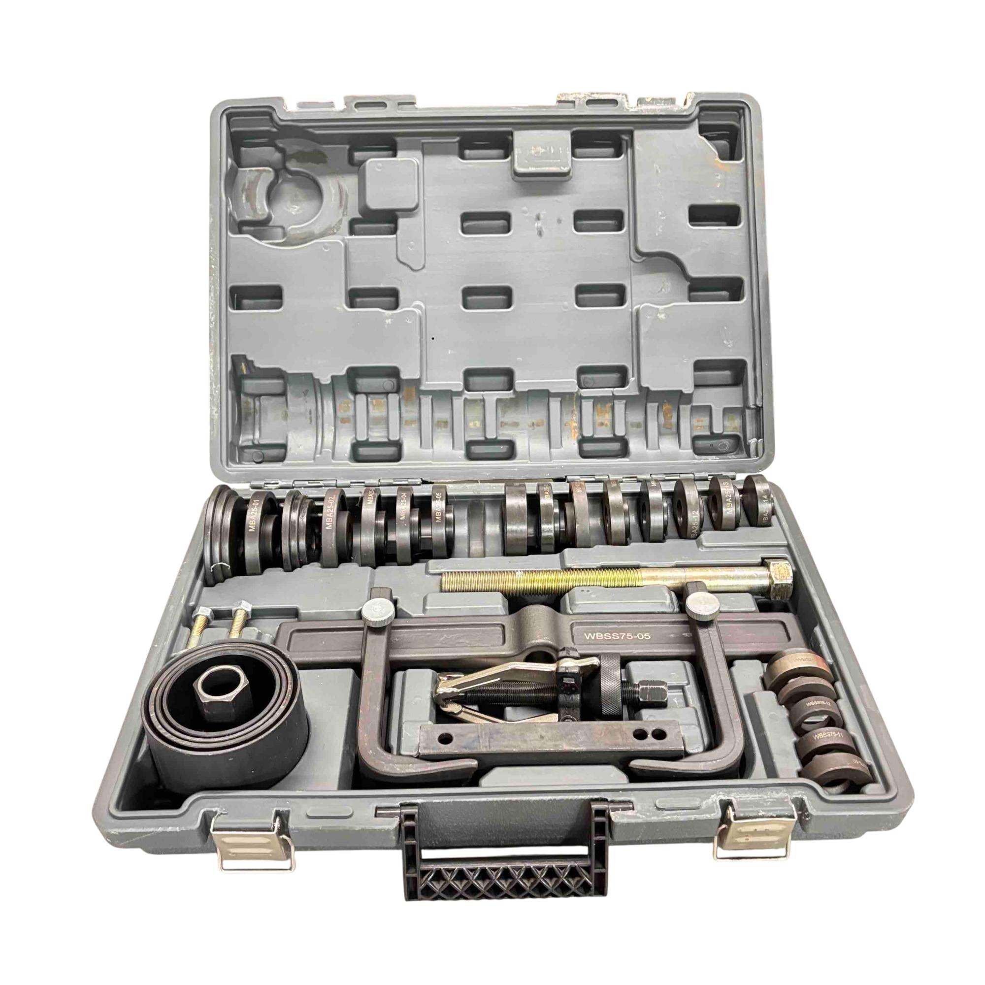 Upgrade your automotive toolkit with the Matco WBSS75 Wheel Bearing Tool Set, a must-have for any car enthusiast or professional mechanic. This comprehensive set includes durable metal discs and bolts, all neatly organized in a sturdy plastic case. It's designed for ease of use and ensures precision and efficiency when working on wheel bearings. In great condition, this tool set offers both quality and reliability for all your mechanical needs.