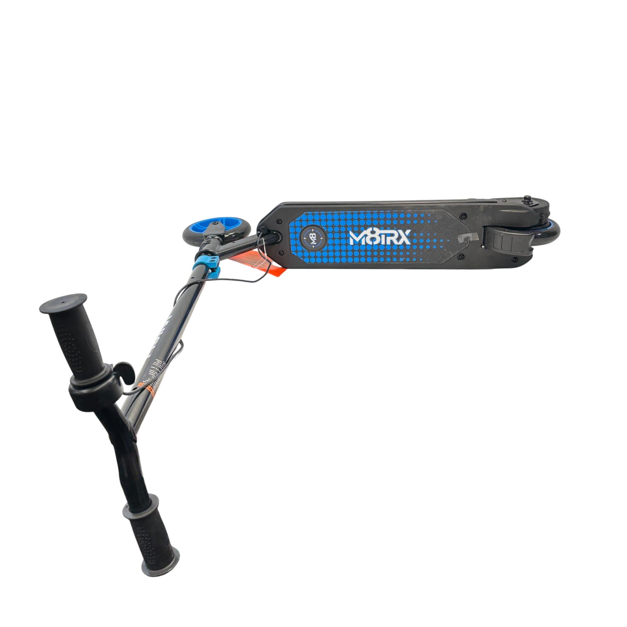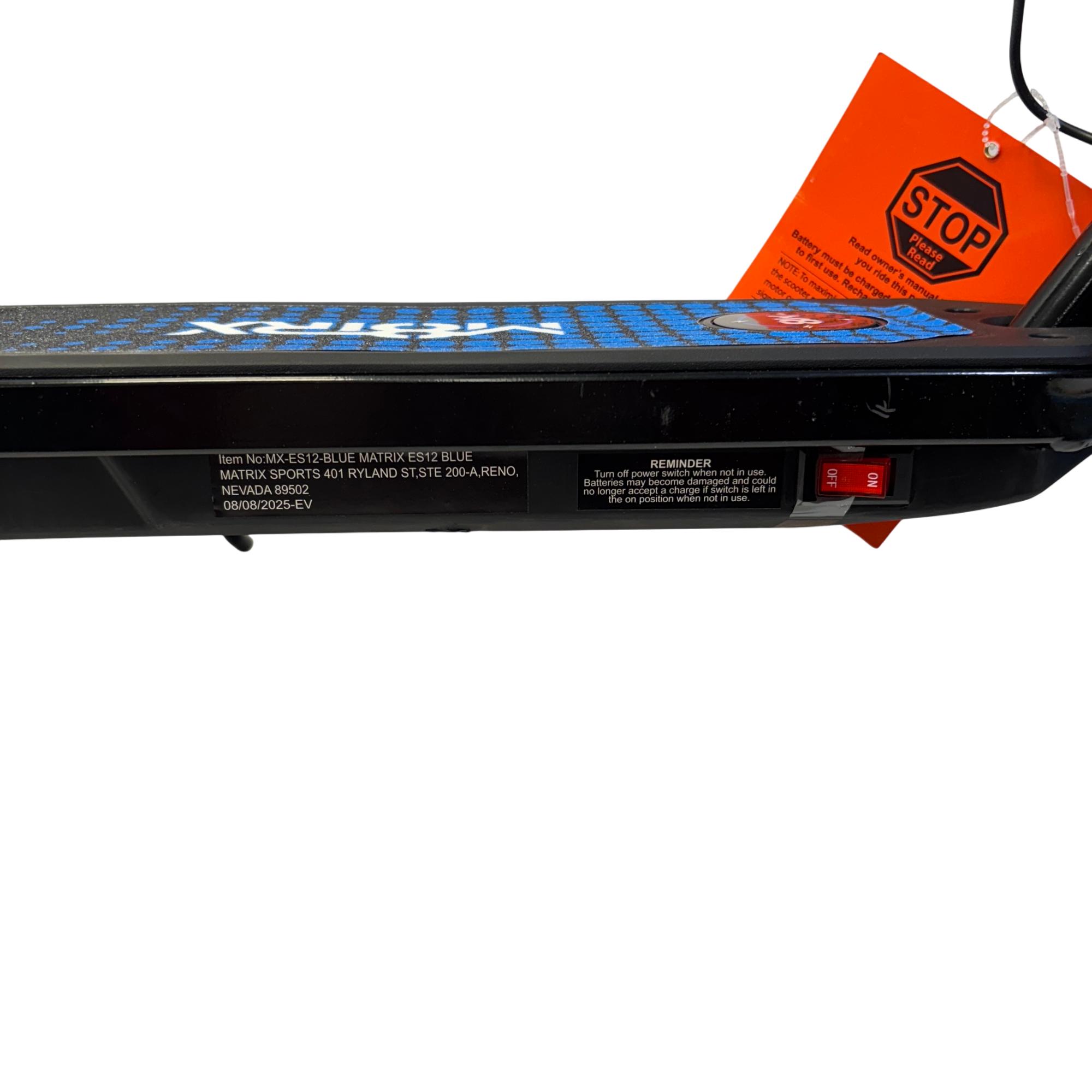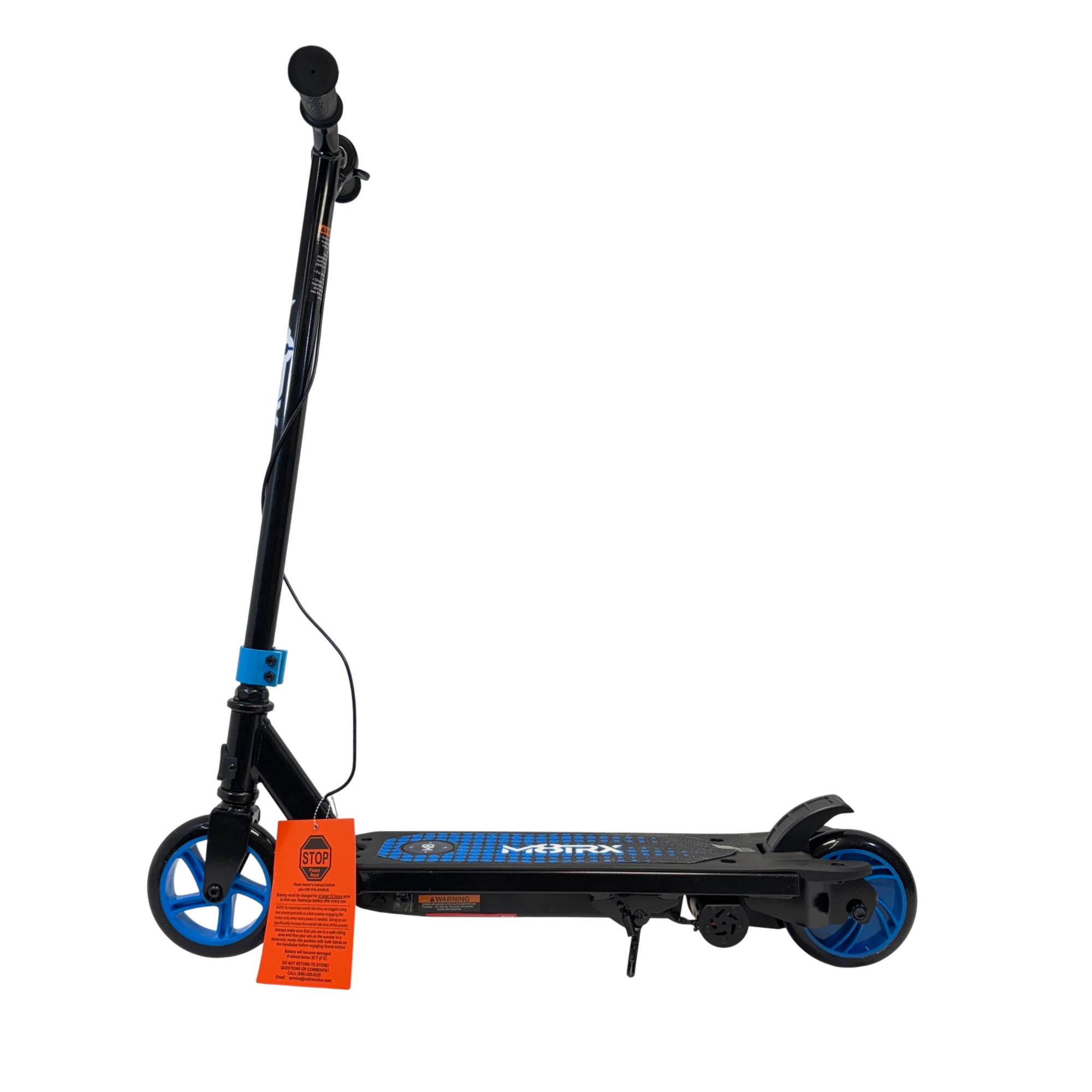 The Matrix 12 Volt Electric Scooter features a sturdy black and blue design with adjustable handlebars, making it suitable for both adults and teens. This electric scooter is equipped with durable wheels and a reliable 12-volt motor to provide an efficient and smooth ride, ideal for urban transportation and outdoor activities.