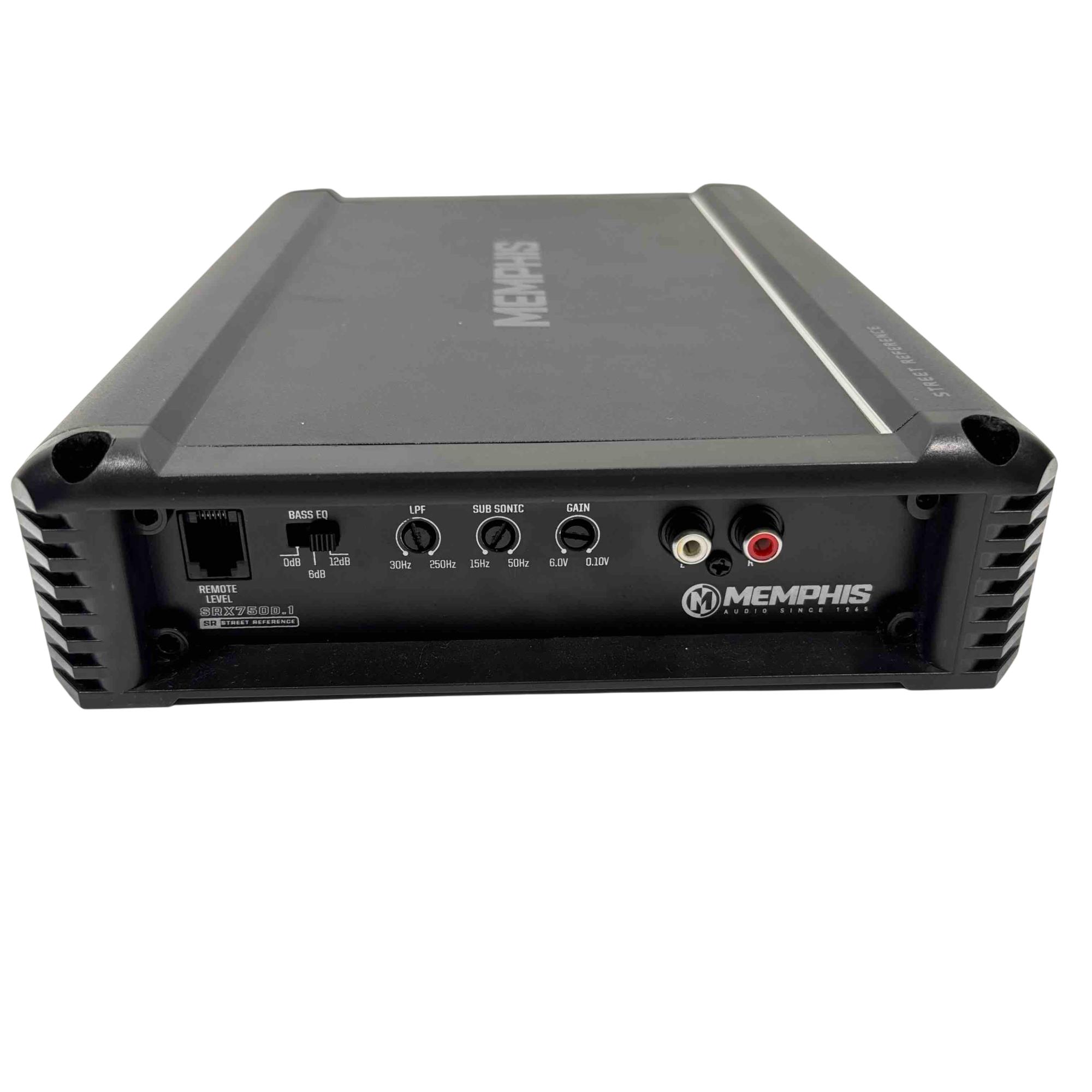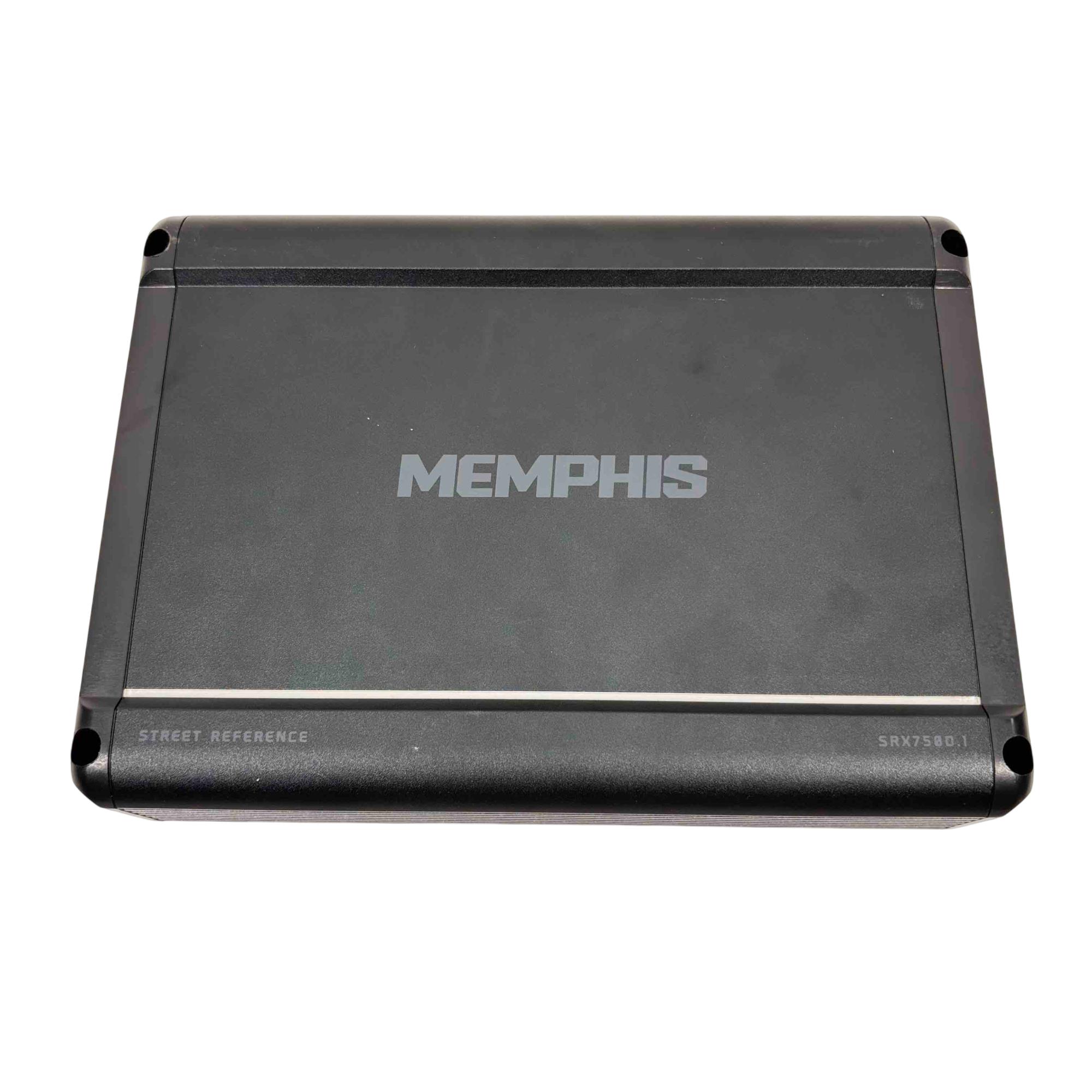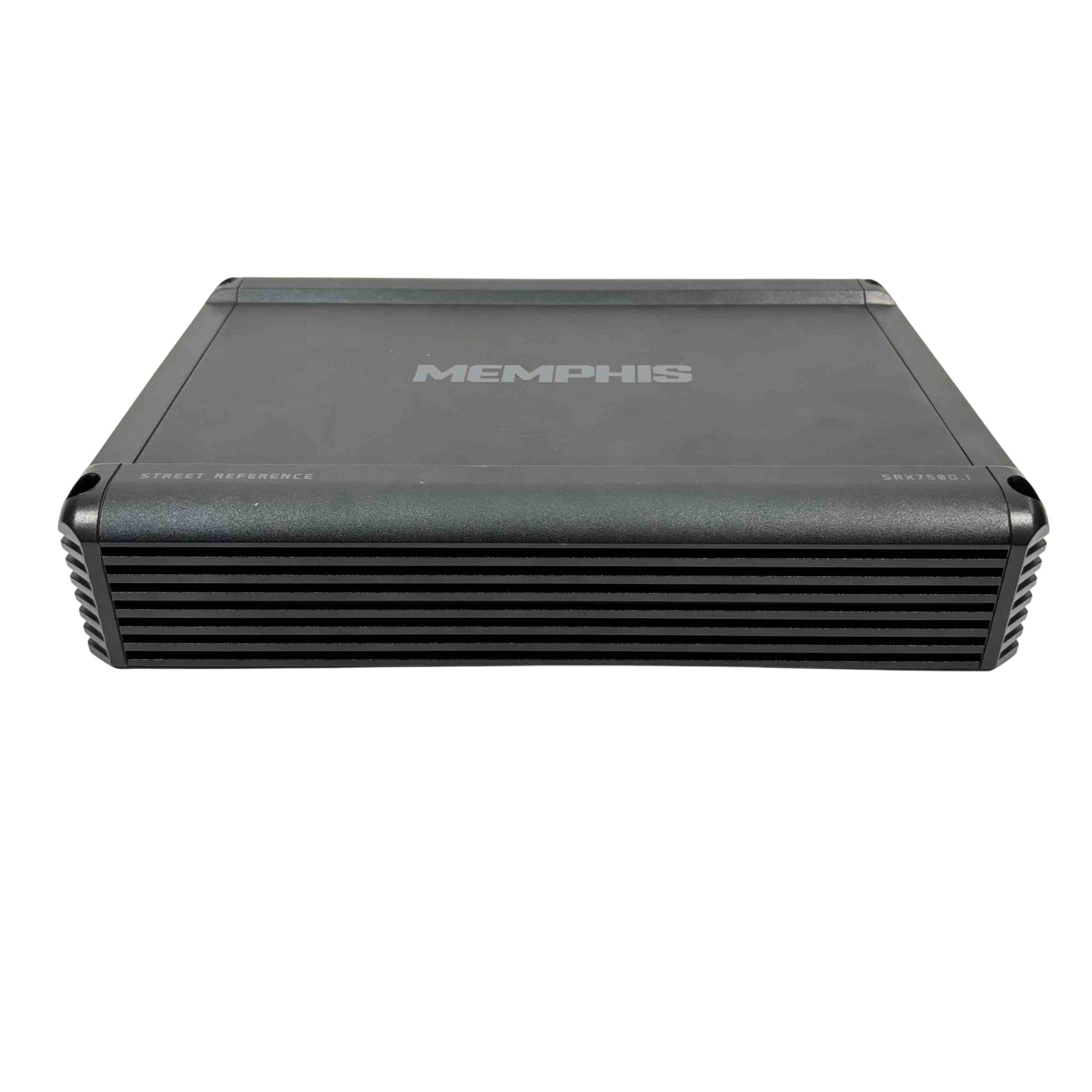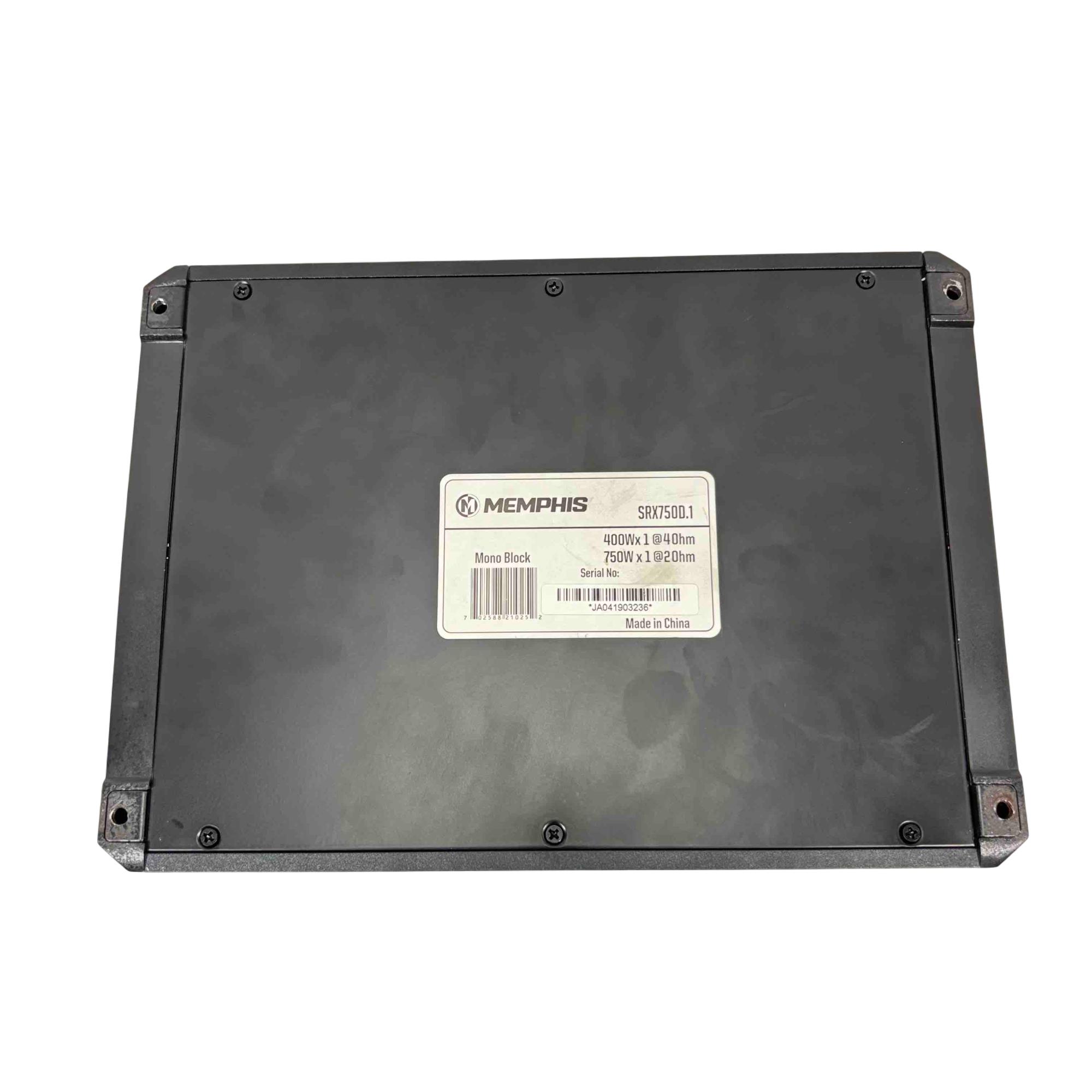 Memphis Street Reference SRX750D.1 Mono Car Amplifier delivers 750 watts of power with a sleek black rectangular design featuring a white border and clear branding. This high-performance amplifier is designed for car audio enthusiasts seeking robust, mono-channel amplification with precise sound quality and durable construction.