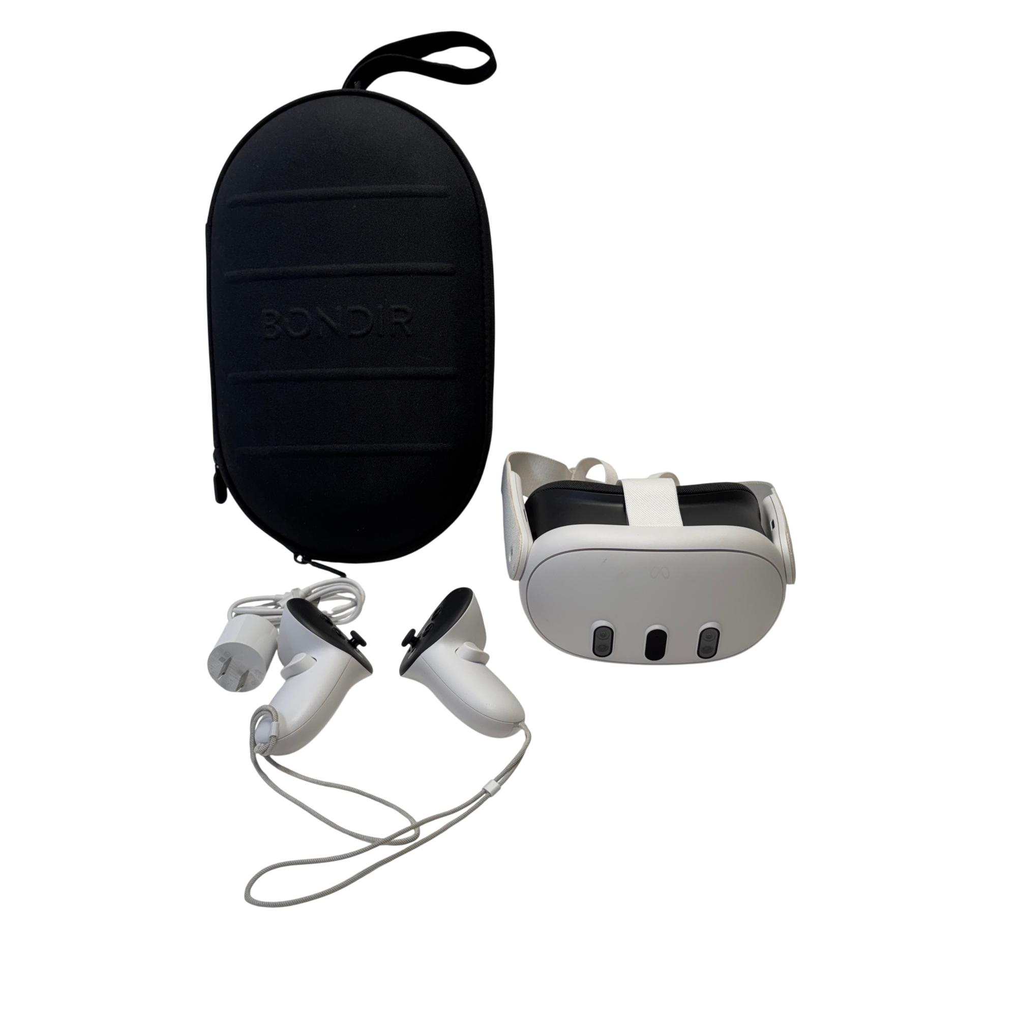 The Meta Quest 3 VR Headset offers an immersive wireless virtual reality experience with advanced display and ergonomic design for comfort during extended use. Paired with precise touch controllers, it delivers intuitive and responsive control for gaming and interactive applications. The included BONDIR carrying case provides secure storage and portability, making it convenient to transport the VR system safely.
