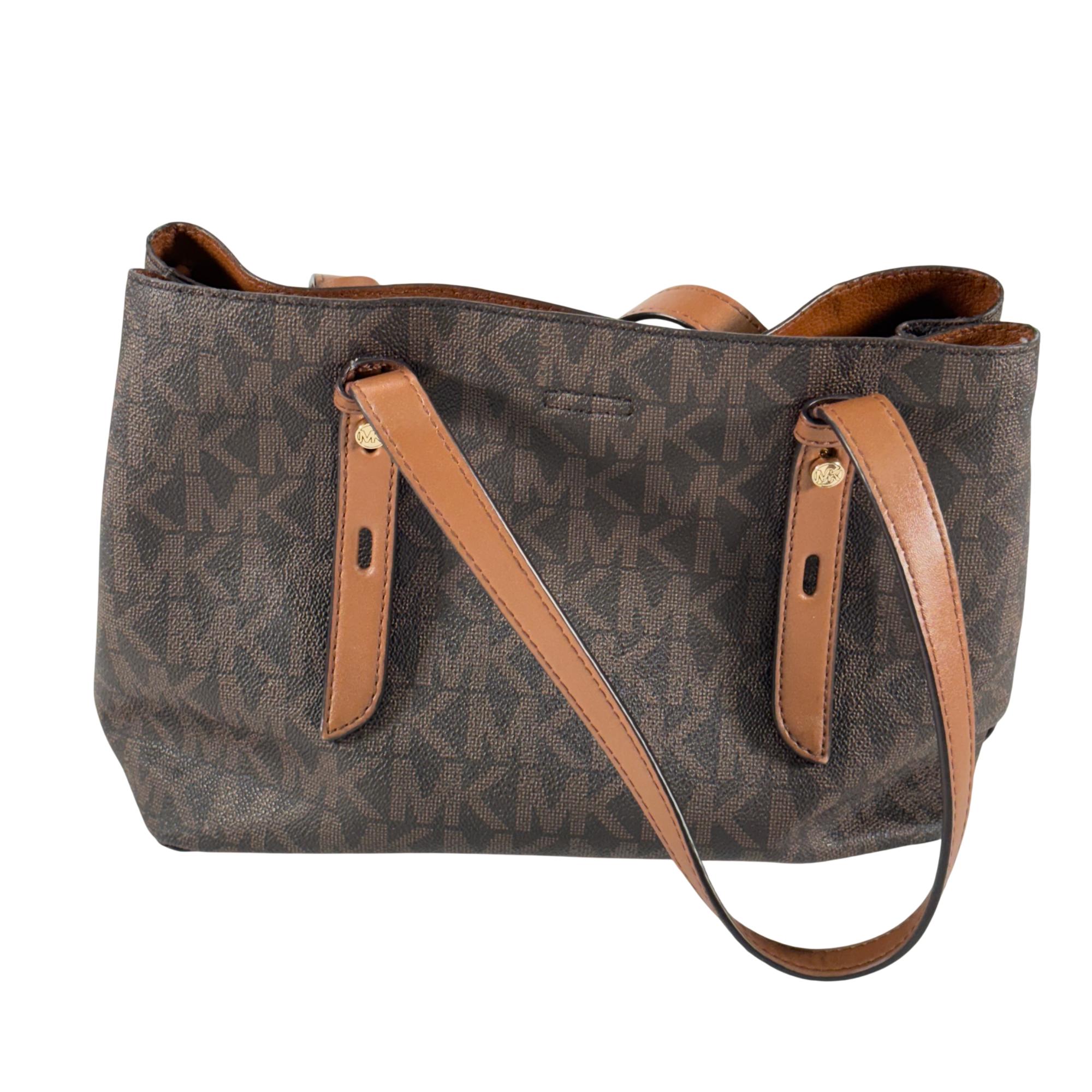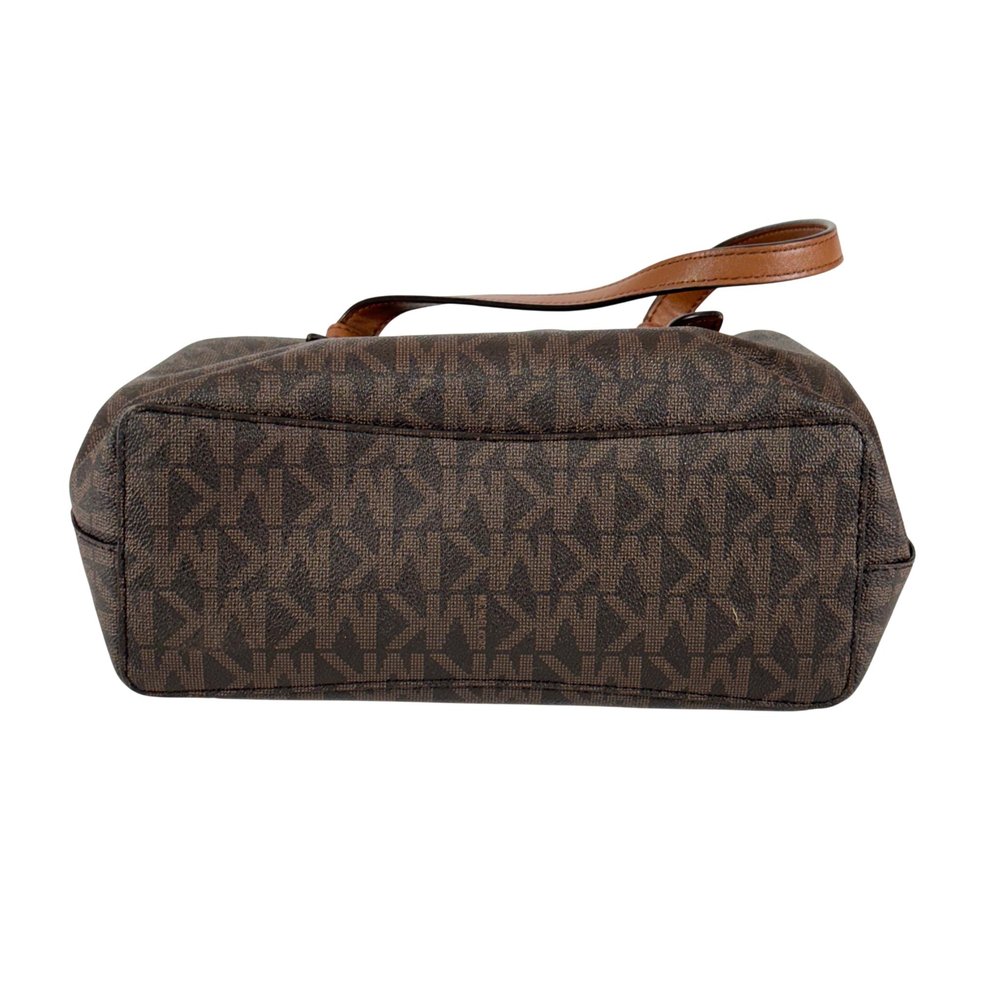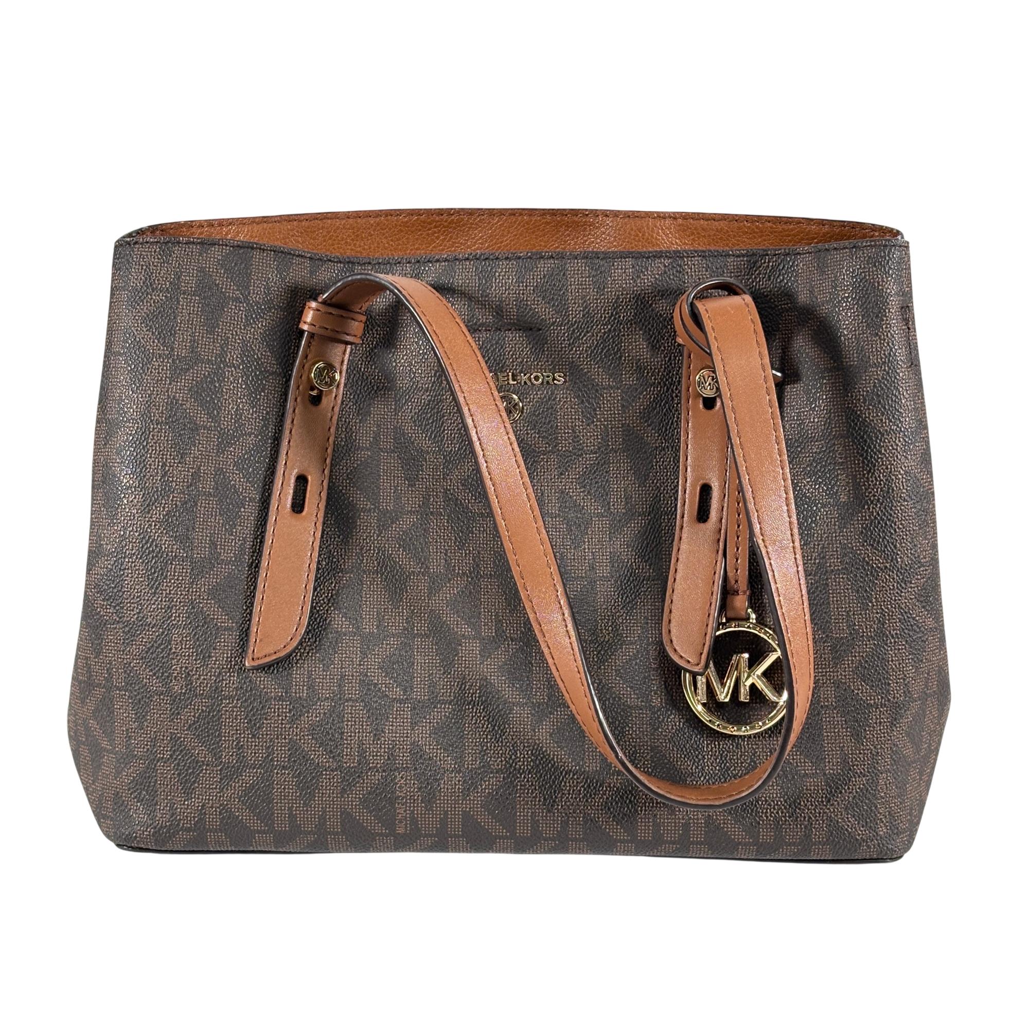 Michael Kors Mel Small Signature Logo Tote Bag is a stylish and practical tote crafted from logo-print canvas with gold-tone hardware accents. It features a snap closure, a center zip pocket, and an interior lined in polyester for organized storage. The bag includes a handle with a 7.5" drop and an adjustable strap for versatile carrying options, measuring 11.75”W x 8.25”H x 4.25”D. Its sleek design and durable construction make it perfect for everyday use.