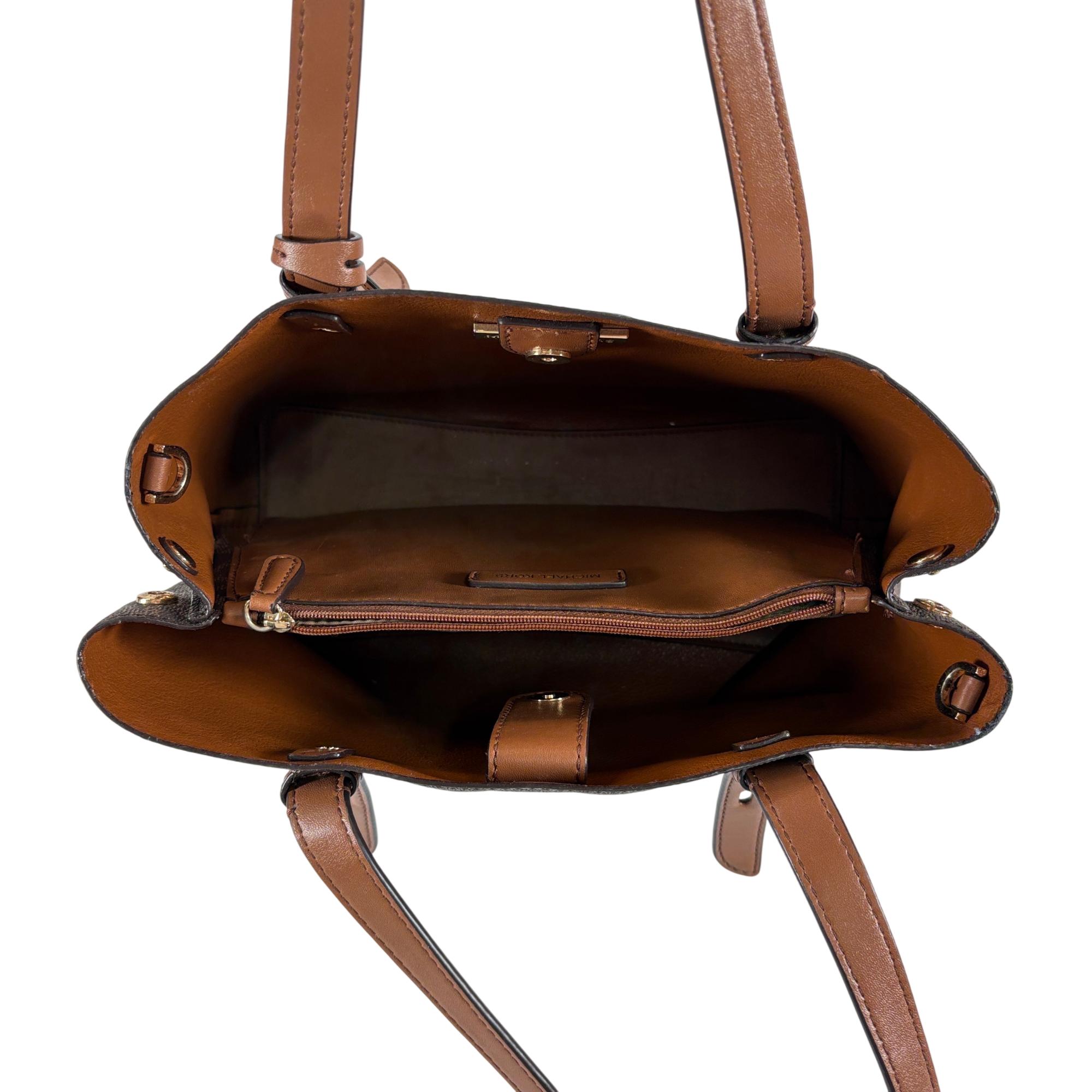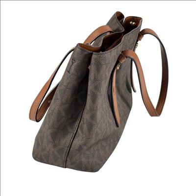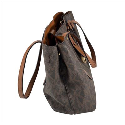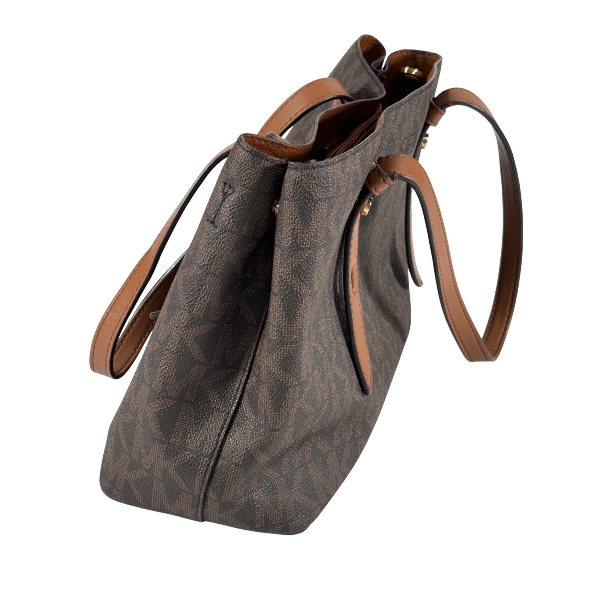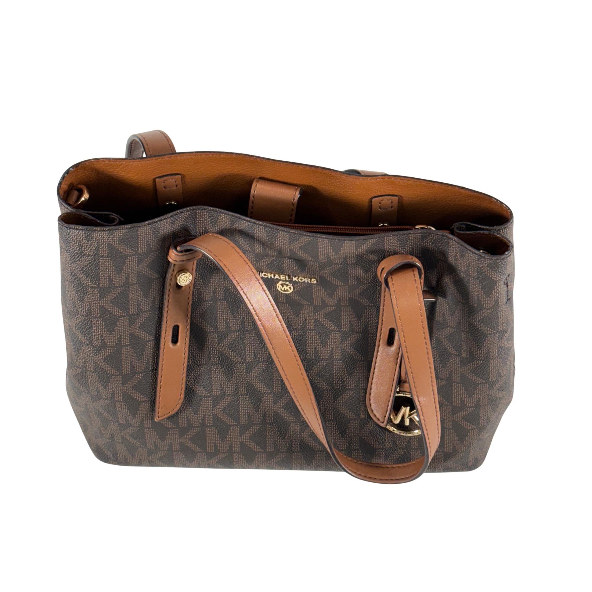 Michael Kors Mel Small Signature Logo Tote Bag is a stylish and practical tote crafted from logo-print canvas with gold-tone hardware accents. It features a snap closure, a center zip pocket, and an interior lined in polyester for organized storage. The bag includes a handle with a 7.5" drop and an adjustable strap for versatile carrying options, measuring 11.75”W x 8.25”H x 4.25”D. Its sleek design and durable construction make it perfect for everyday use.
