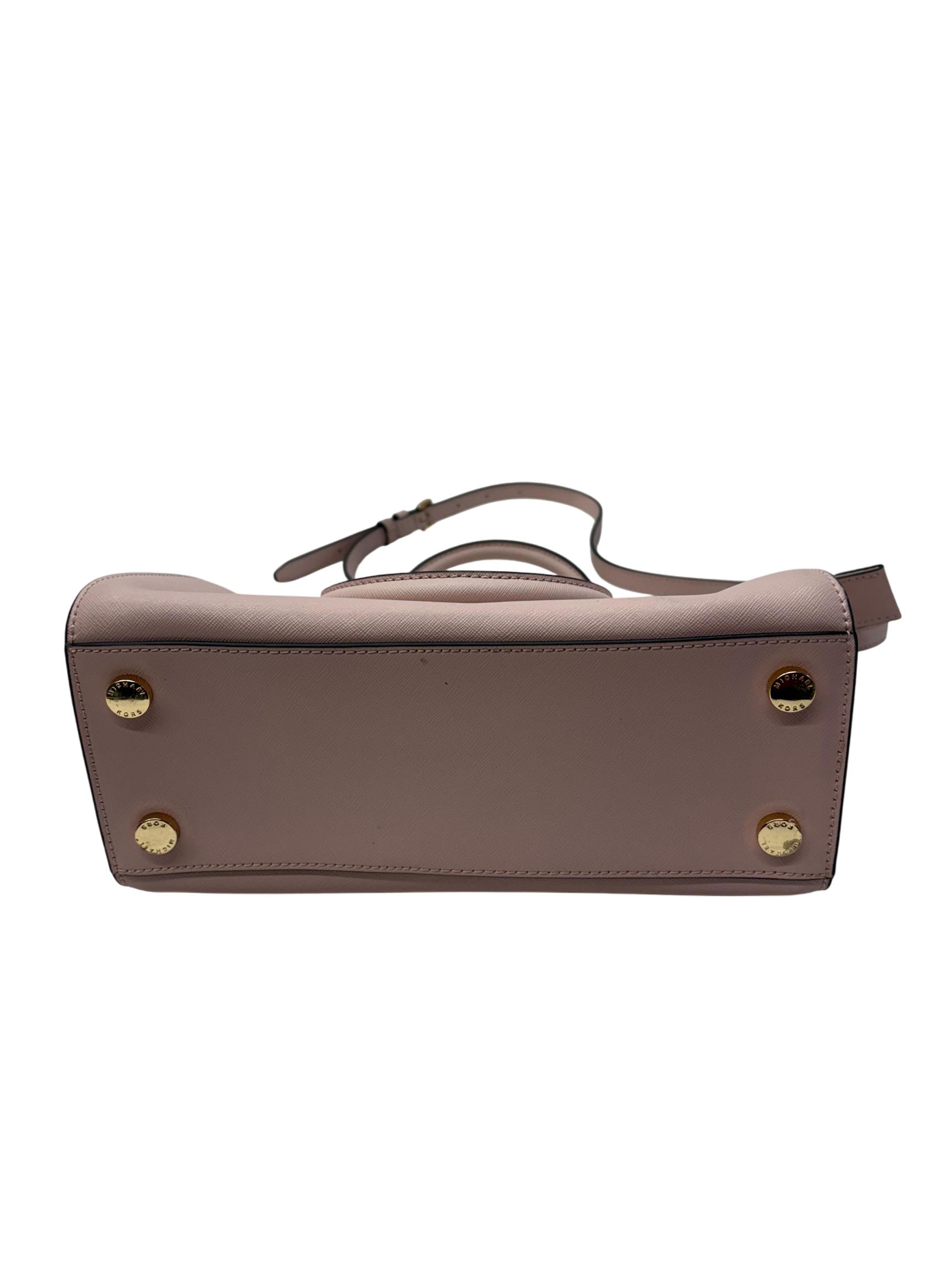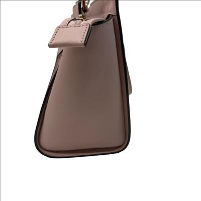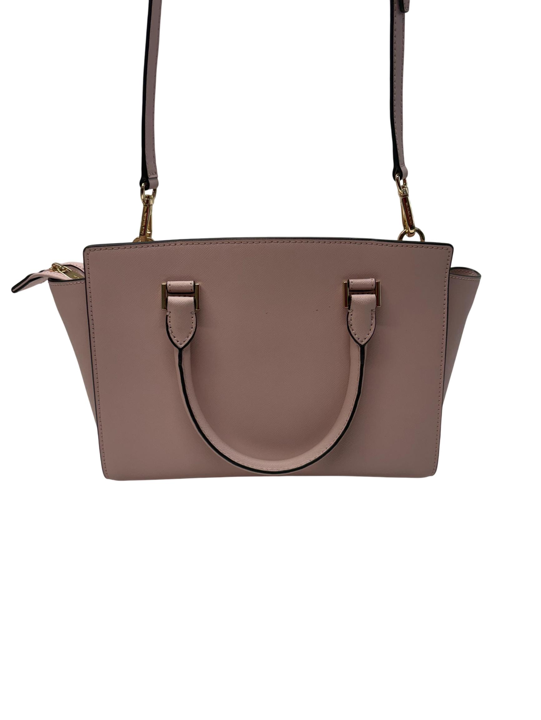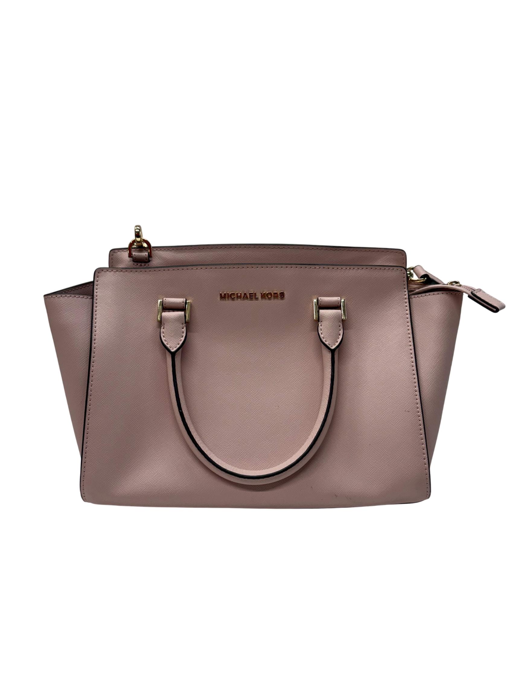 Michael Kors Selma Medium Saffiano Leather Satchel in Blossom Pink features a structured silhouette crafted from durable saffiano leather. This stylish handbag is detailed with gold-tone hardware and a sleek black handle, making it a versatile accessory for everyday fashion. Its medium size offers ample space while maintaining a polished, elegant look perfect for various occasions.