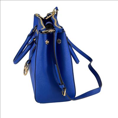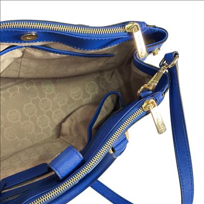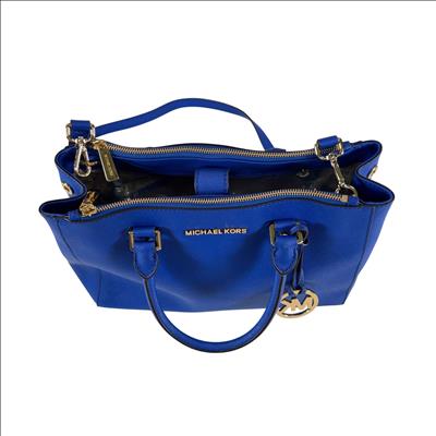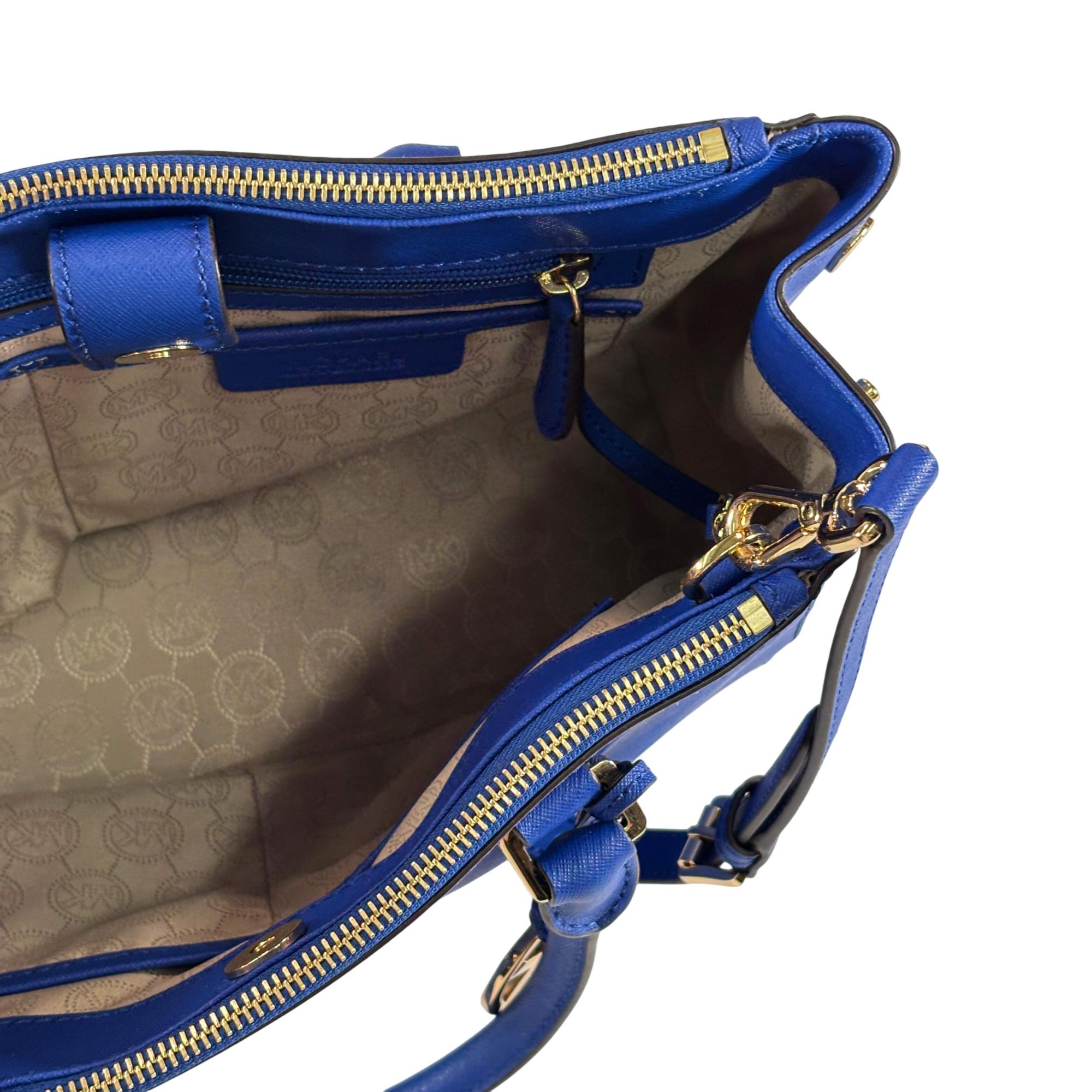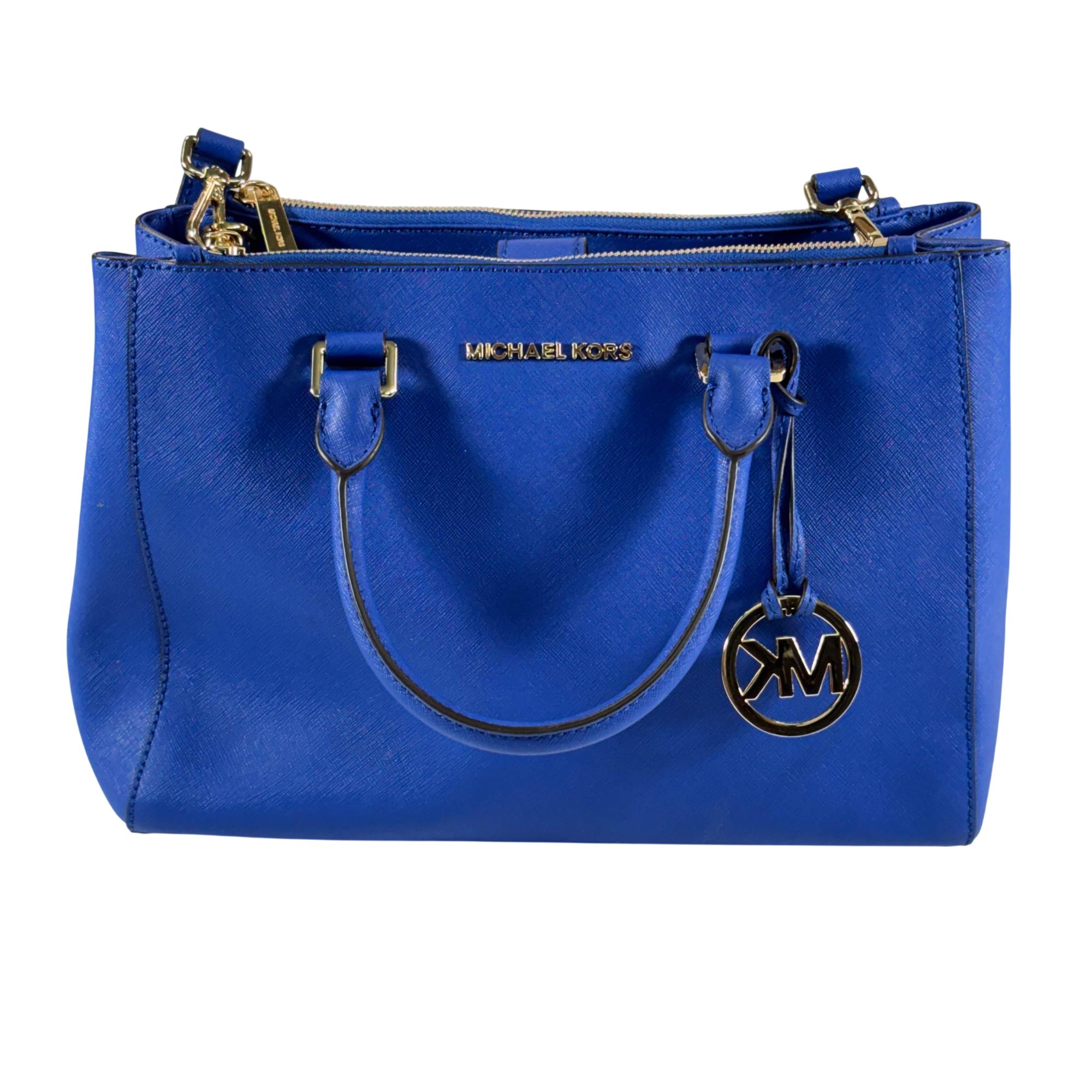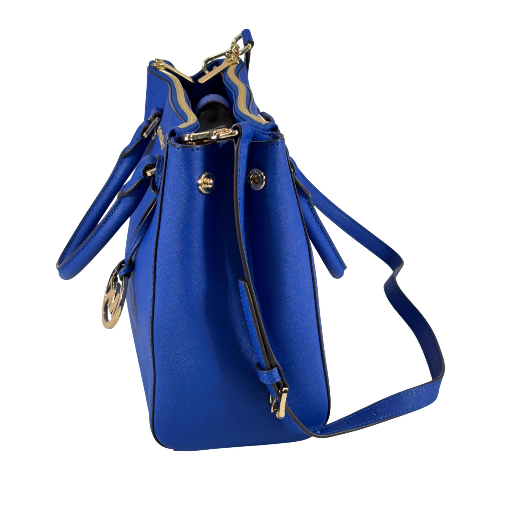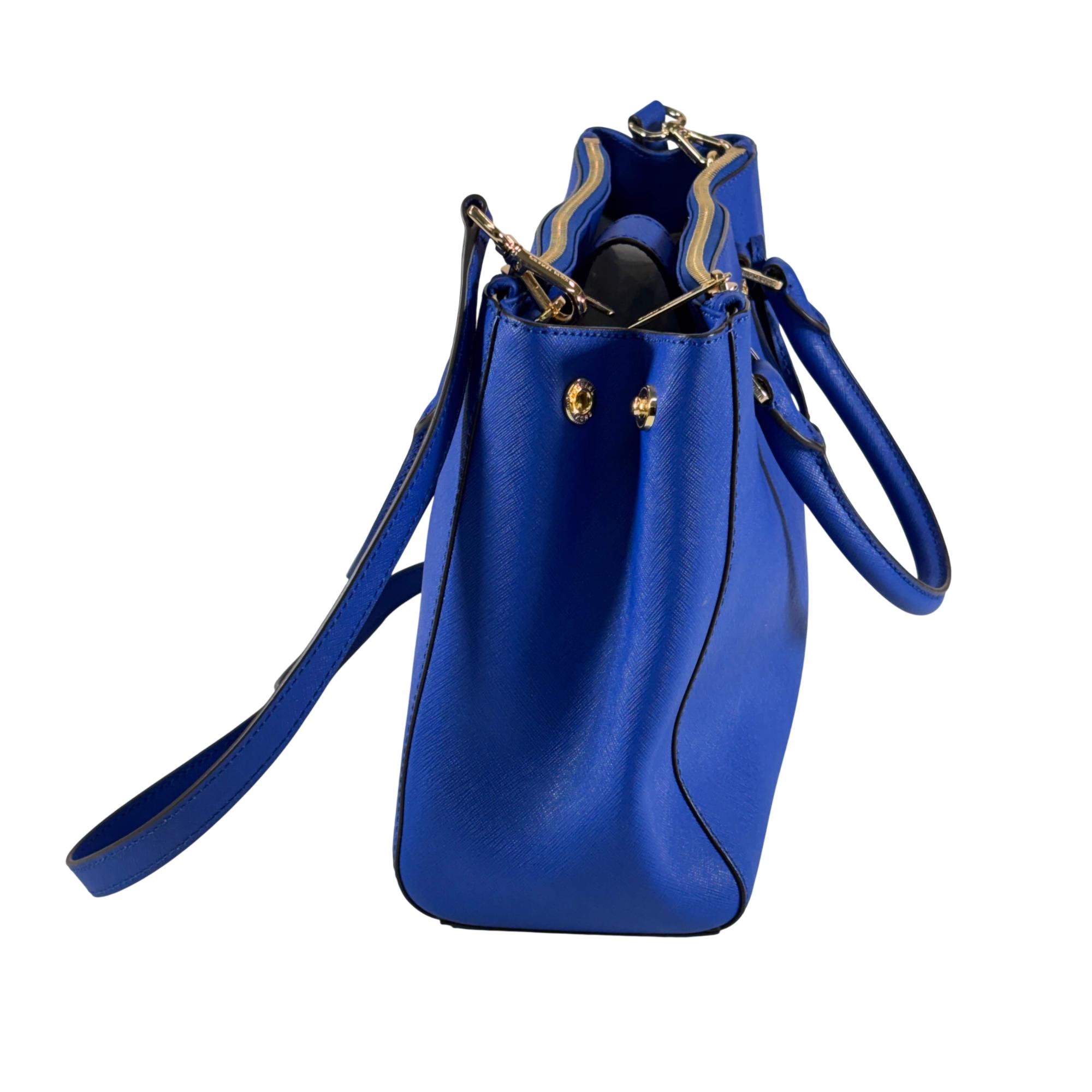 Michael Kors Sutton Saffiano Leather Top Handle Bag – Electric Blue (Model I1503) features a vibrant cobalt blue saffiano leather construction with gold-tone studs and zipper accents. This handbag includes a sturdy top handle and a detailed gold logo that adds a refined touch to its stylish design. Perfect for elevating any outfit, it combines durability with elegant fashion appeal.