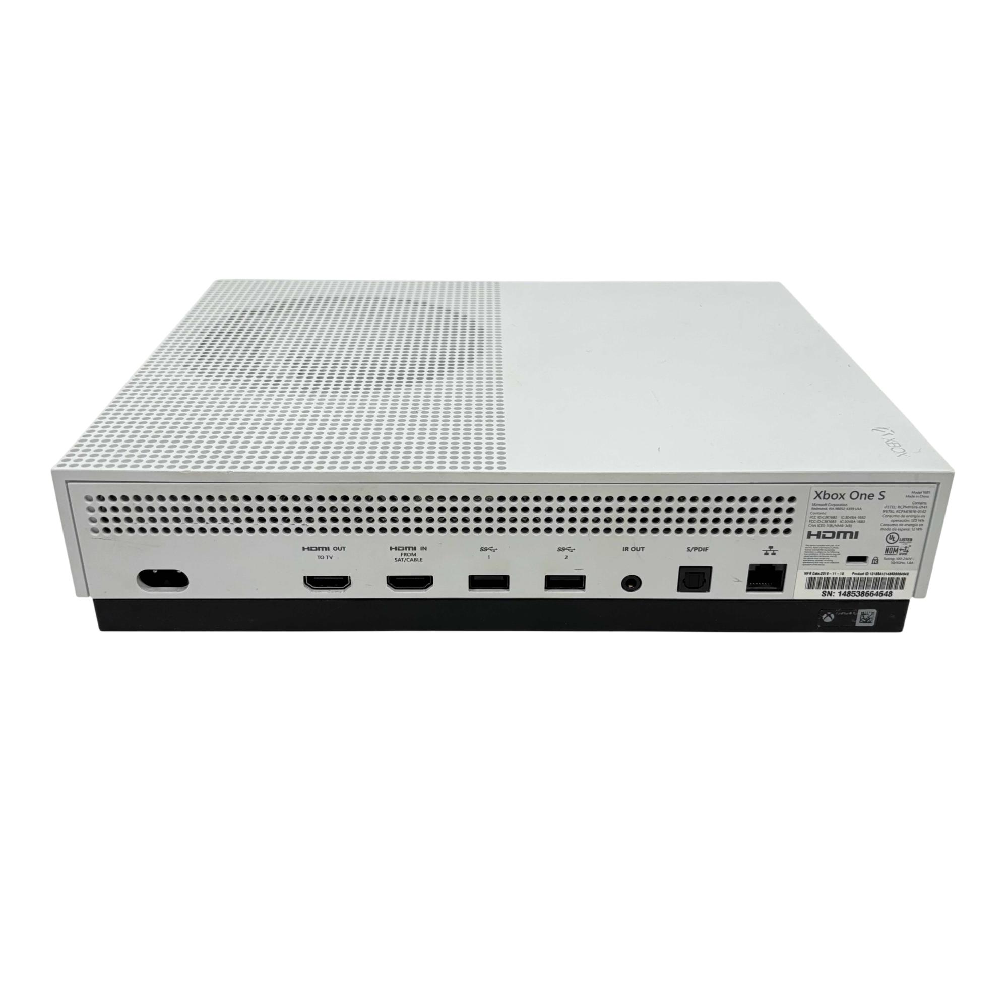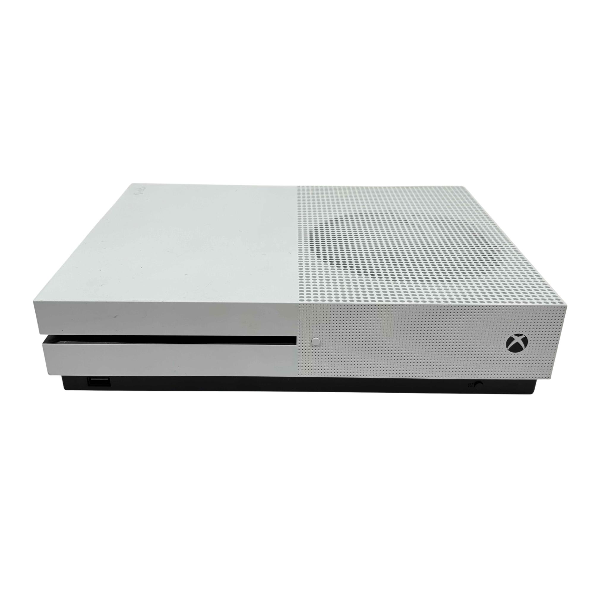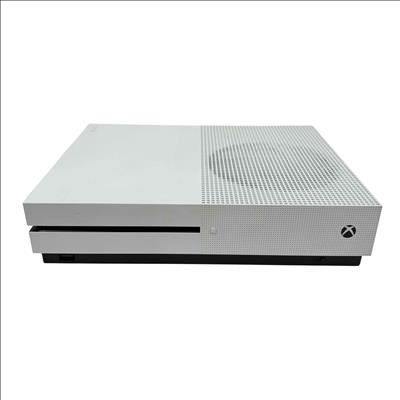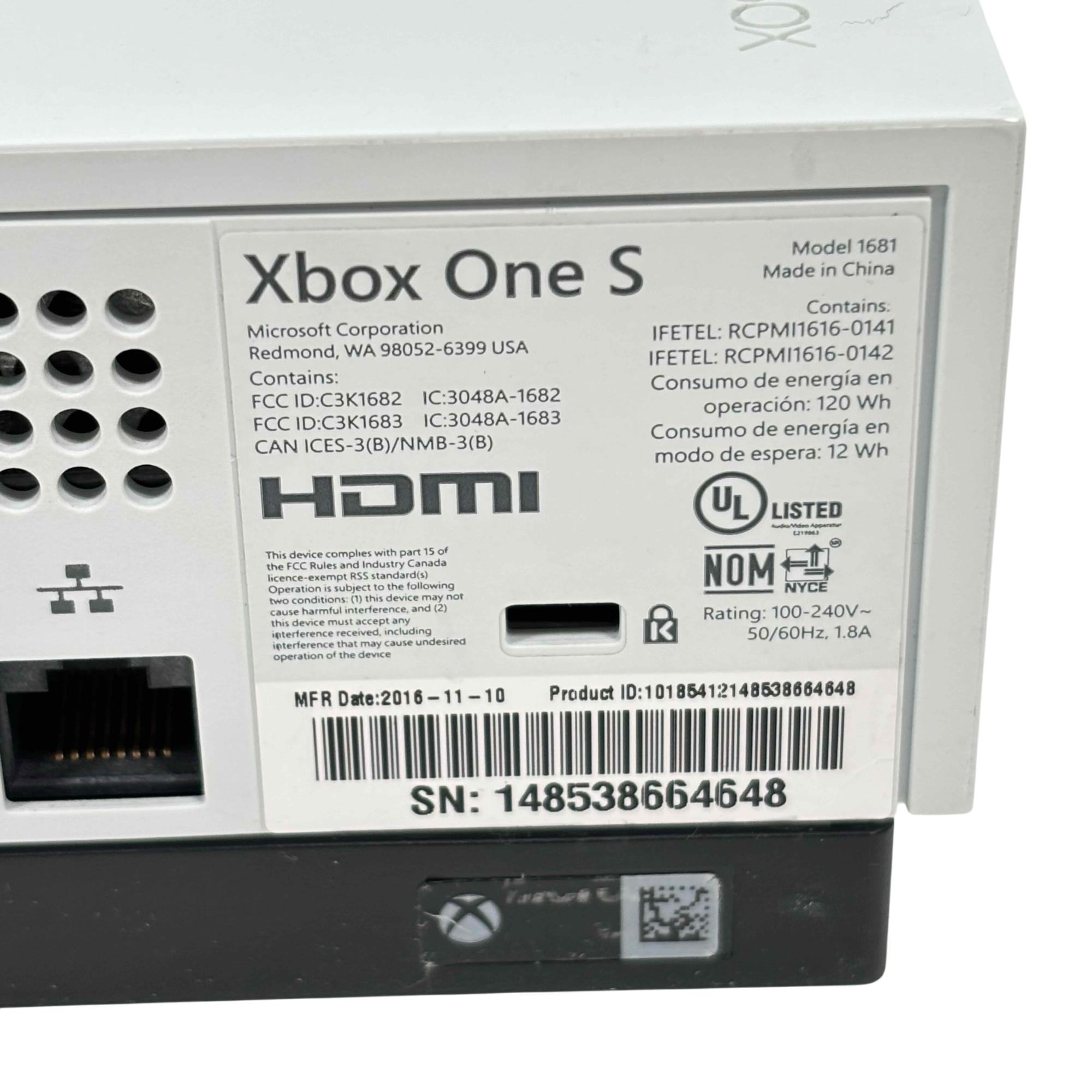 Microsoft Xbox One S 500GB Home Gaming Console (Model 1681) features a sleek white design with a compact, rectangular shape that fits seamlessly into any gaming setup. This console delivers high-definition gaming with smooth graphics and responsive controls, supported by its wireless white controller for enhanced gameplay experience.