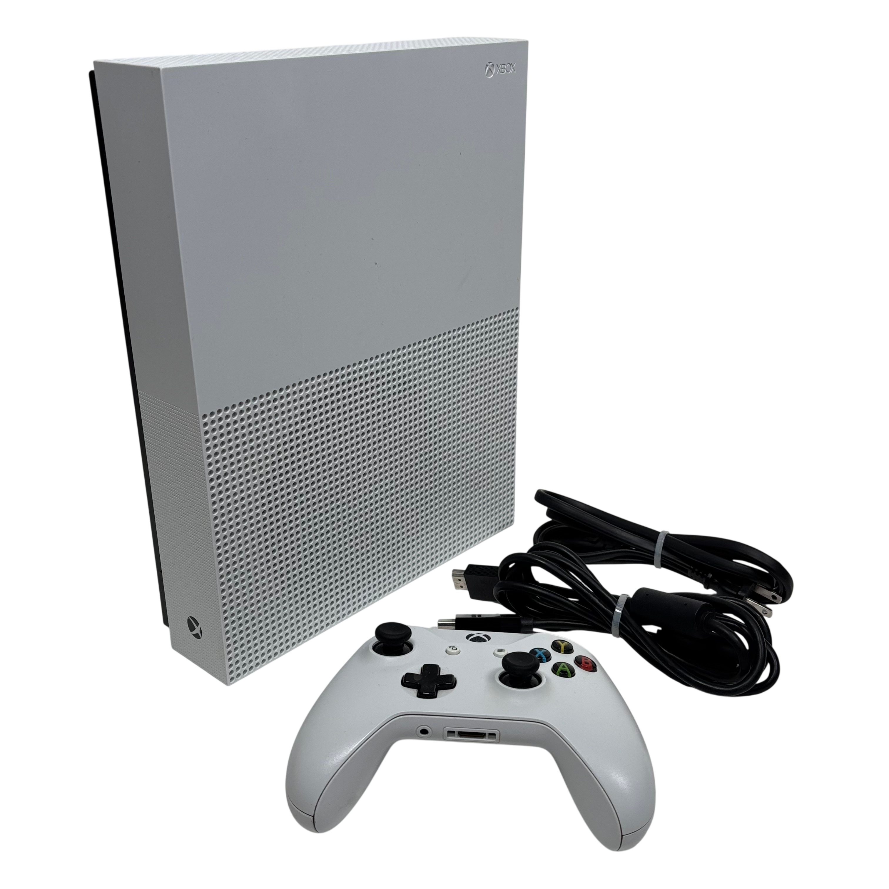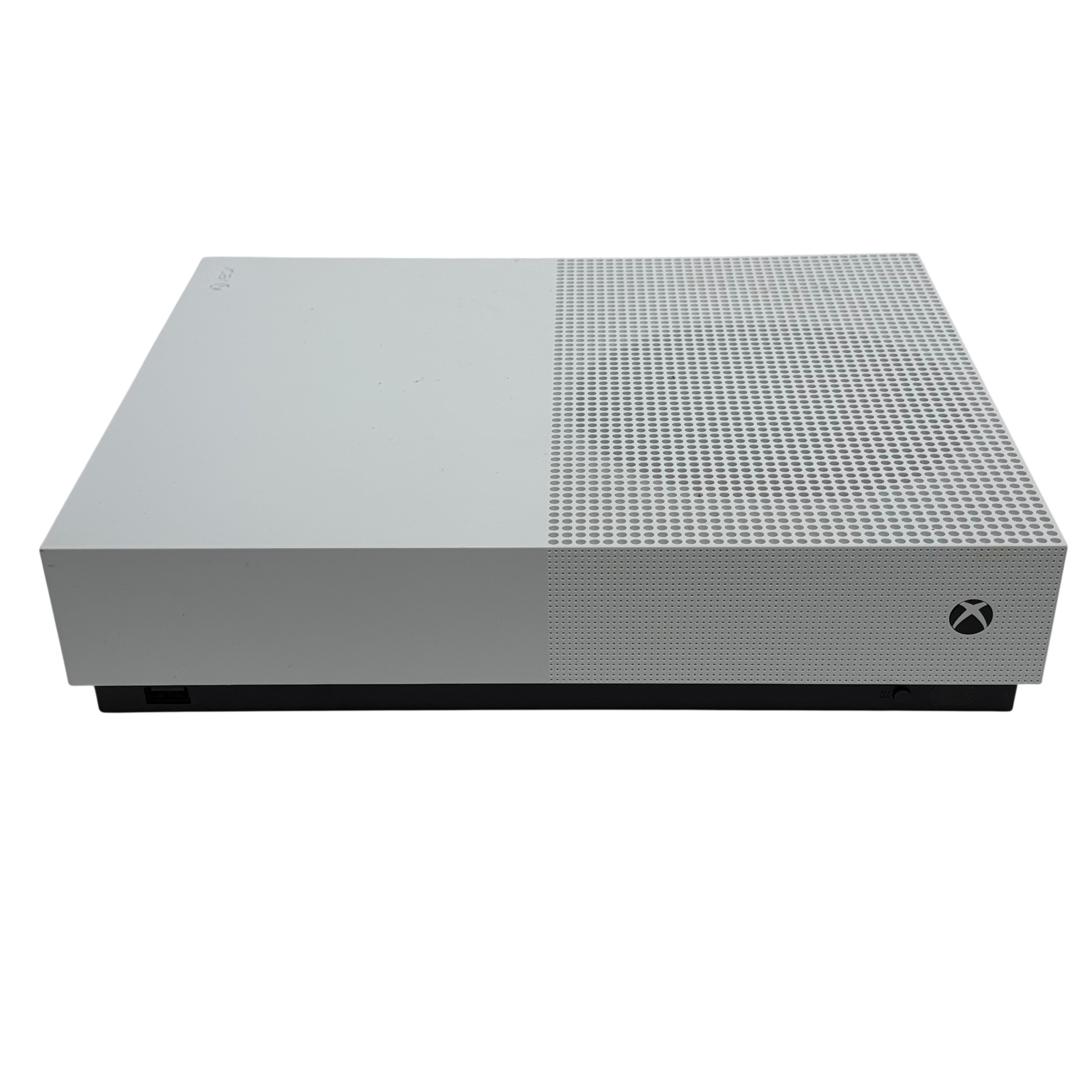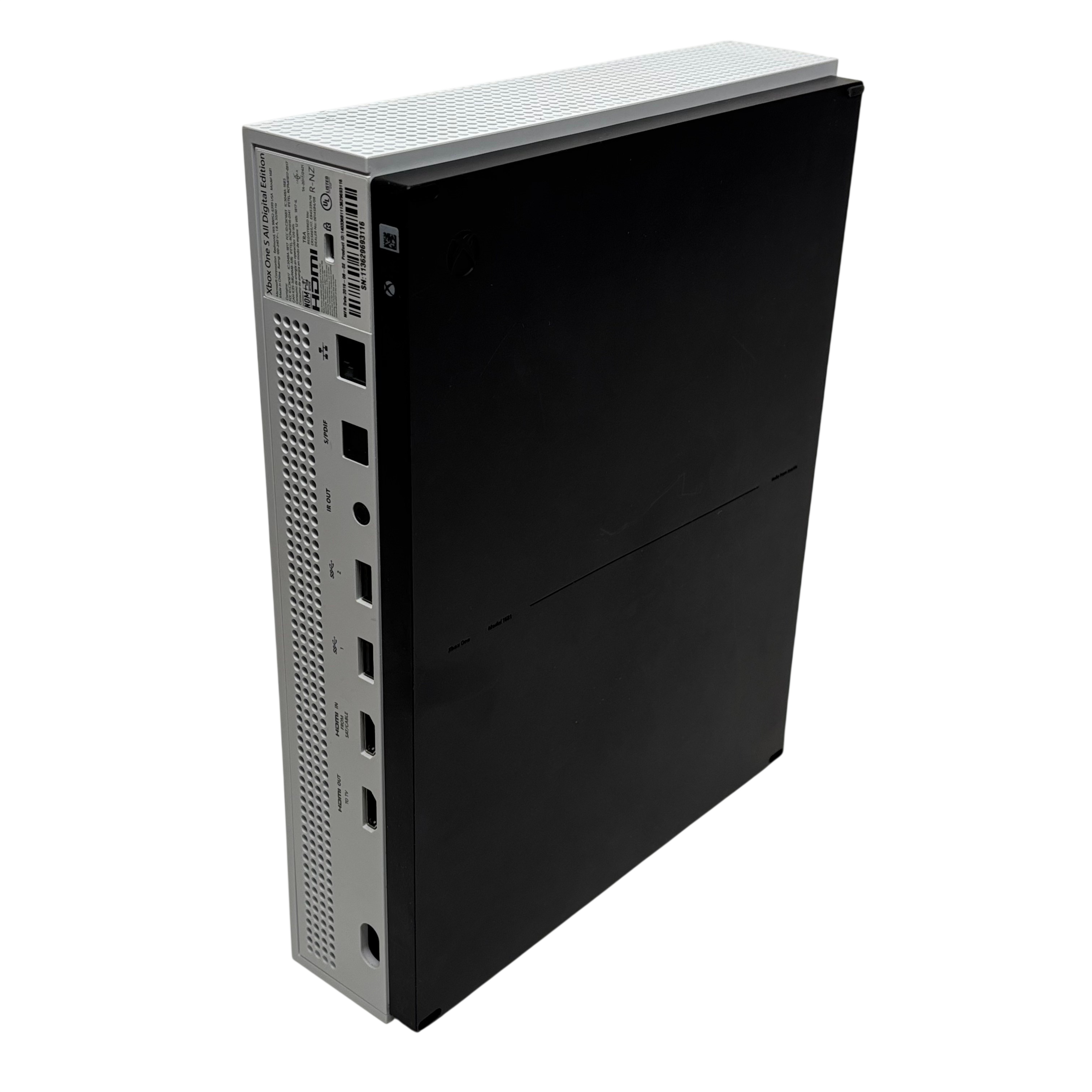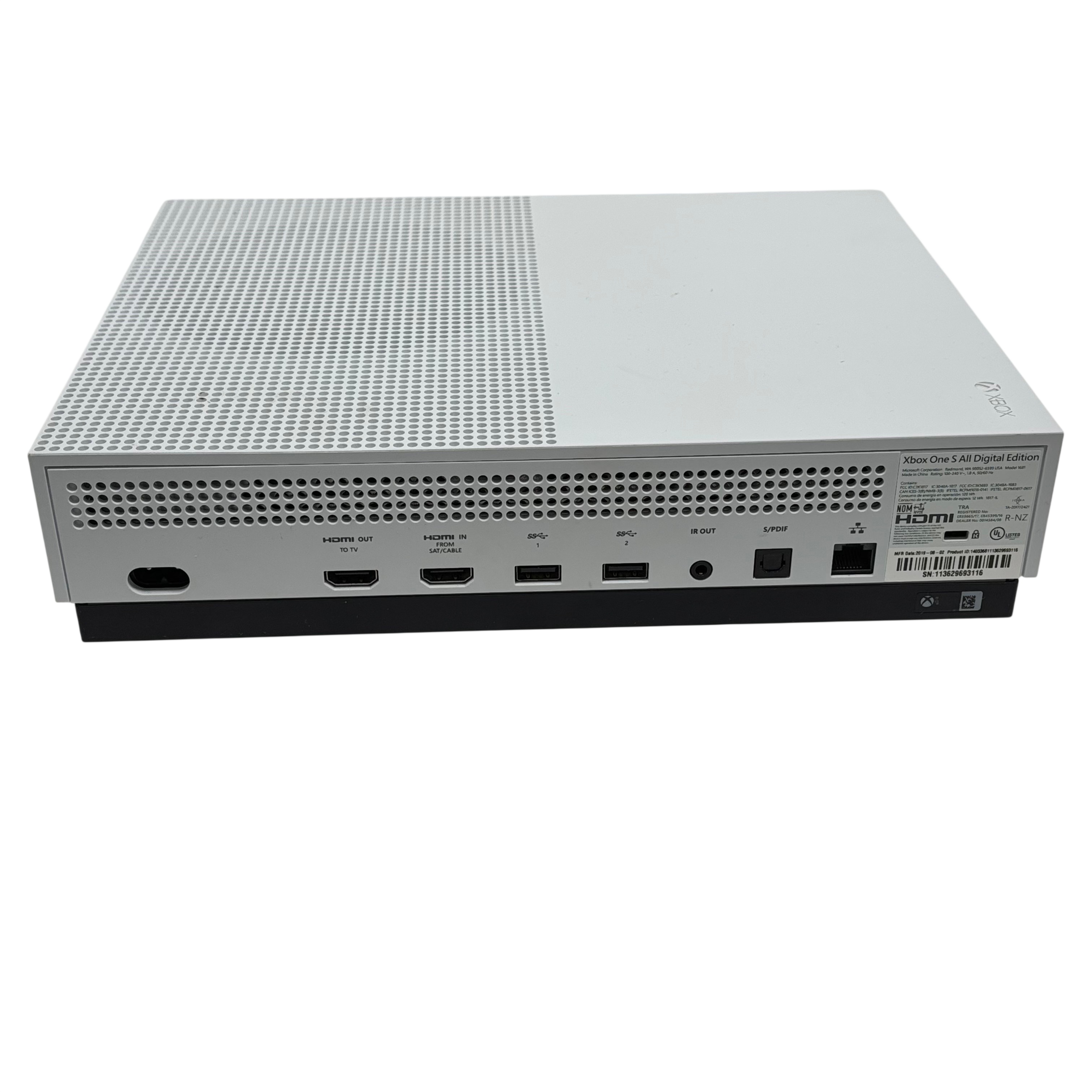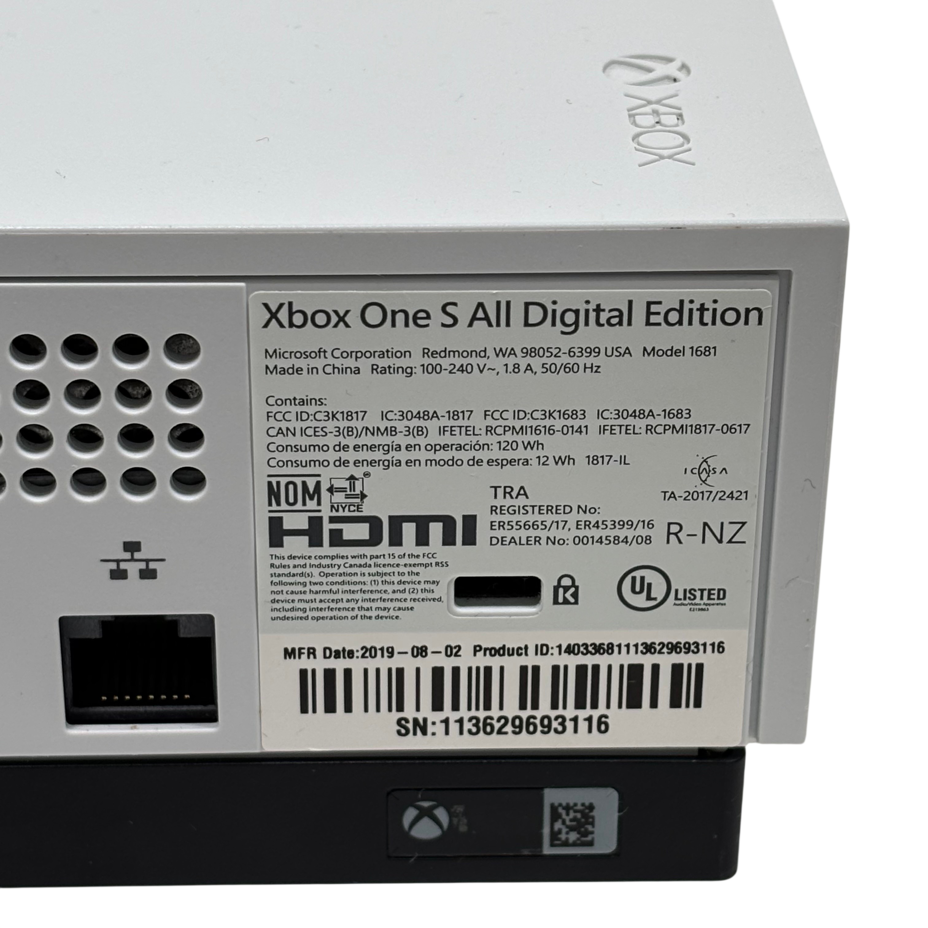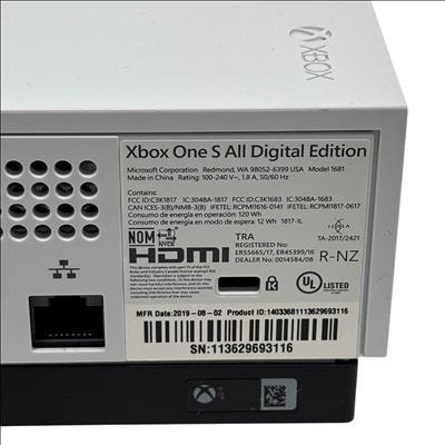 Microsoft Xbox One S All Digital Edition Model 1681 is a sleek, white video game console designed for digital-only gaming without a disc drive. It operates on a power rating of 100-240V and consumes 120 Wh during operation. This set includes the console, a wireless Xbox One controller, power cable, and HDMI cable, making it ready for immersive gaming and 4K video streaming. Its compact dimensions and lightweight design make it a great addition to any entertainment setup.
