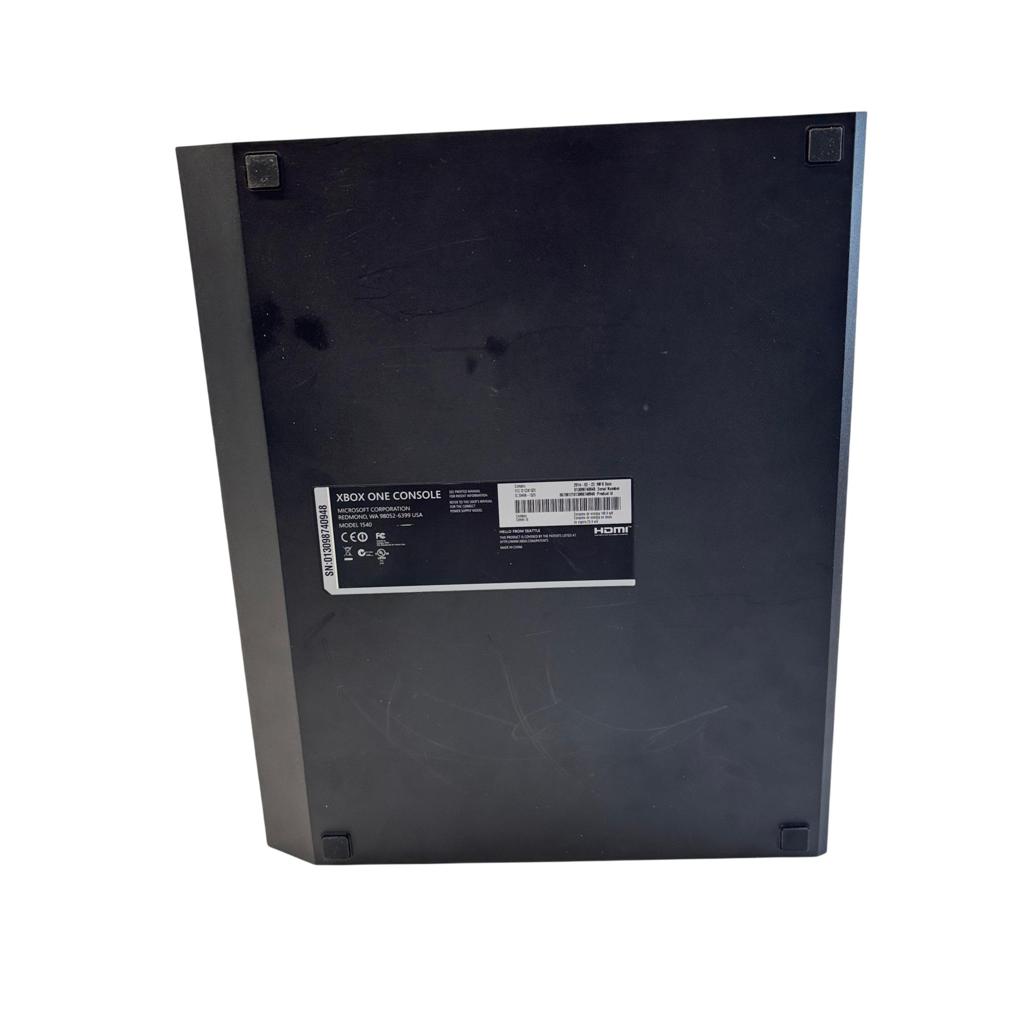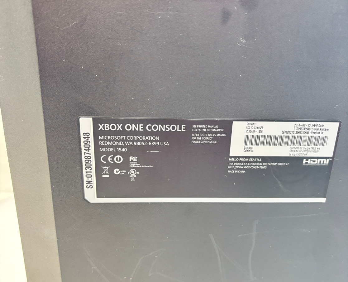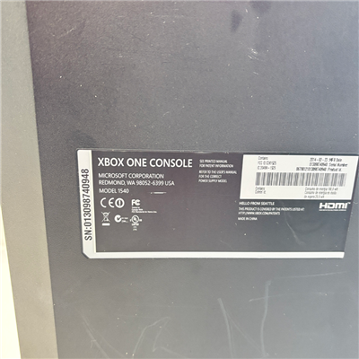 Microsoft Xbox One Console Model 1540 is a sleek black gaming system designed with an intuitive controller and power supply. This model features a distinctive rectangular shape with clear white labeling and is manufactured in China. Engineered by Microsoft Corporation, it offers a reliable performance platform ideal for immersive video gaming experiences.