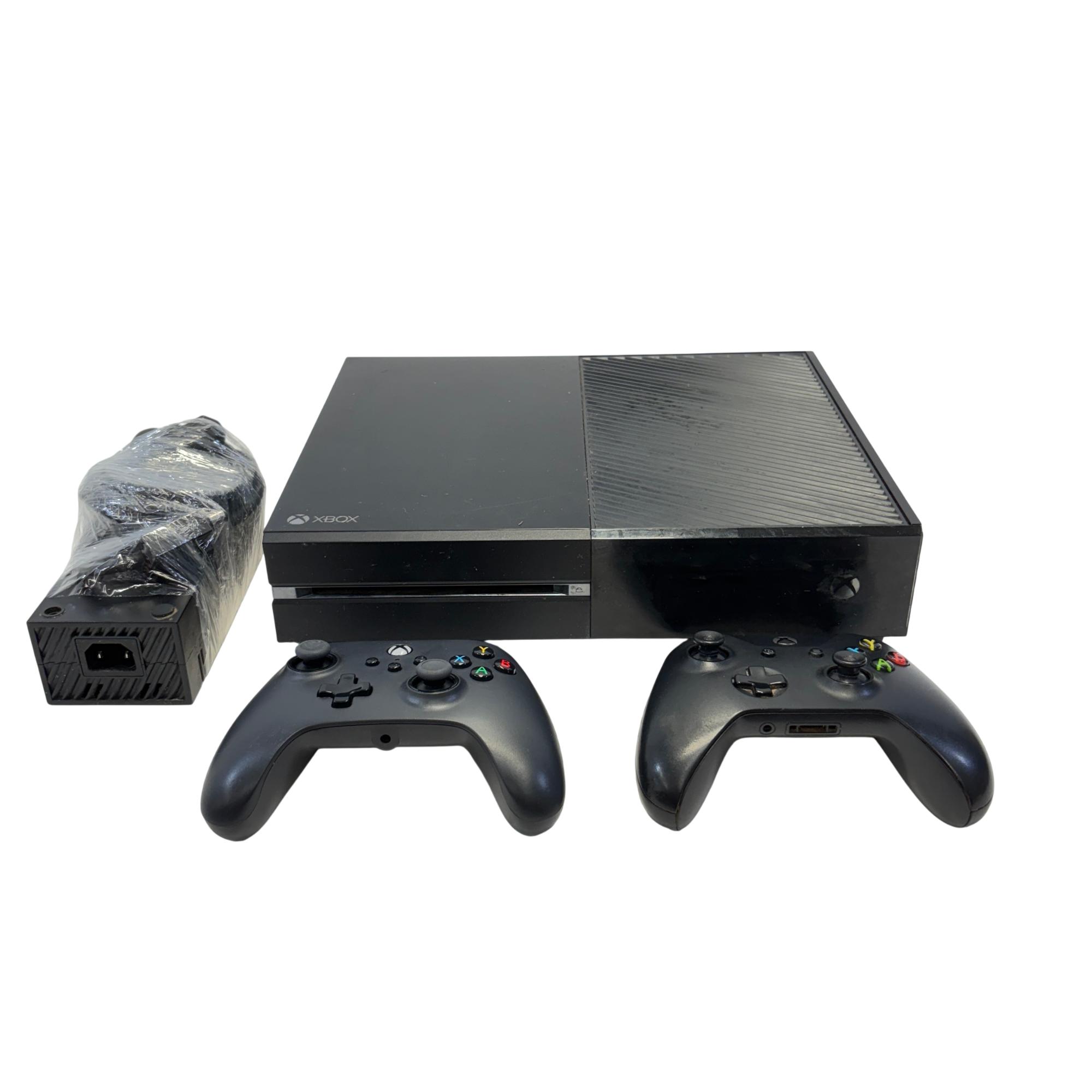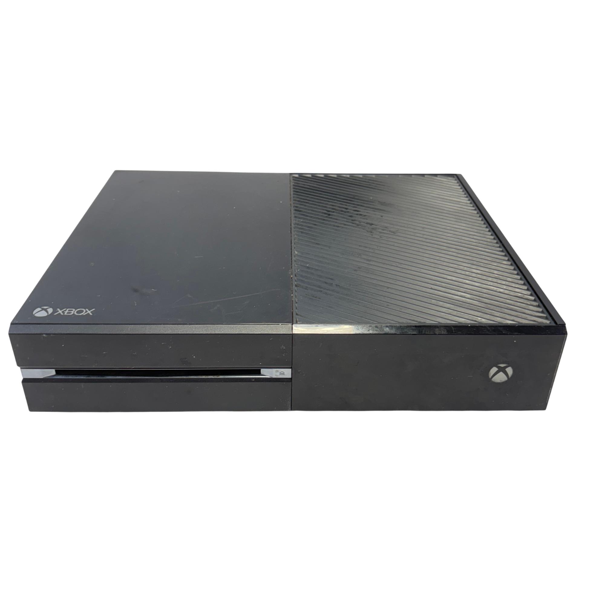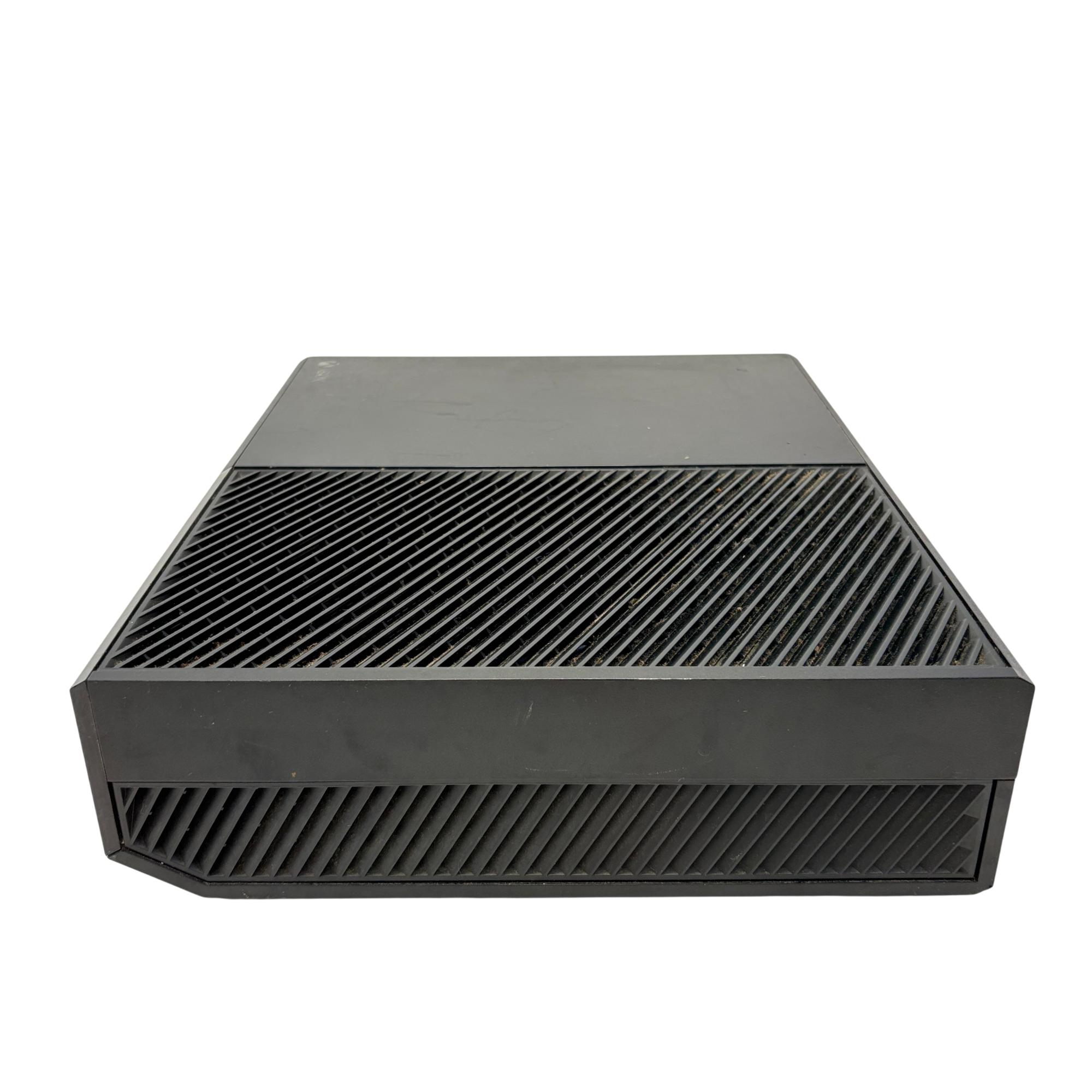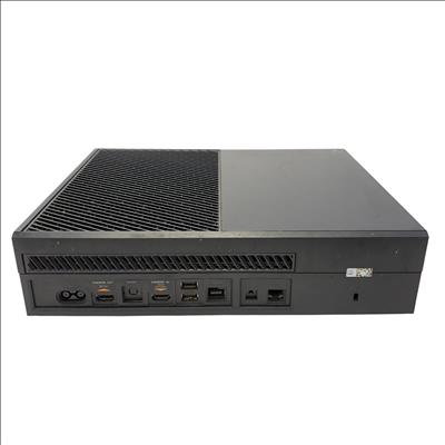 The Microsoft Xbox One features a sleek black rectangular design with multiple ports including HDMI in and out for seamless connectivity to your TV and other devices. This gaming console supports high-definition video output and offers robust performance for immersive gameplay experiences.