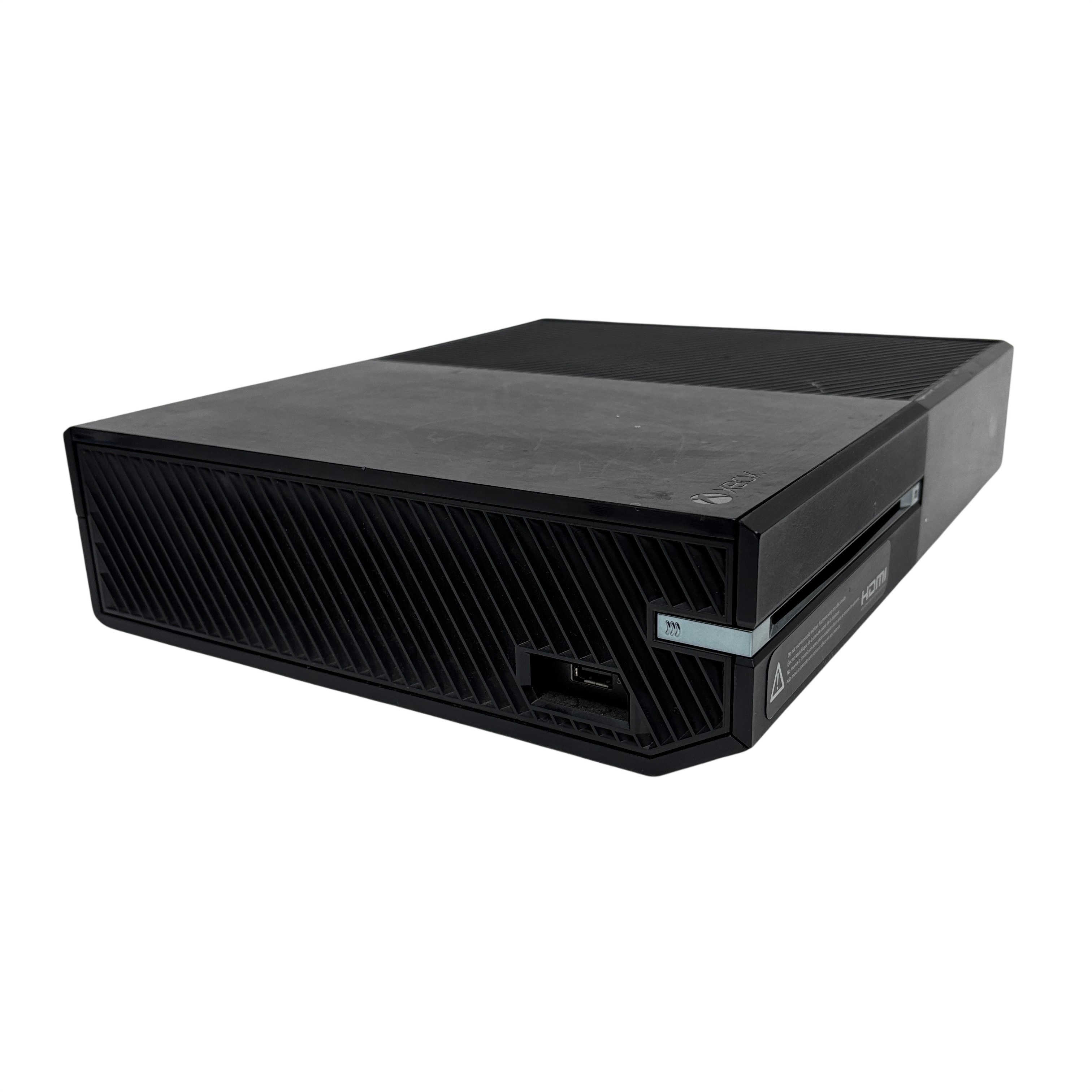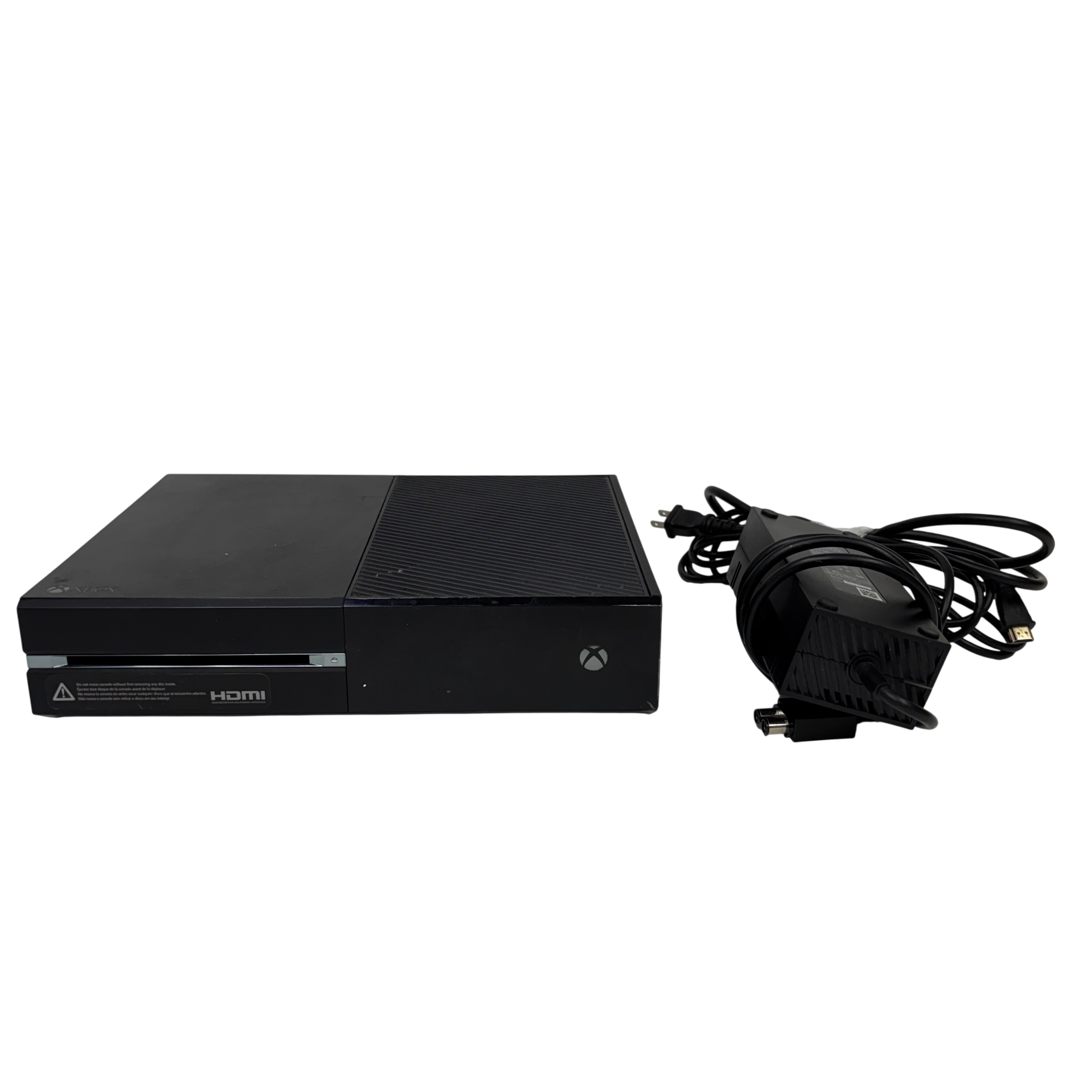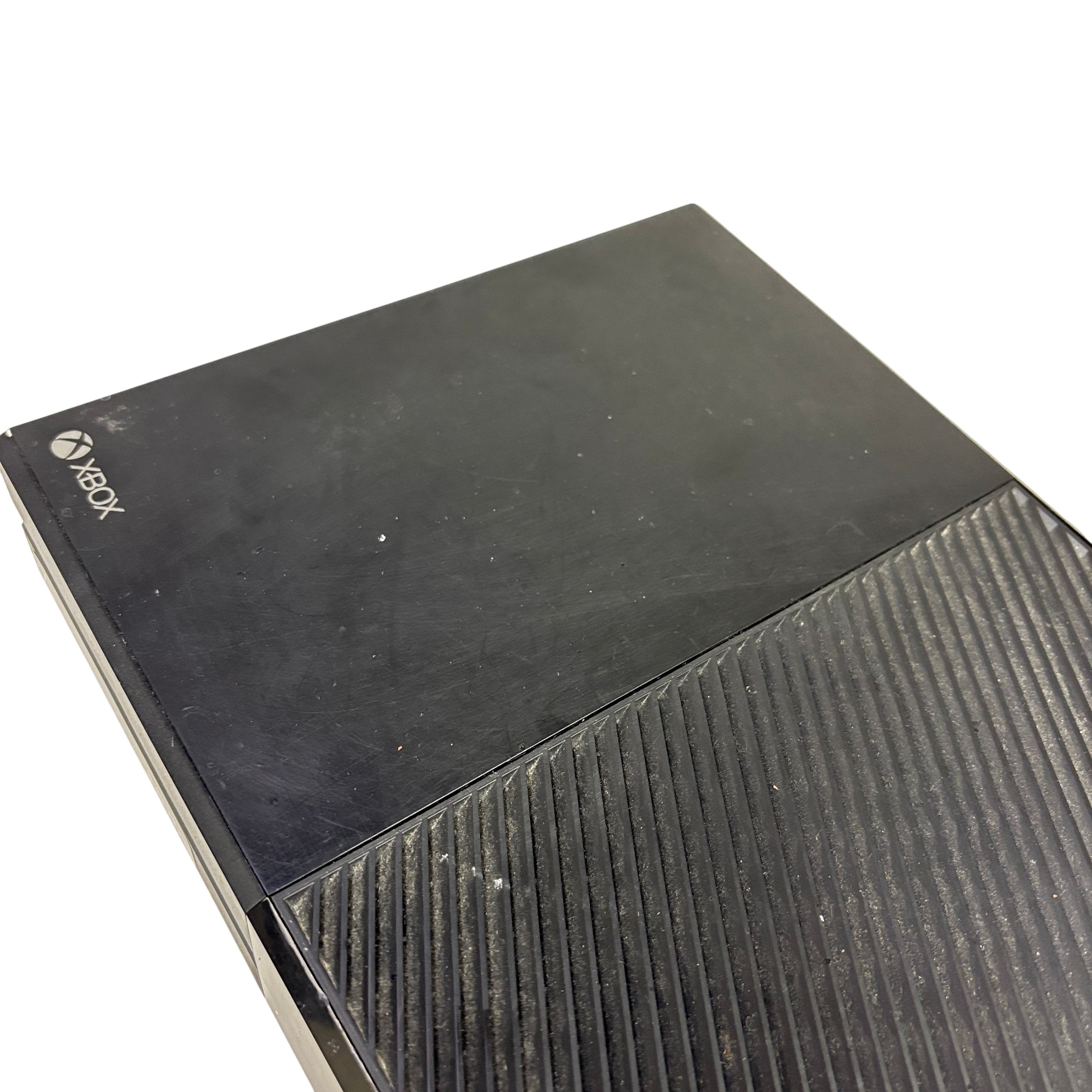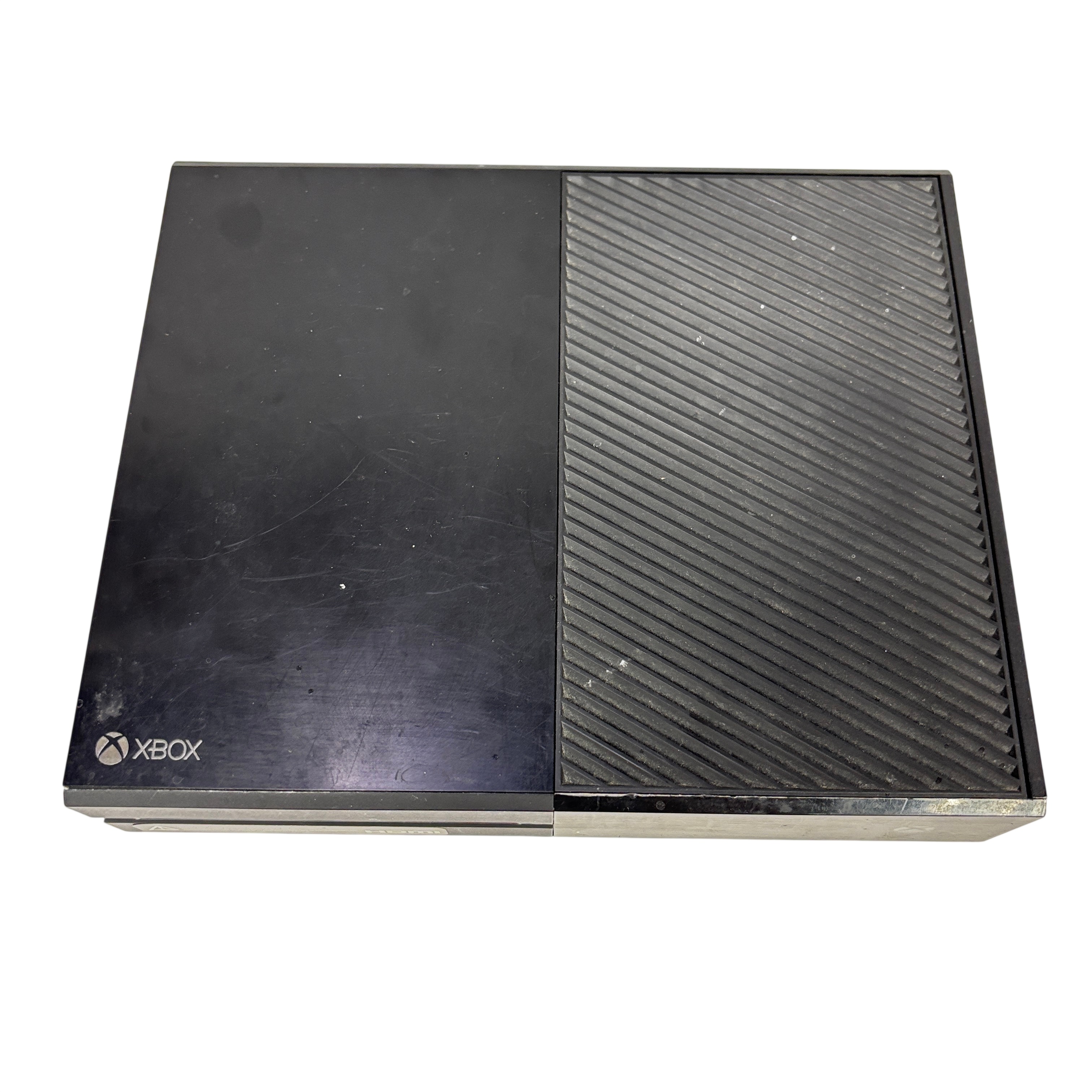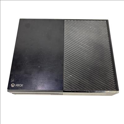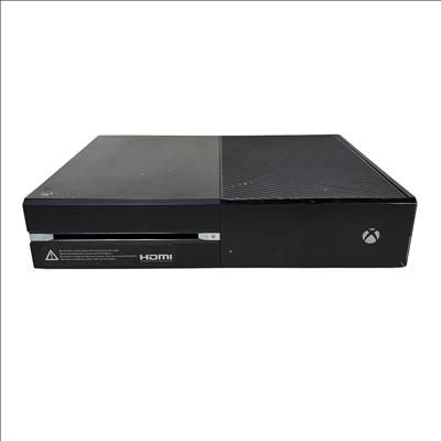 This Microsoft Xbox One Console Model 1540 is a first-generation Xbox One video game console featuring a 500GB hard drive and HDMI output for high-definition gaming and media playback. This black console includes the main unit and power brick, supporting Blu-ray discs and Xbox Live connectivity for online gaming. Ideal for gamers seeking a reliable console with physical disc support and multimedia capabilities. The unit shows typical signs of use with some surface wear but remains fully functional.