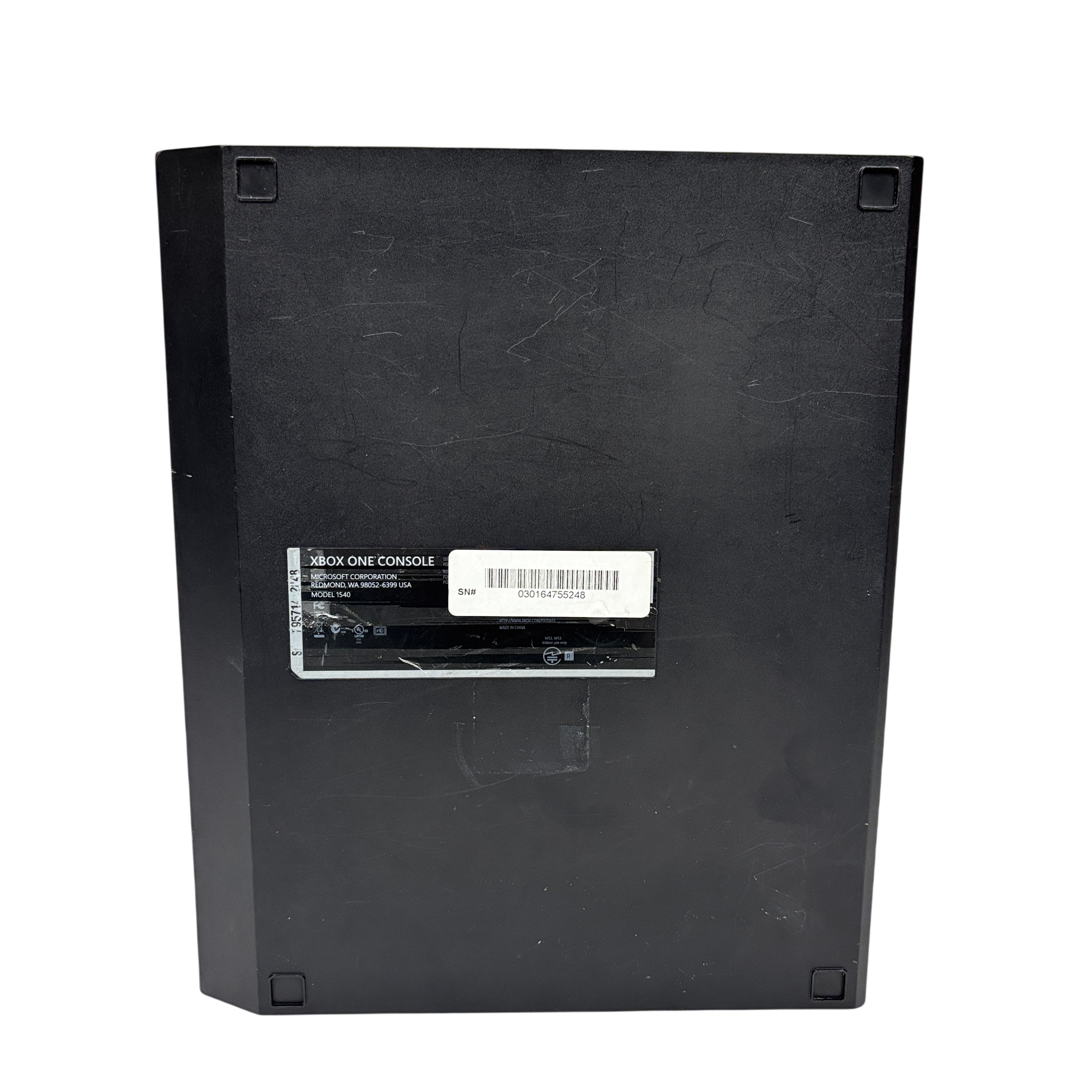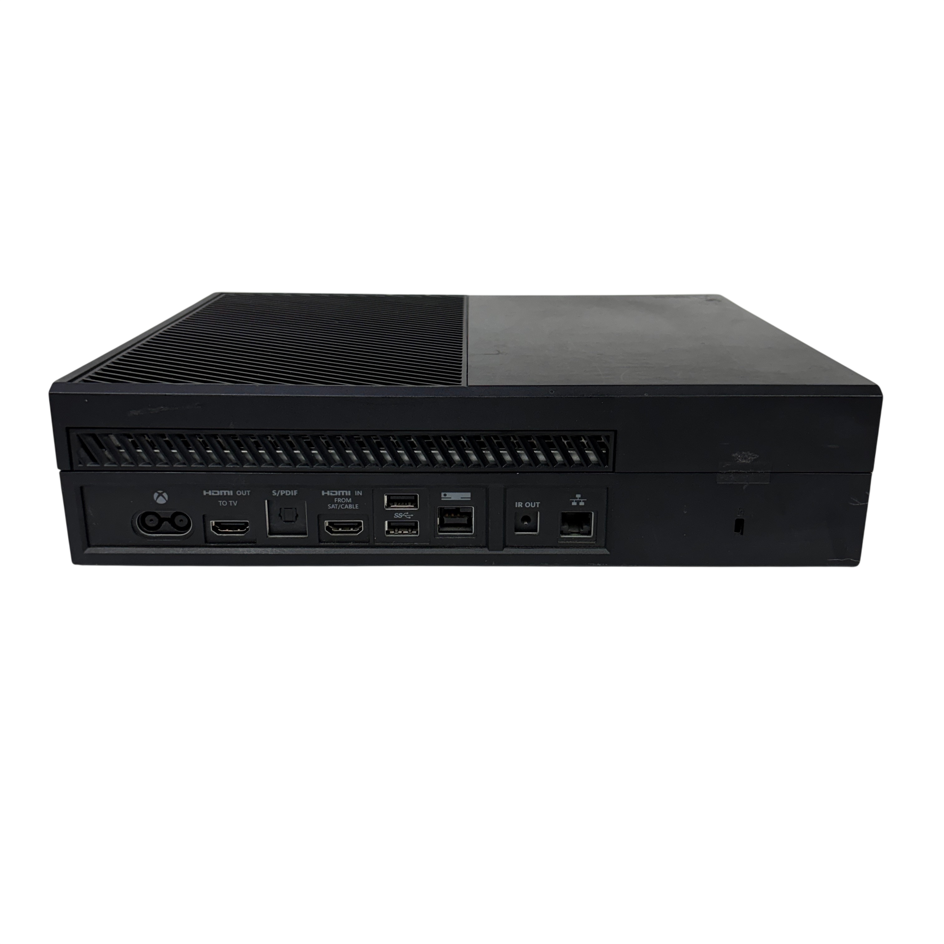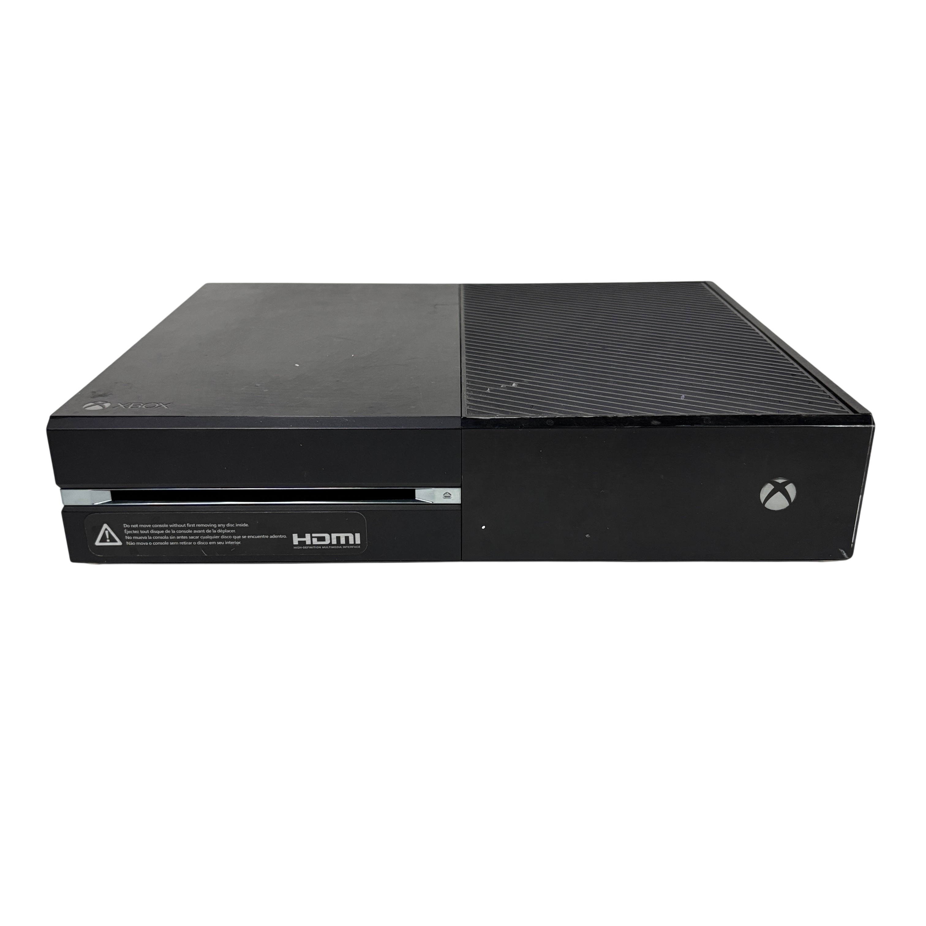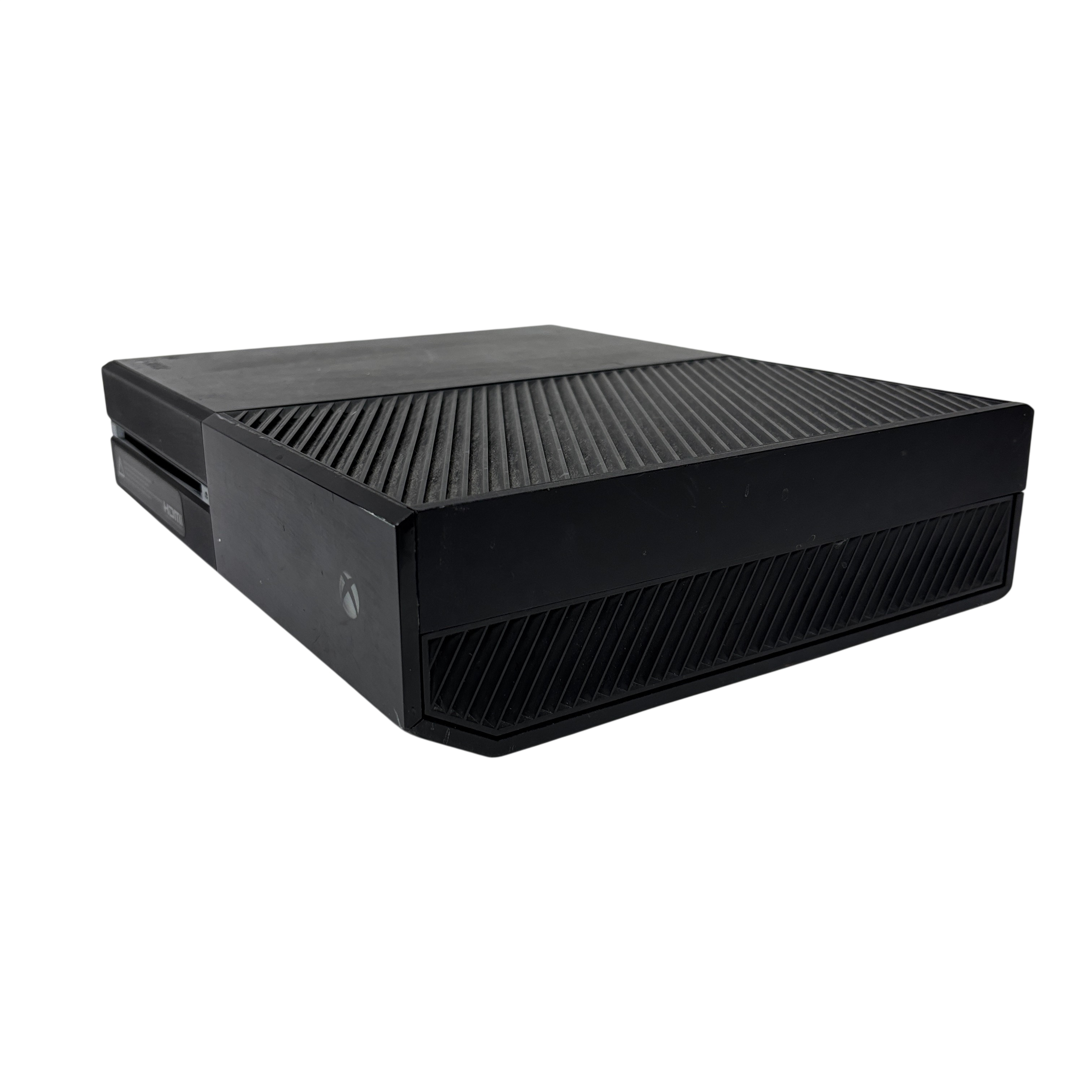 This Microsoft Xbox One Console Model 1540 is a first-generation Xbox One video game console featuring a 500GB hard drive and HDMI output for high-definition gaming and media playback. This black console includes the main unit and power brick, supporting Blu-ray discs and Xbox Live connectivity for online gaming. Ideal for gamers seeking a reliable console with physical disc support and multimedia capabilities. The unit shows typical signs of use with some surface wear but remains fully functional.