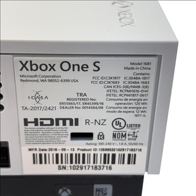 Microsoft Xbox One S is a sleek and compact video game console designed for immersive gaming and entertainment. Featuring a 1TB internal hard drive, it offers ample storage for games and media. The console supports HDMI output for high-definition video and operates on a wide voltage range of 100-240V, making it suitable for various regions. This listing includes the Xbox One S console and power cable only, without a controller, ideal for users who want to expand their existing Xbox setup or replace a console.