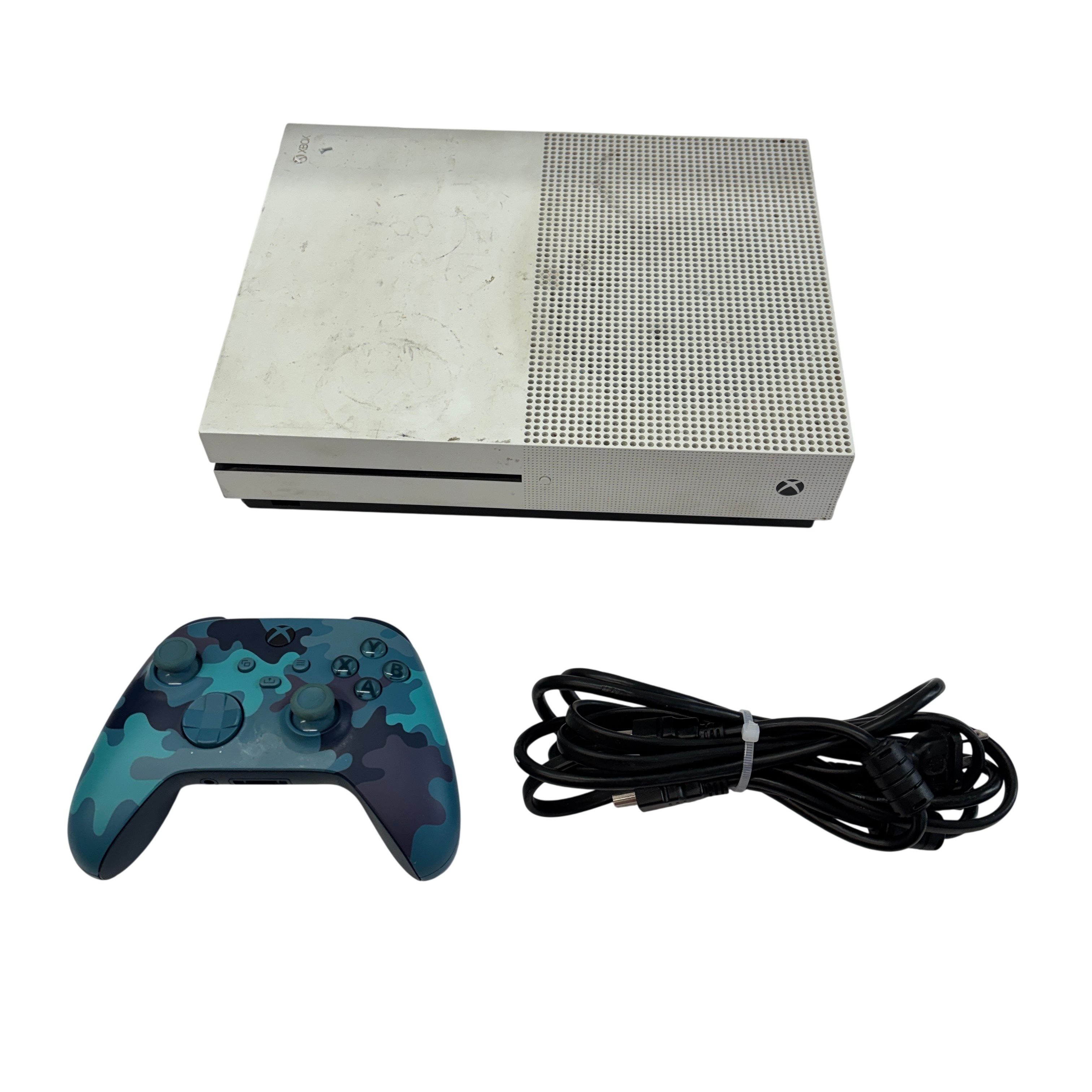 Microsoft Xbox One S Model 1681 is a versatile video game console featuring 4K video playback and HDR support for enhanced gaming and entertainment experiences. This previously owned unit includes the console, a blue camouflage Xbox wireless controller, and a power cable. With multiple connectivity options such as HDMI input/output, USB 3.0 ports, and Ethernet, it is designed to fit seamlessly into your home entertainment setup.