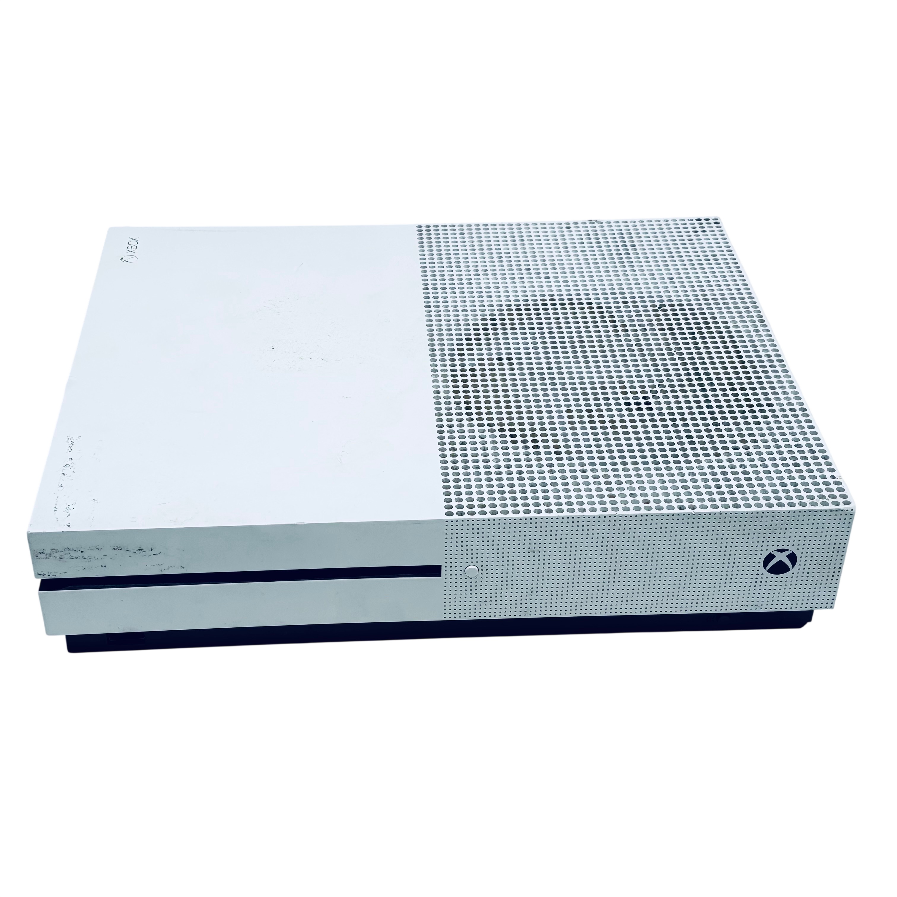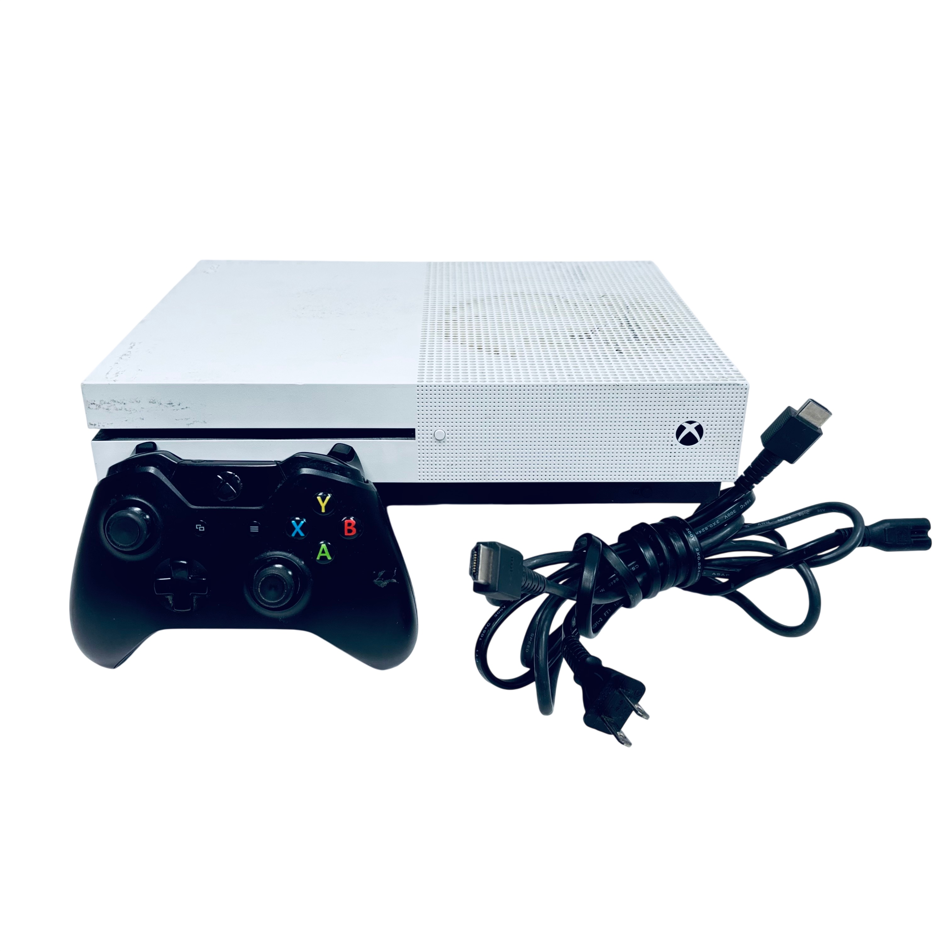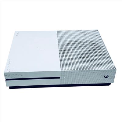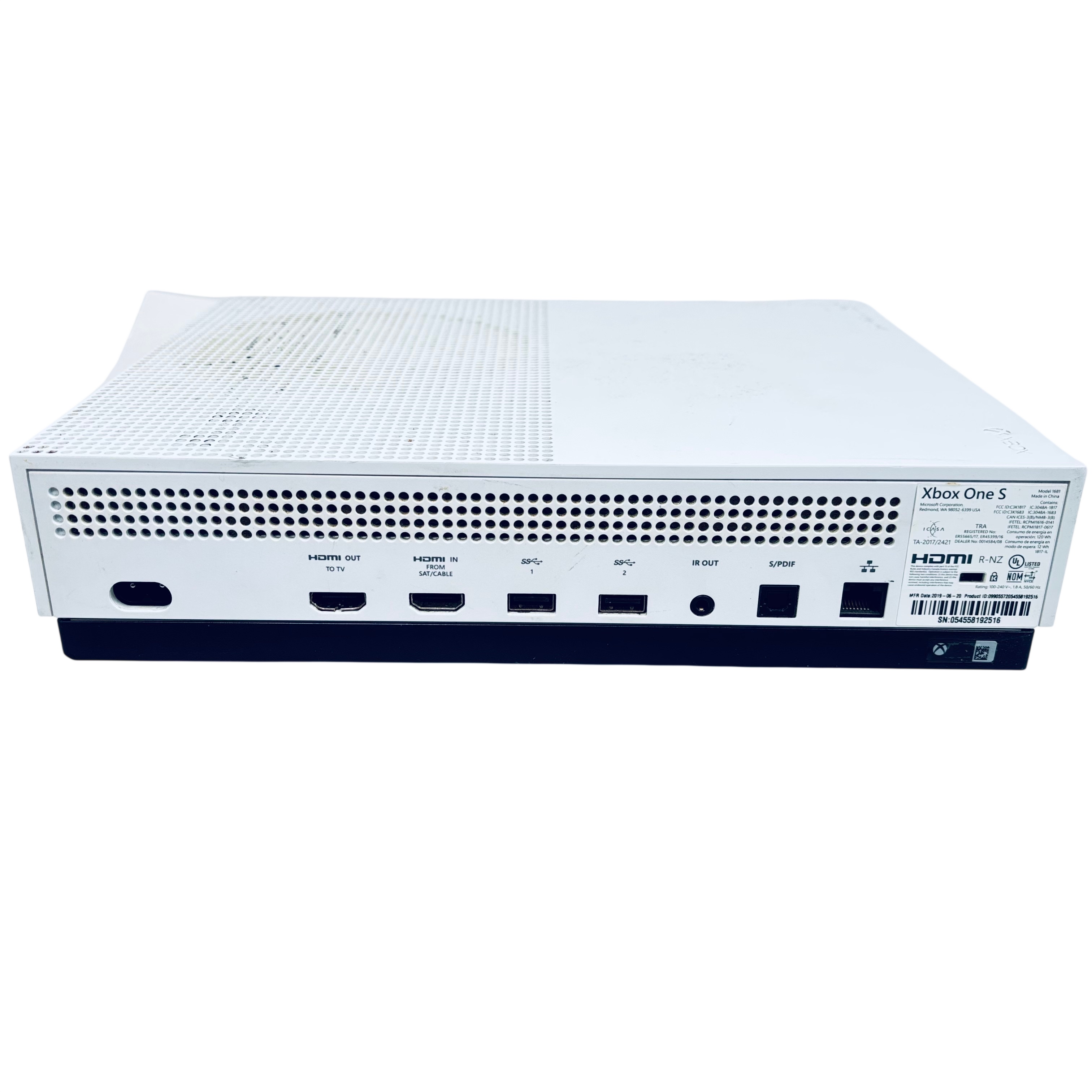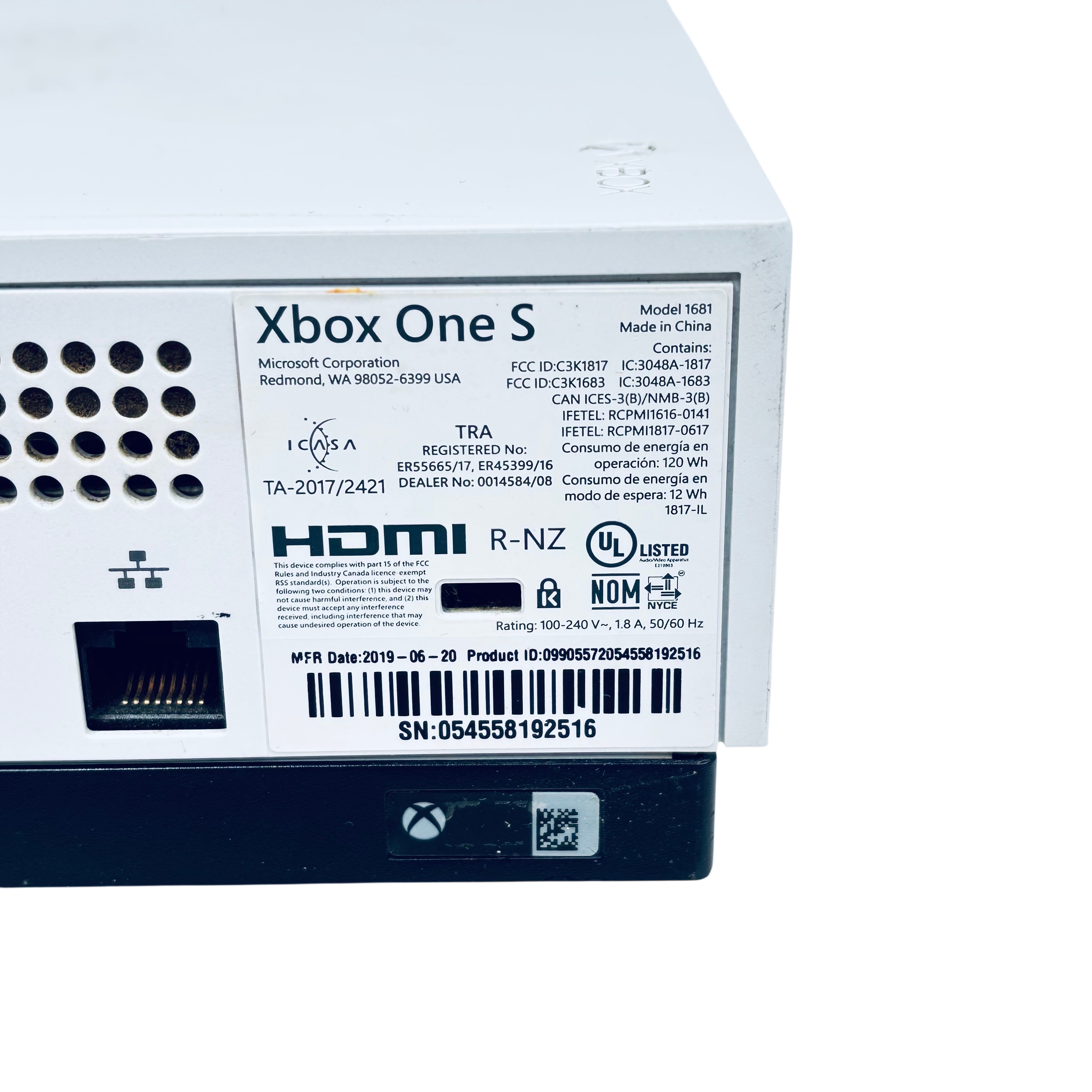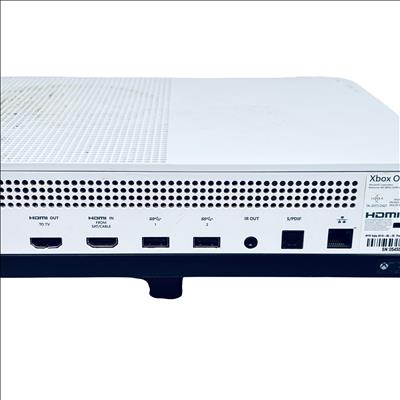 Microsoft Xbox One S Model 1681 is a versatile video game console featuring a sleek white and black design. It supports 4K Ultra HD video streaming and HDR for enhanced picture quality. This model includes HDMI input and output ports, two USB 3.0 ports, and an IR out for expanded connectivity options. The package comes with the console, one wireless controller, and the power cable, making it ready for gaming and entertainment right out of the box. Its compact dimensions and built-in power supply make it easy to set up in any entertainment center.