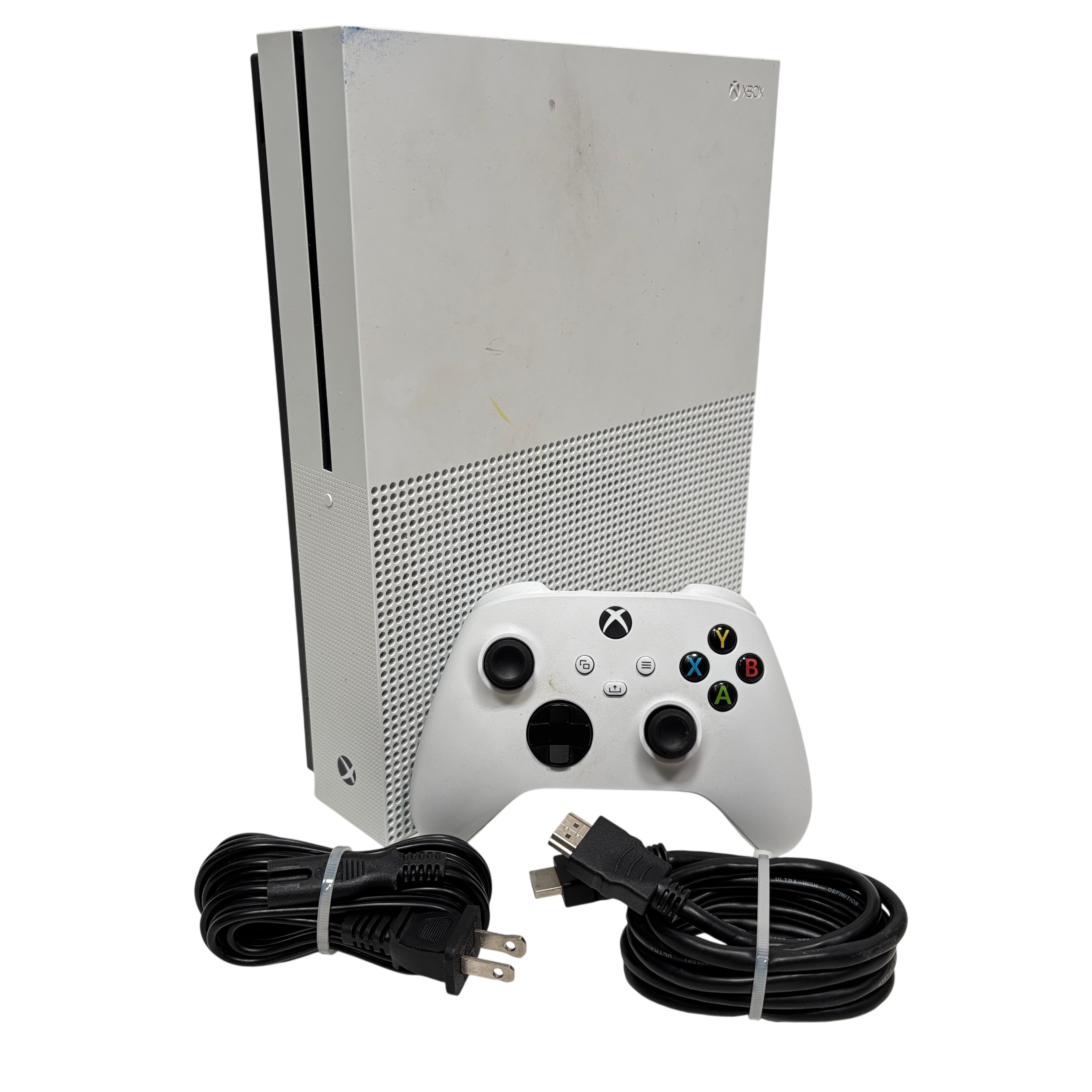 The Microsoft Xbox One S 500GB in white delivers powerful entertainment and gaming in one sleek console. Enjoy 4K Ultra HD streaming and Blu-ray playback with vibrant HDR visuals. Store and play your favorite titles with 500GB of storage, and experience smooth online multiplayer with Xbox Live. Compatible with a wide library of games from Xbox One, Xbox 360, and the original Xbox, the Xbox One S offers a versatile gaming experience for players and media lovers alike.