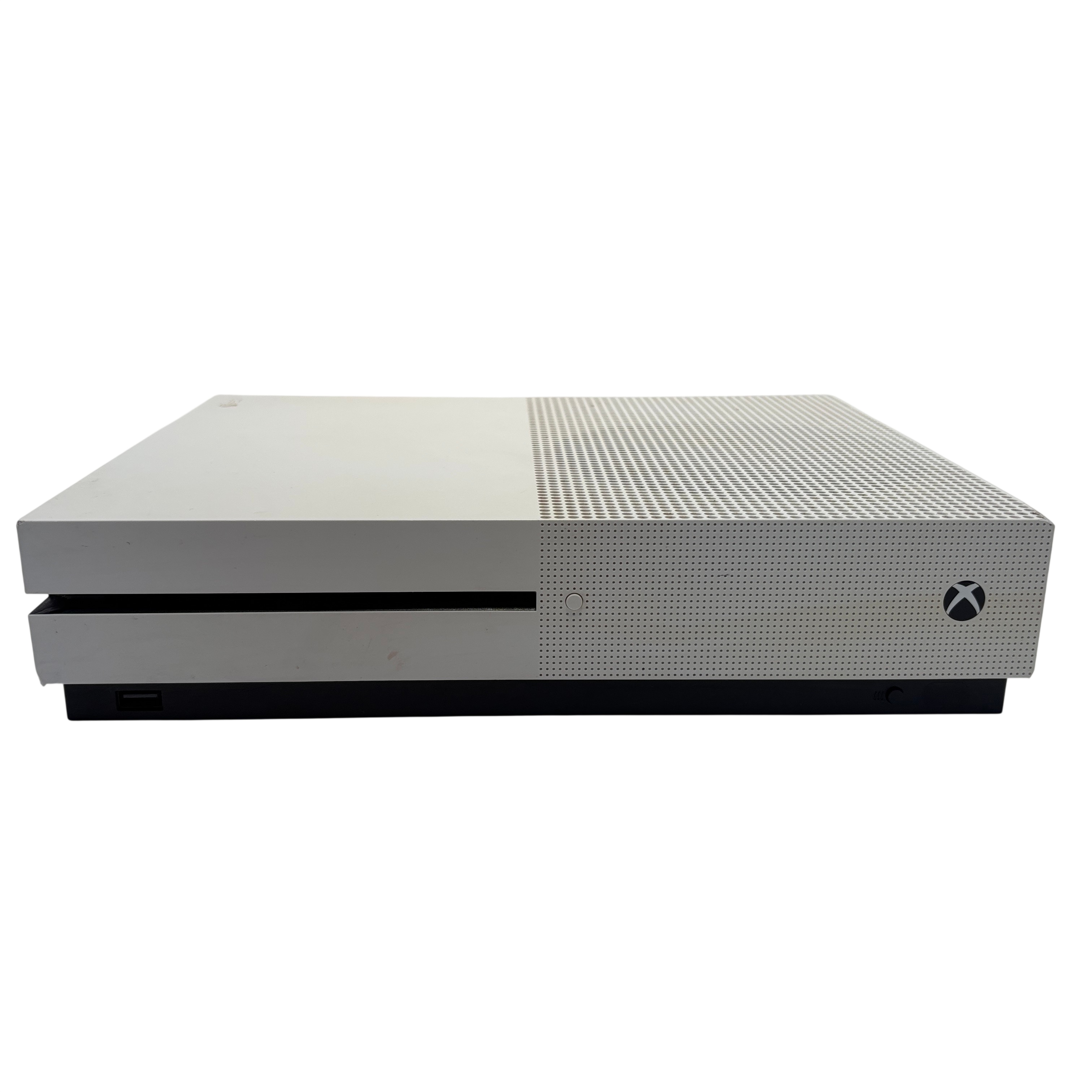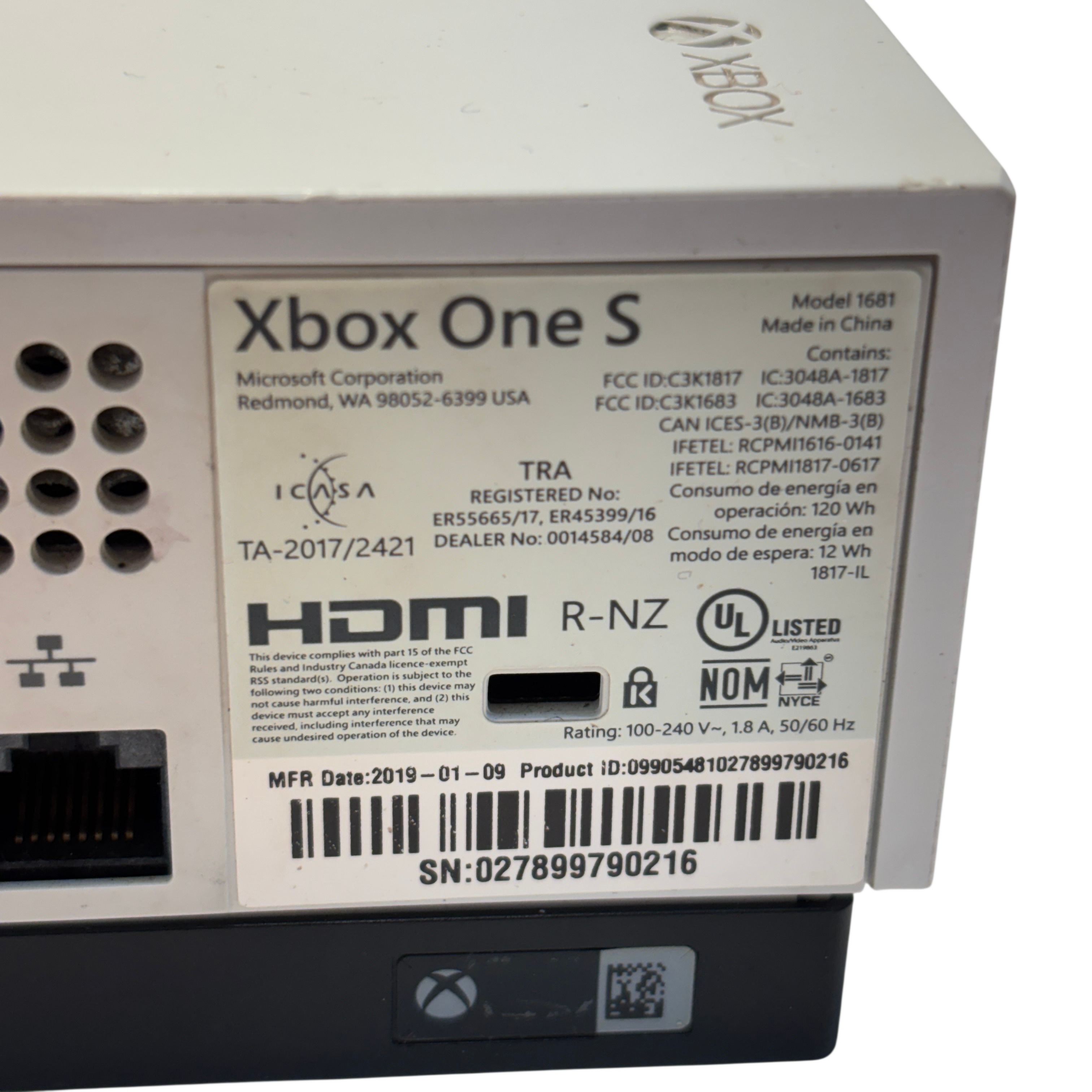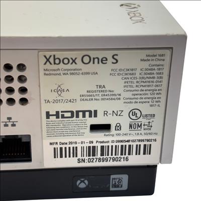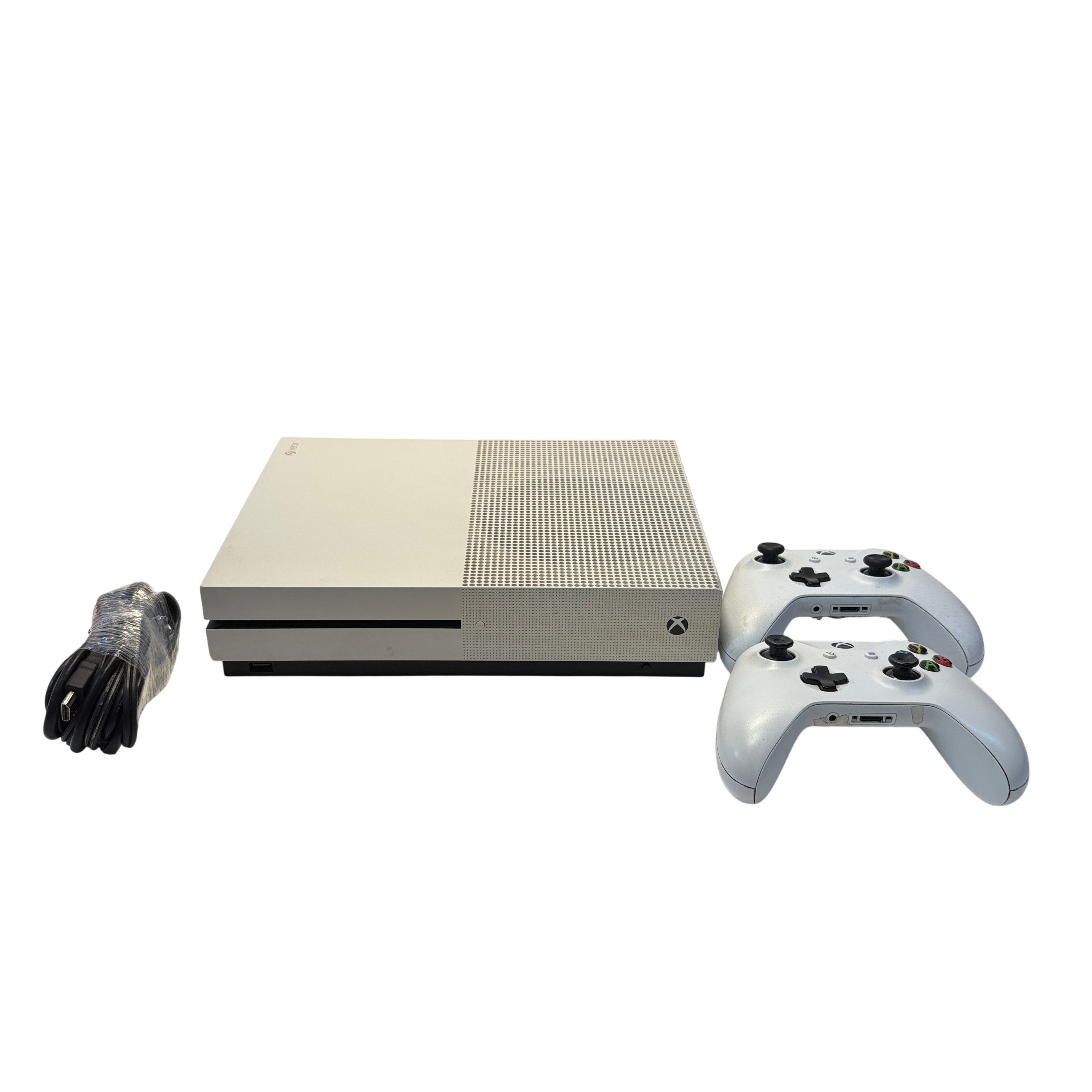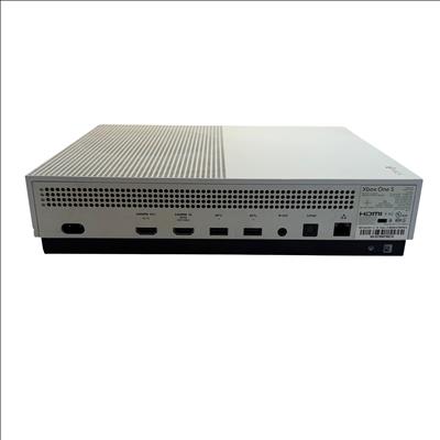 The Microsoft Xbox One S is a sleek and compact video game console designed for immersive gaming experiences. This model features a slim white and black design with HDMI output and energy-efficient power consumption rated at 120 Wh during operation. Included are two wireless Xbox One controllers, allowing multiplayer gaming right out of the box. Ideal for gamers seeking a reliable console with solid performance and a complete accessory set.