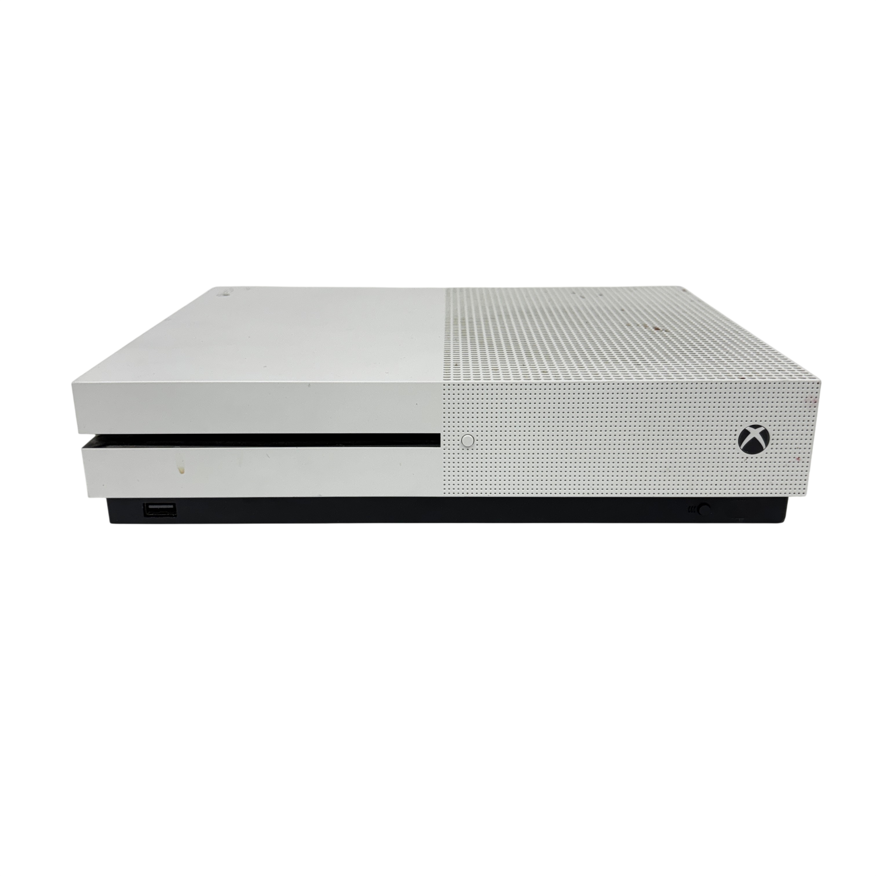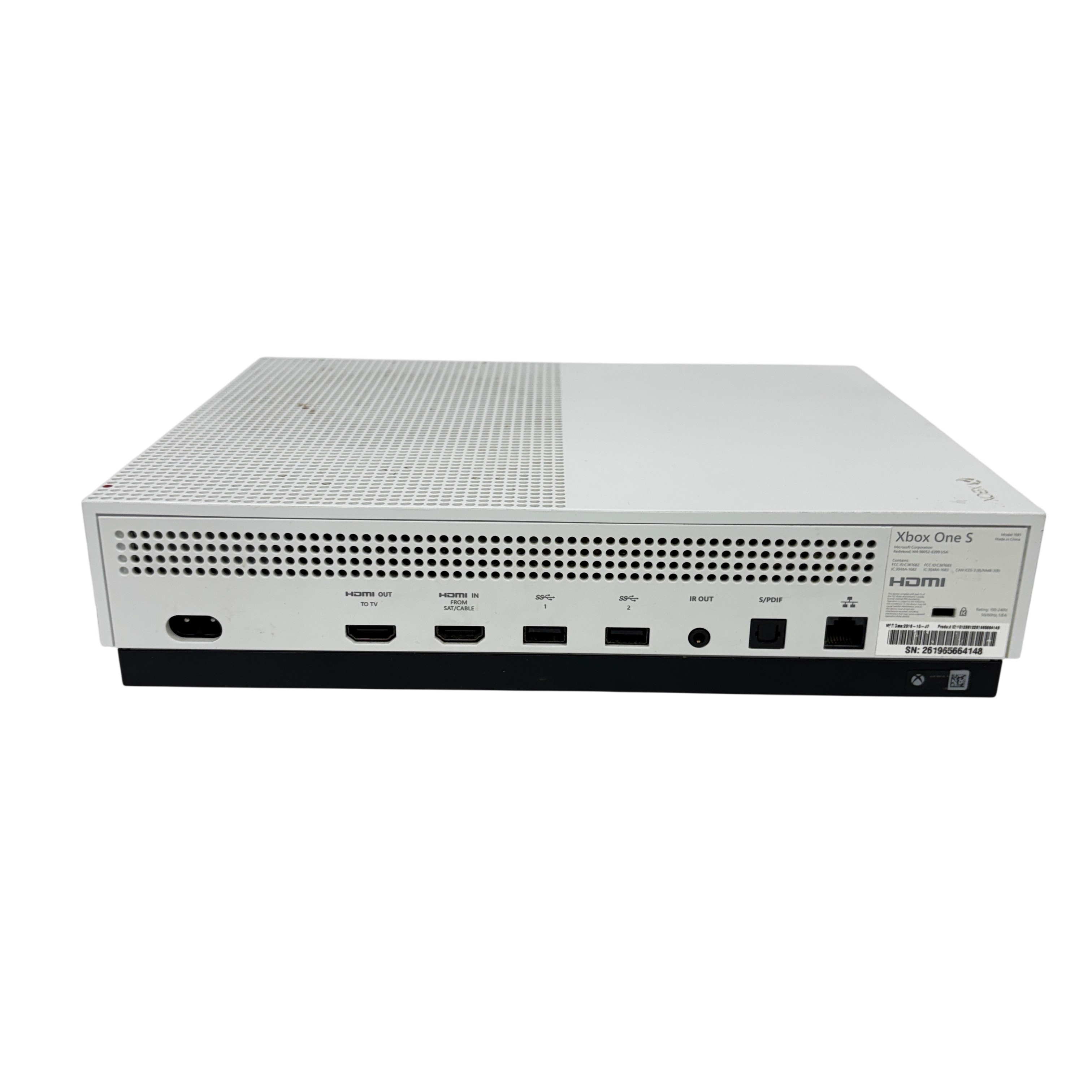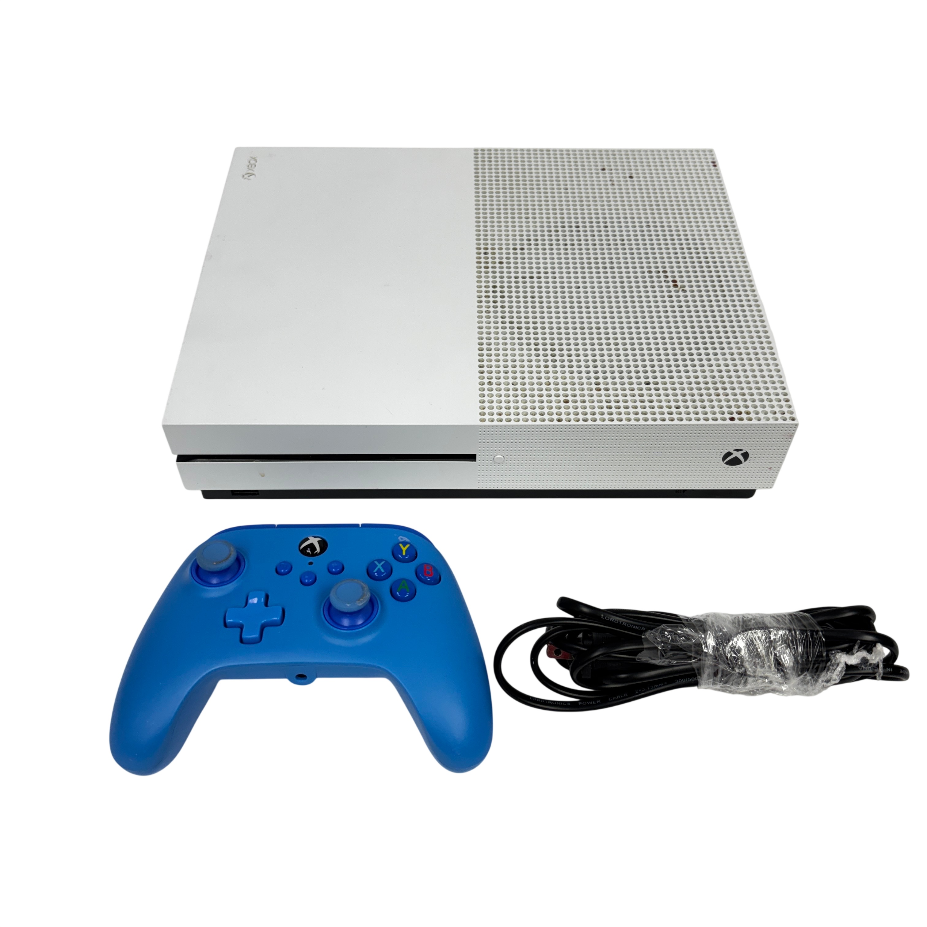 This Microsoft Xbox One S offers a sleek white design with 4K video streaming and HDR support, providing an immersive entertainment experience. This set includes a blue controller and power cable, making it ready for gaming right out of the box. With 500GB of storage, you can enjoy a vast library of games and media.