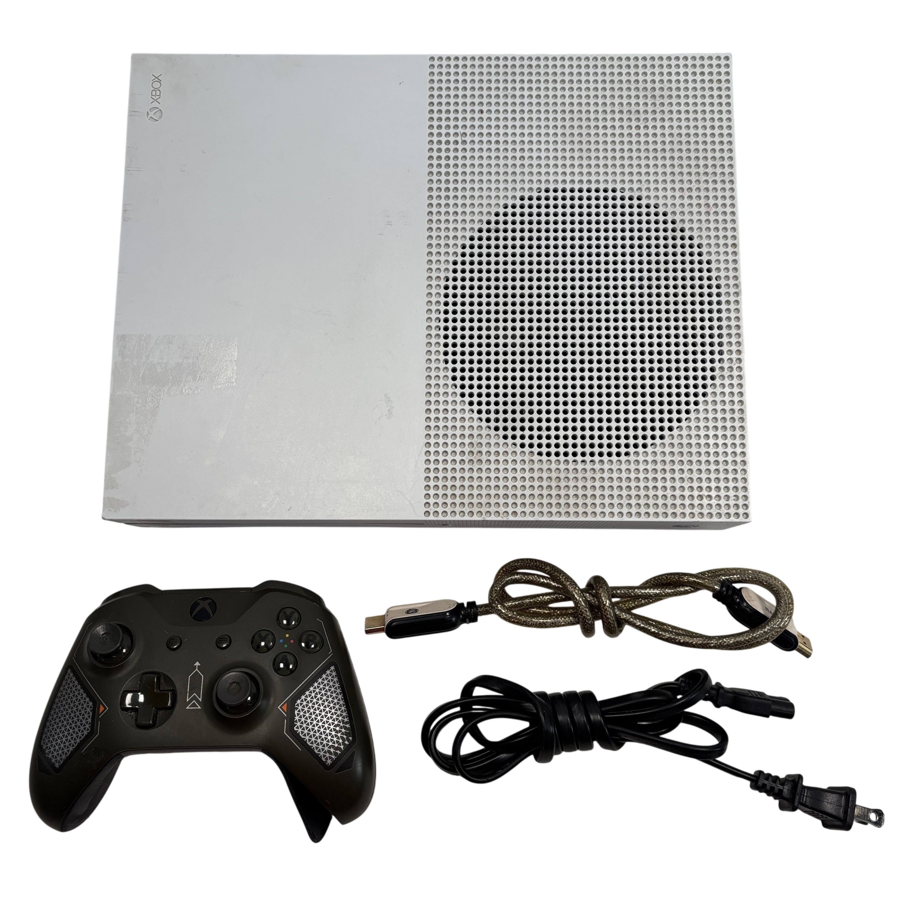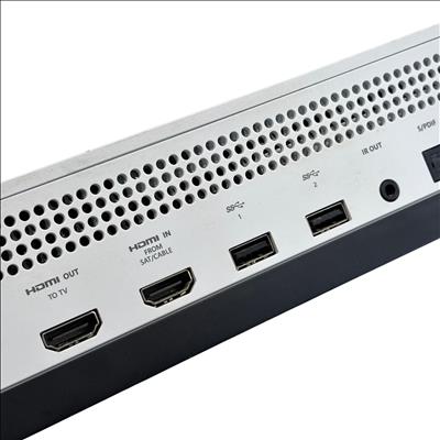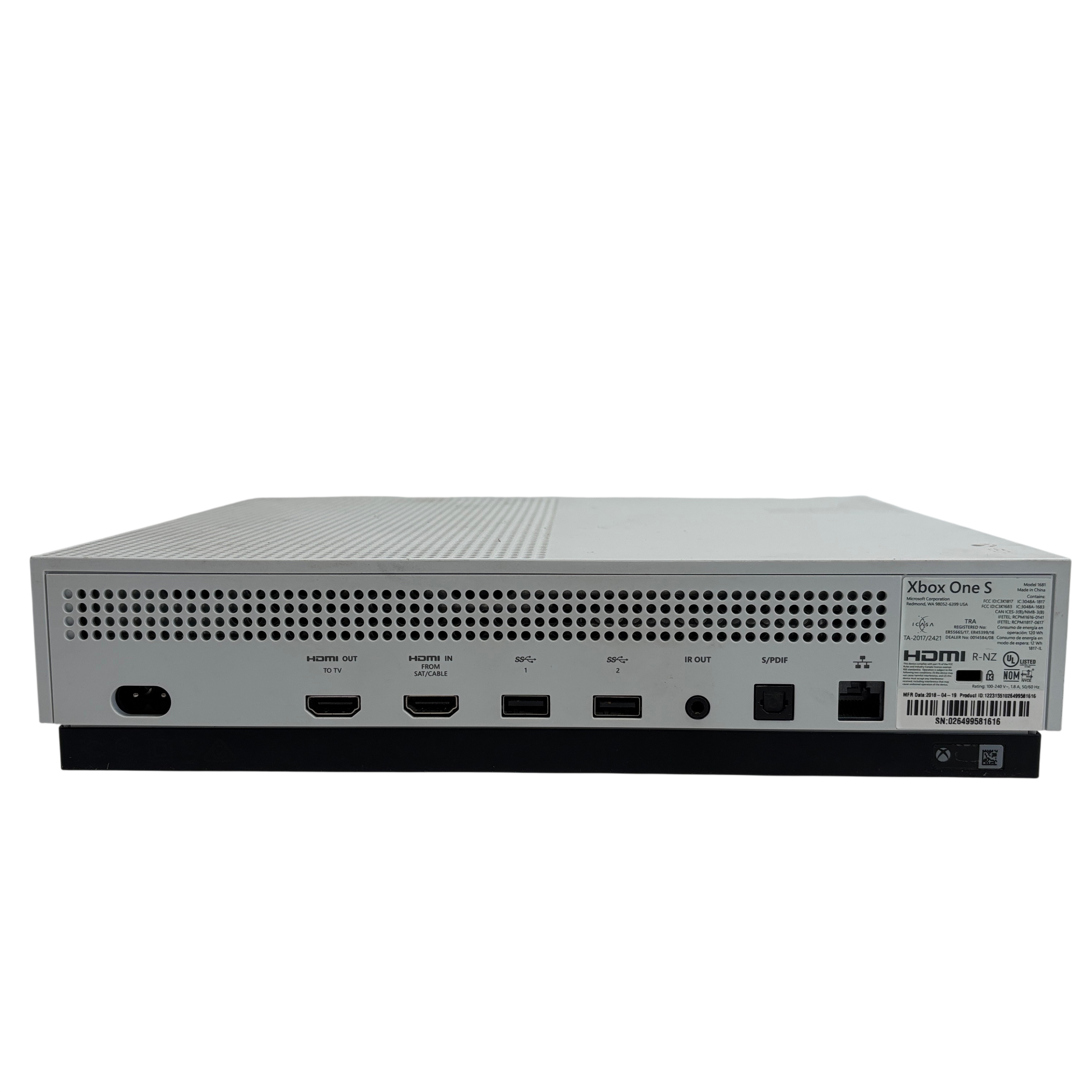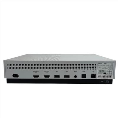 The Microsoft Xbox One S 1681 is a compact and efficient video game console designed for immersive gaming experiences. This package includes the Xbox One S console along with a wireless controller, power cable, and HDMI cable for easy setup. The console supports HDMI input and output, USB ports, and features 4K streaming capabilities. Its sleek white design fits well in any entertainment setup, offering reliable performance for gaming and media streaming.
