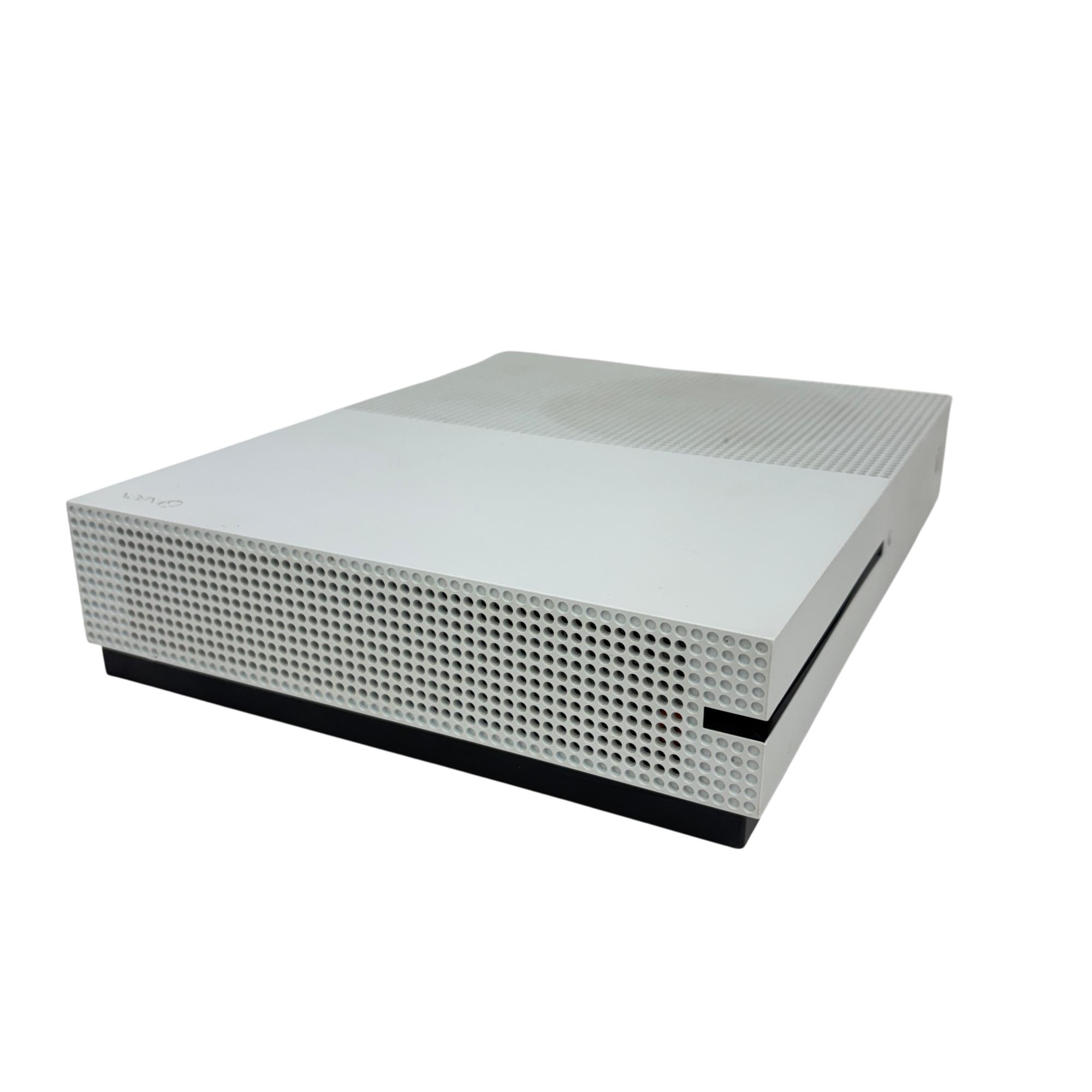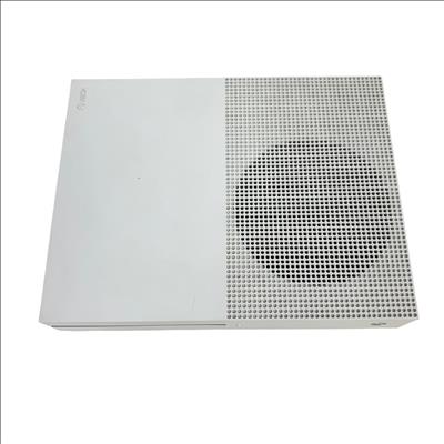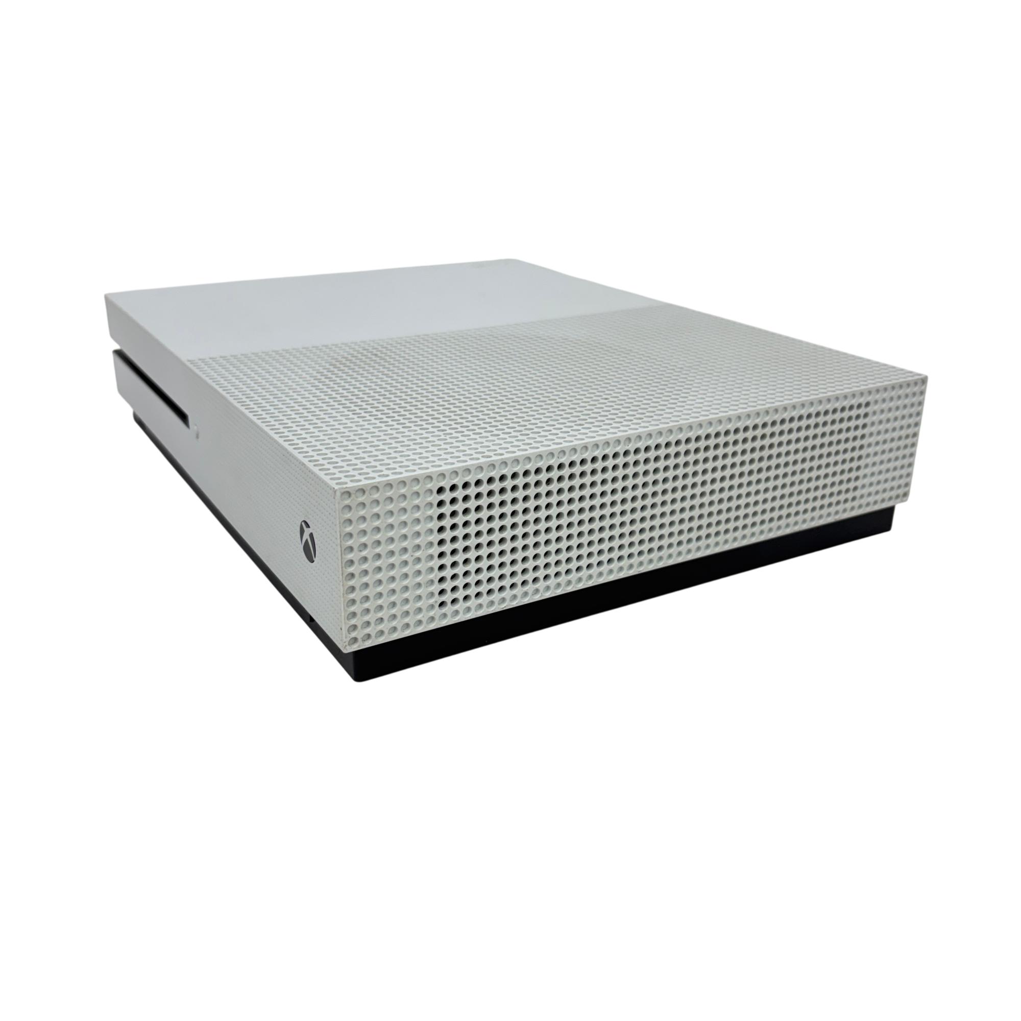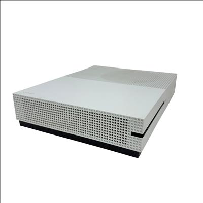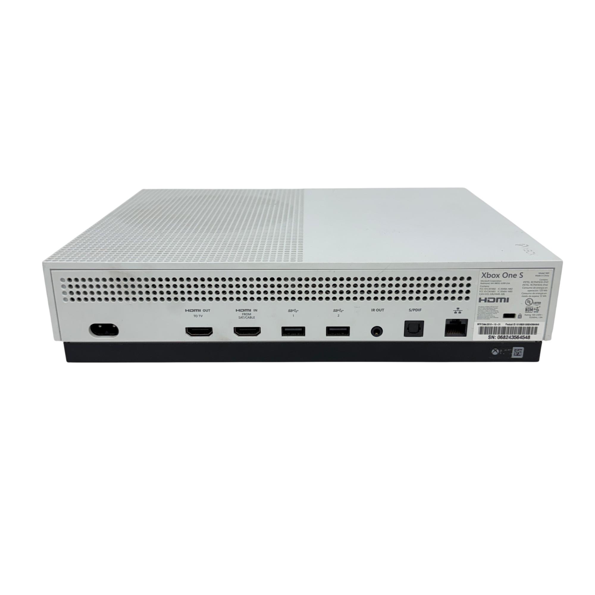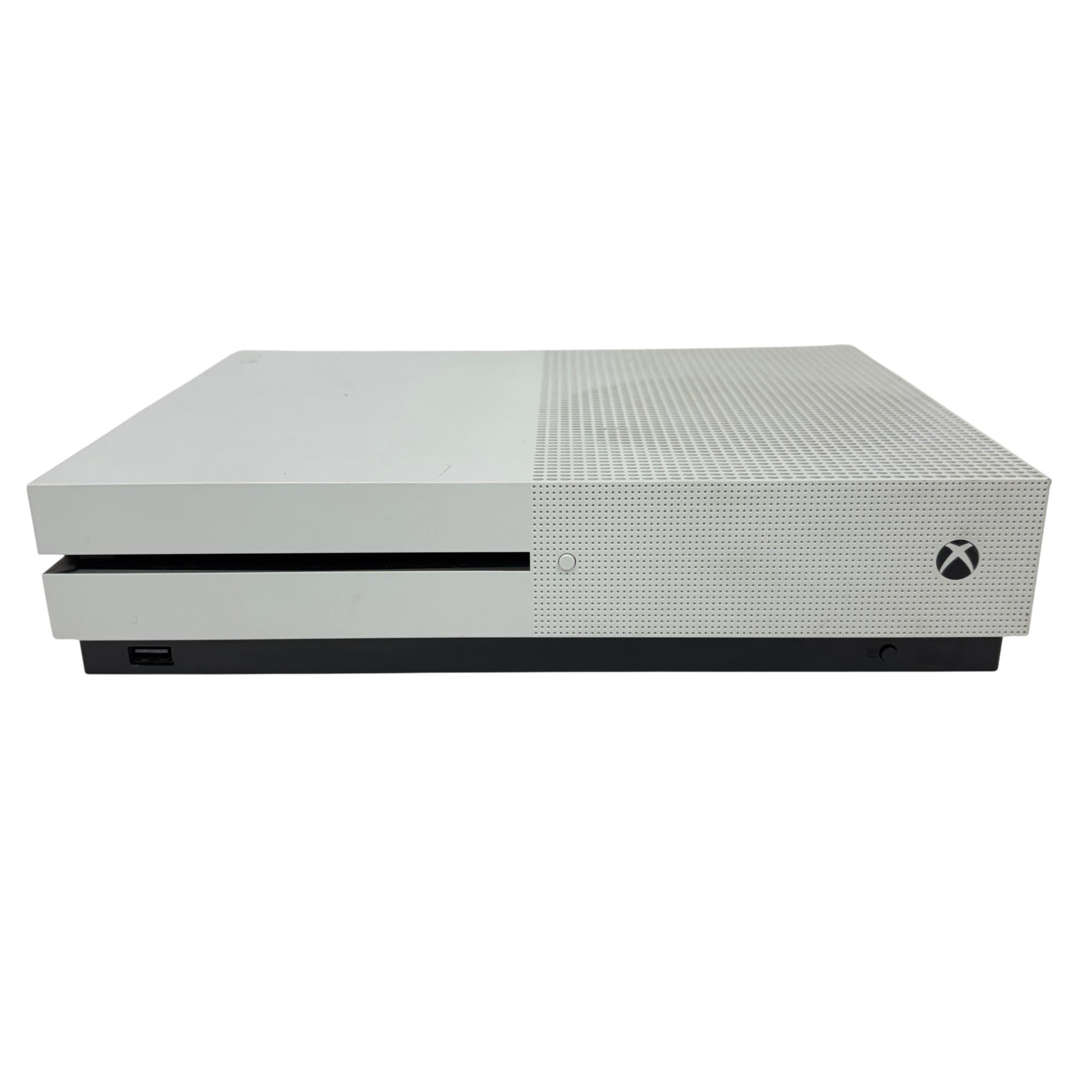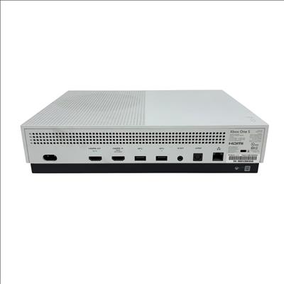 This Microsoft Xbox One S 500GB Console (Model 1681) offers a sleek white design with a compact rectangular body featuring ventilation holes for efficient cooling. This home video game console supports smooth gameplay and comes with a responsive black controller, delivering an immersive gaming experience ideal for a wide range of titles.
