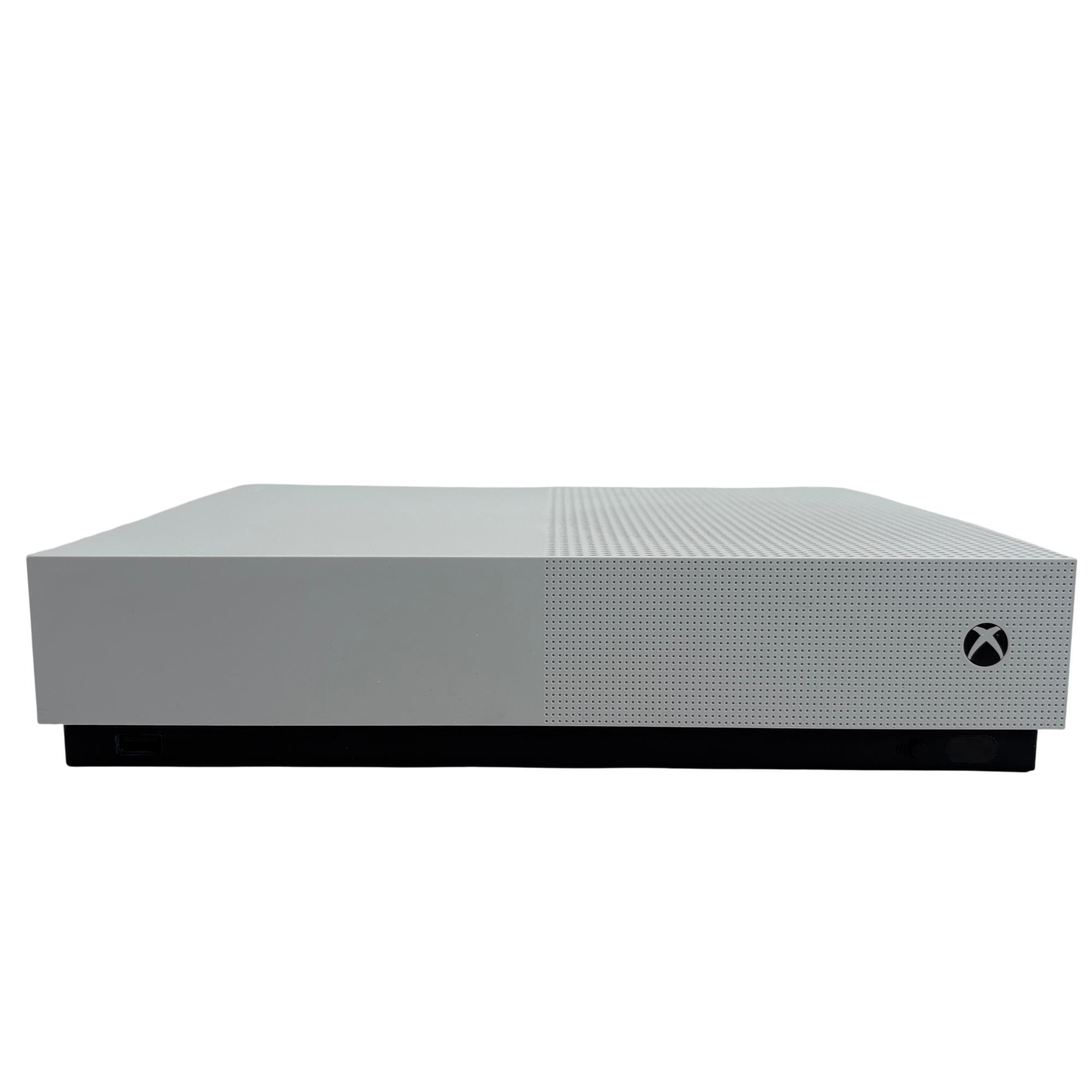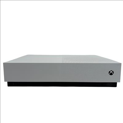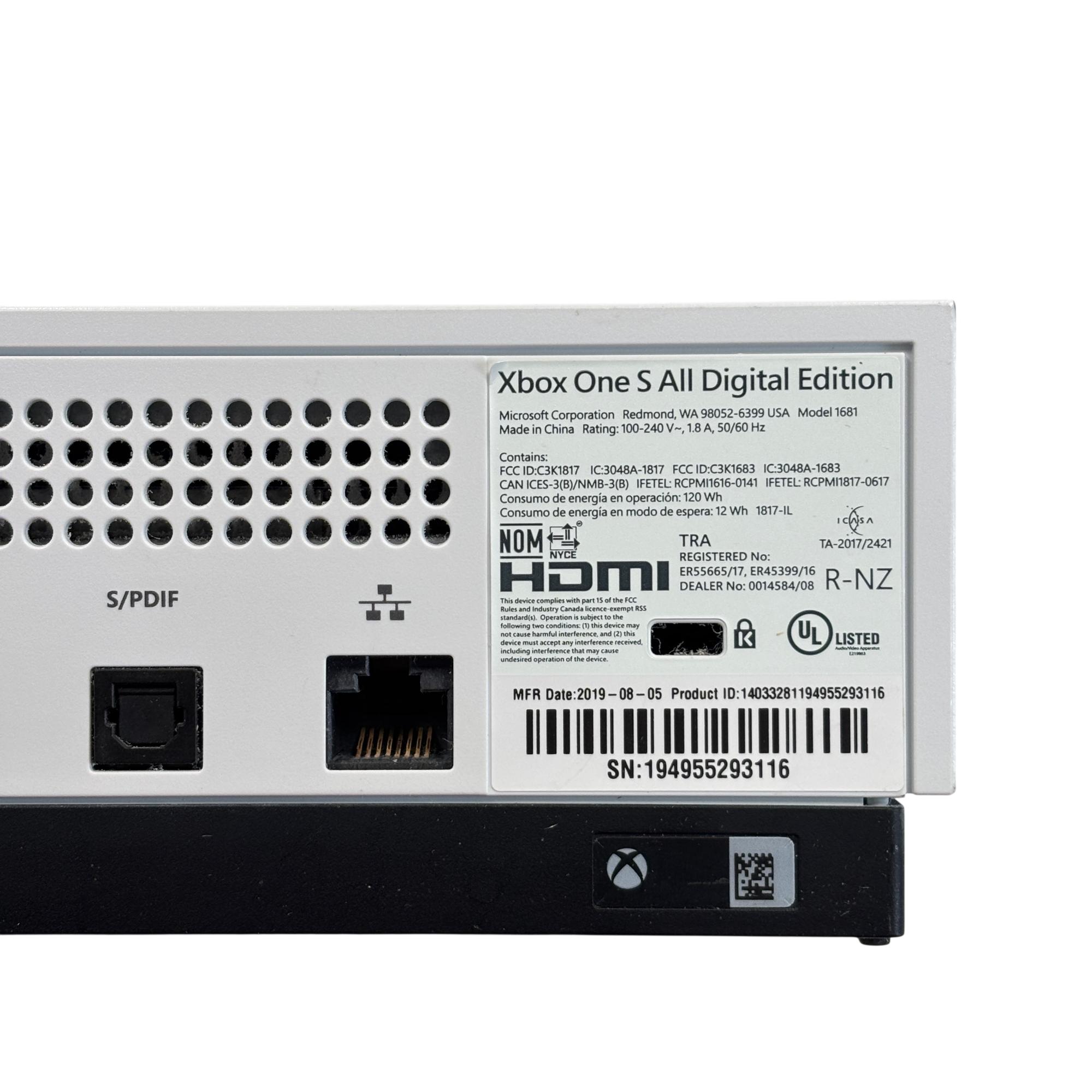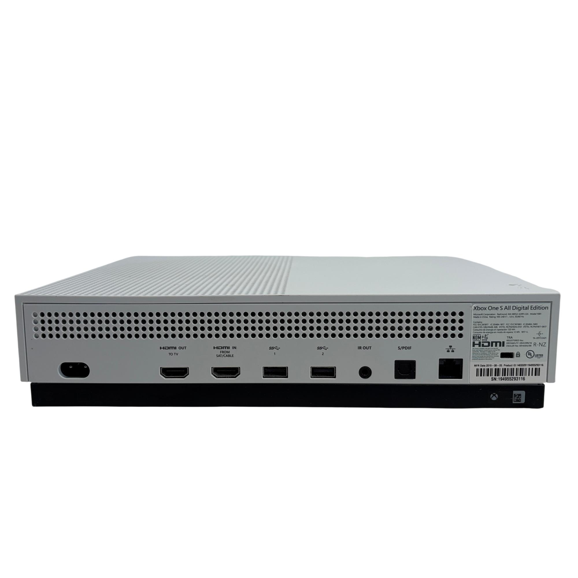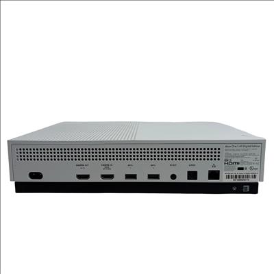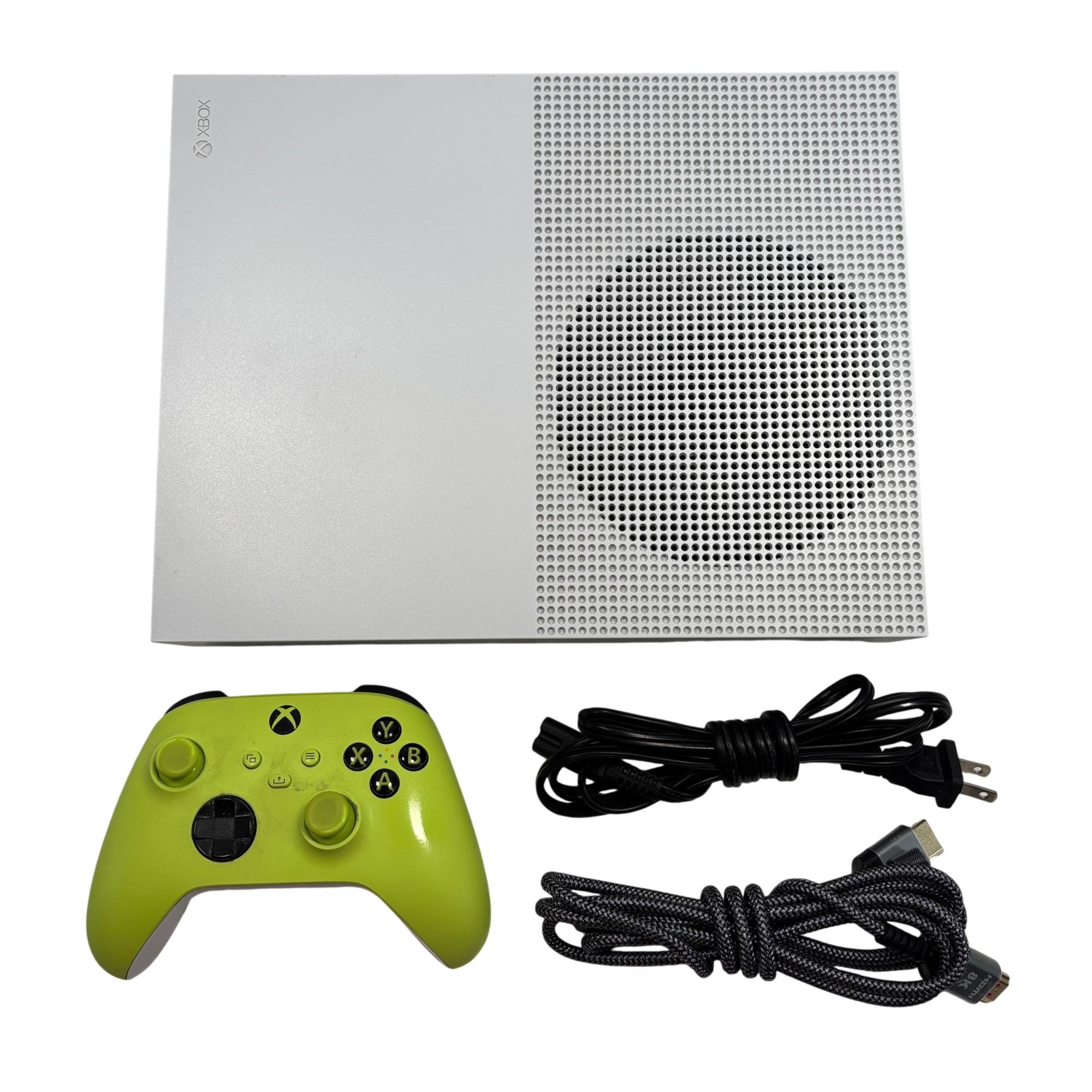 The Microsoft Xbox One S All Digital Edition 1681 features a sleek white design complemented by a vibrant neon green controller, providing an immersive gaming experience. This digital-only console includes multiple ports such as HDMI, Ethernet, and S/PDIF. Its compact rectangular form is designed for seamless integration into any entertainment setup, delivering reliable performance and digital gaming capabilities.