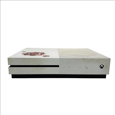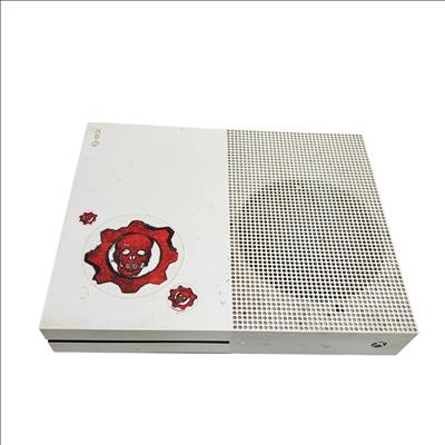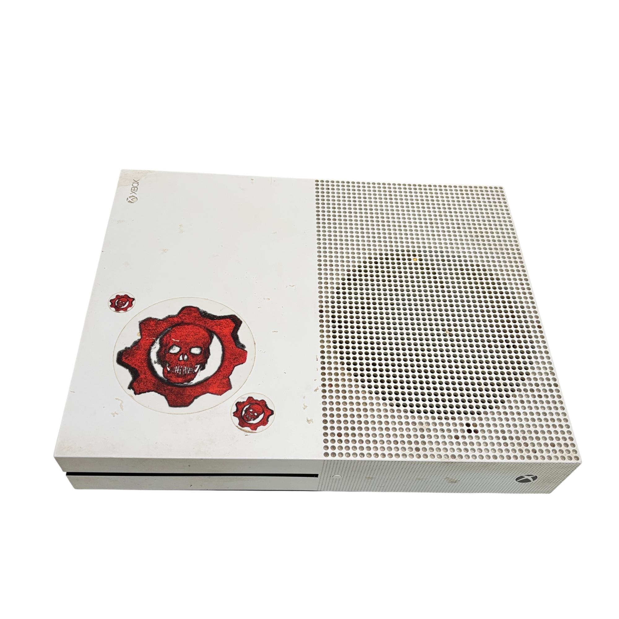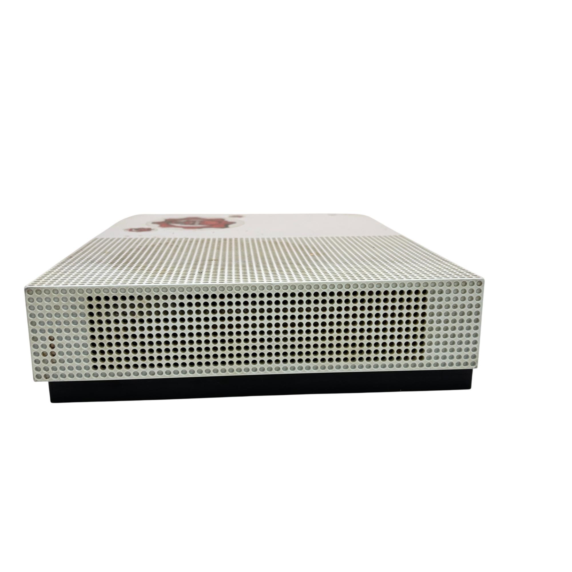 Microsoft Xbox One S 1681 500GB White Console with Controller features a sleek white design accented by a custom red skull graphic, making it a distinctive addition to any gaming setup. This model combines compact form factor with powerful performance, supporting a wide range of games and multimedia applications for immersive entertainment.