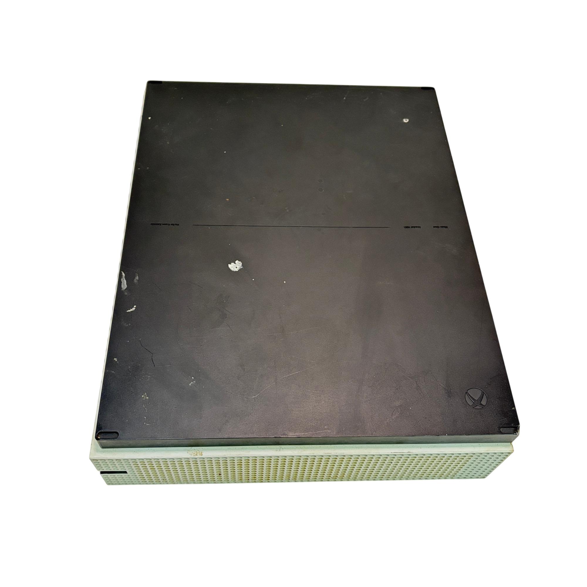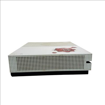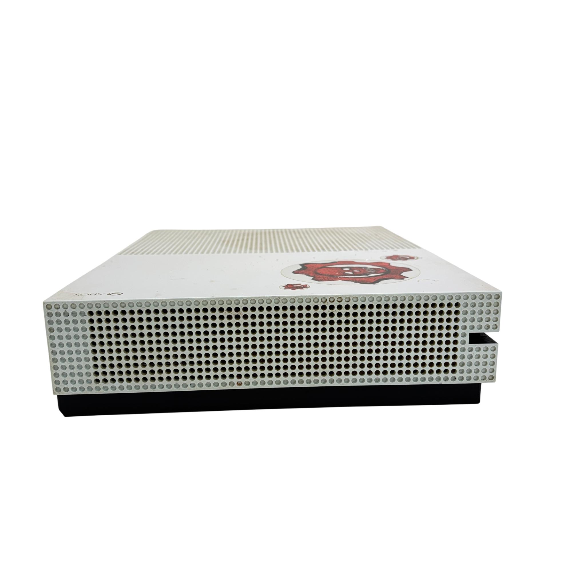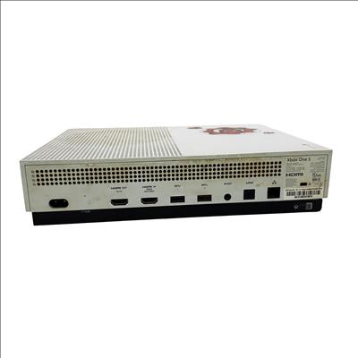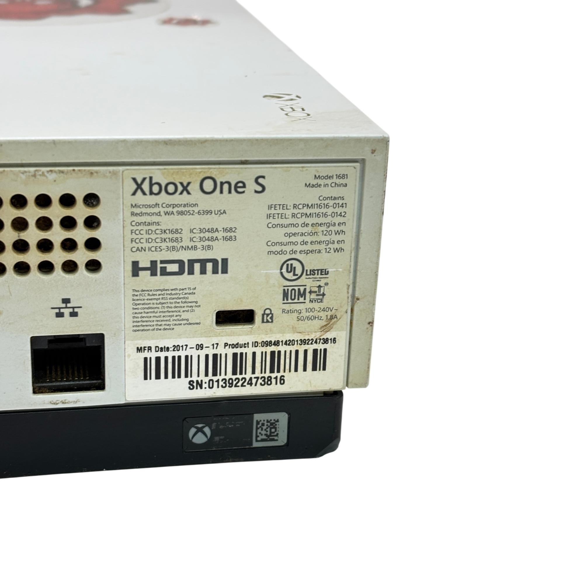Microsoft Xbox One S 1681 500GB White Console with Controller features a sleek white design accented by a custom red skull graphic, making it a distinctive addition to any gaming setup. This model combines compact form factor with powerful performance, supporting a wide range of games and multimedia applications for immersive entertainment.