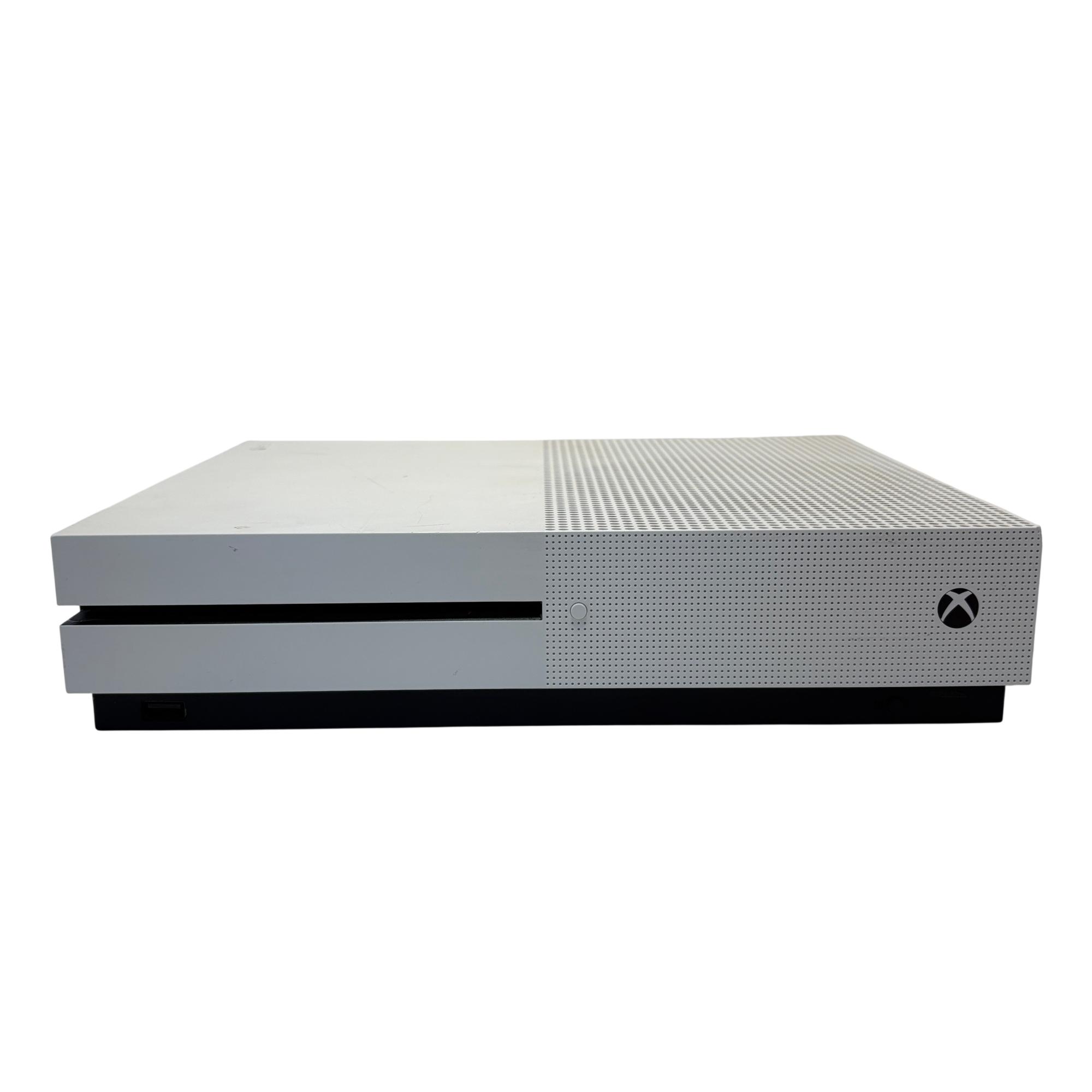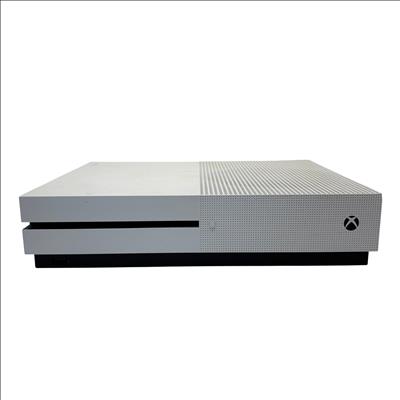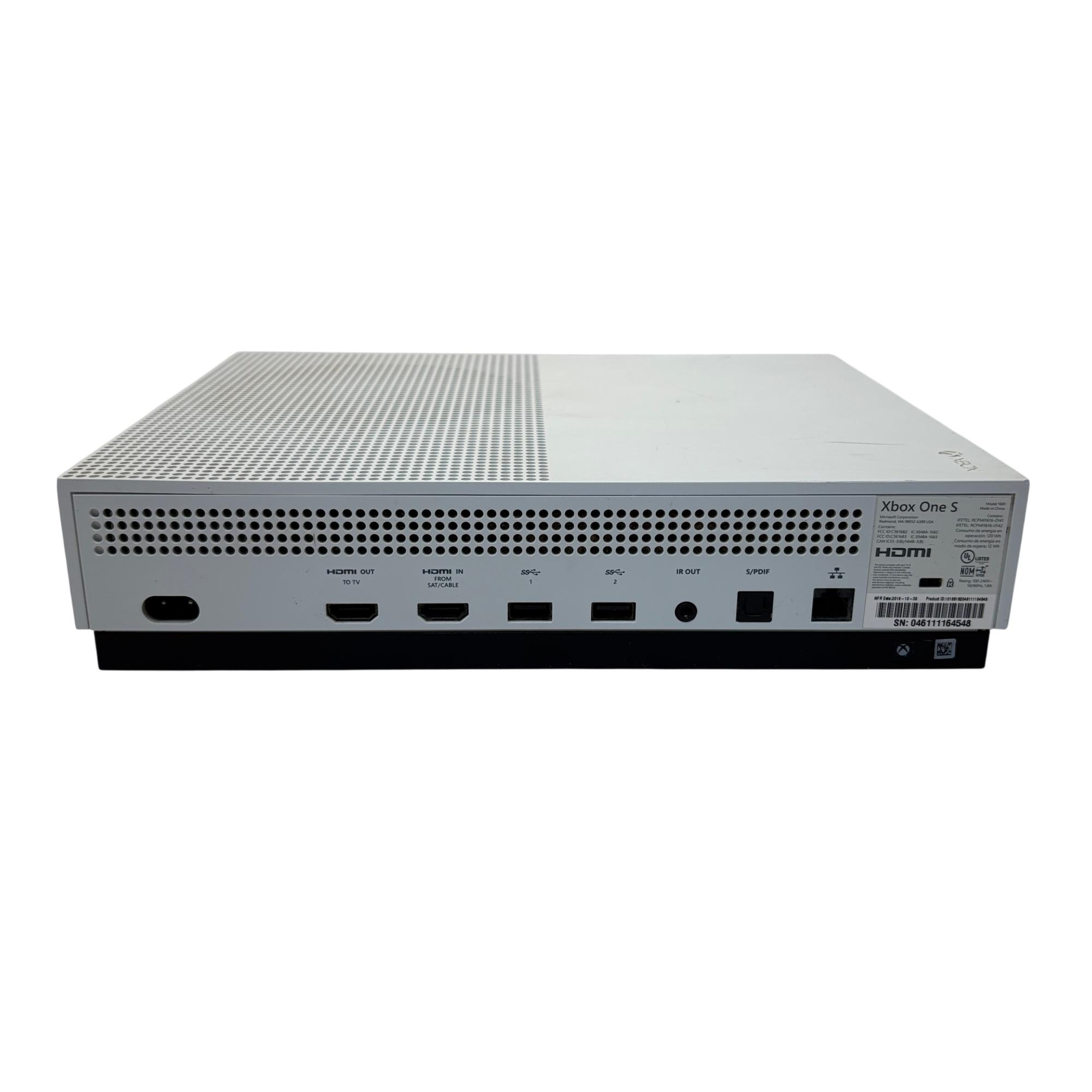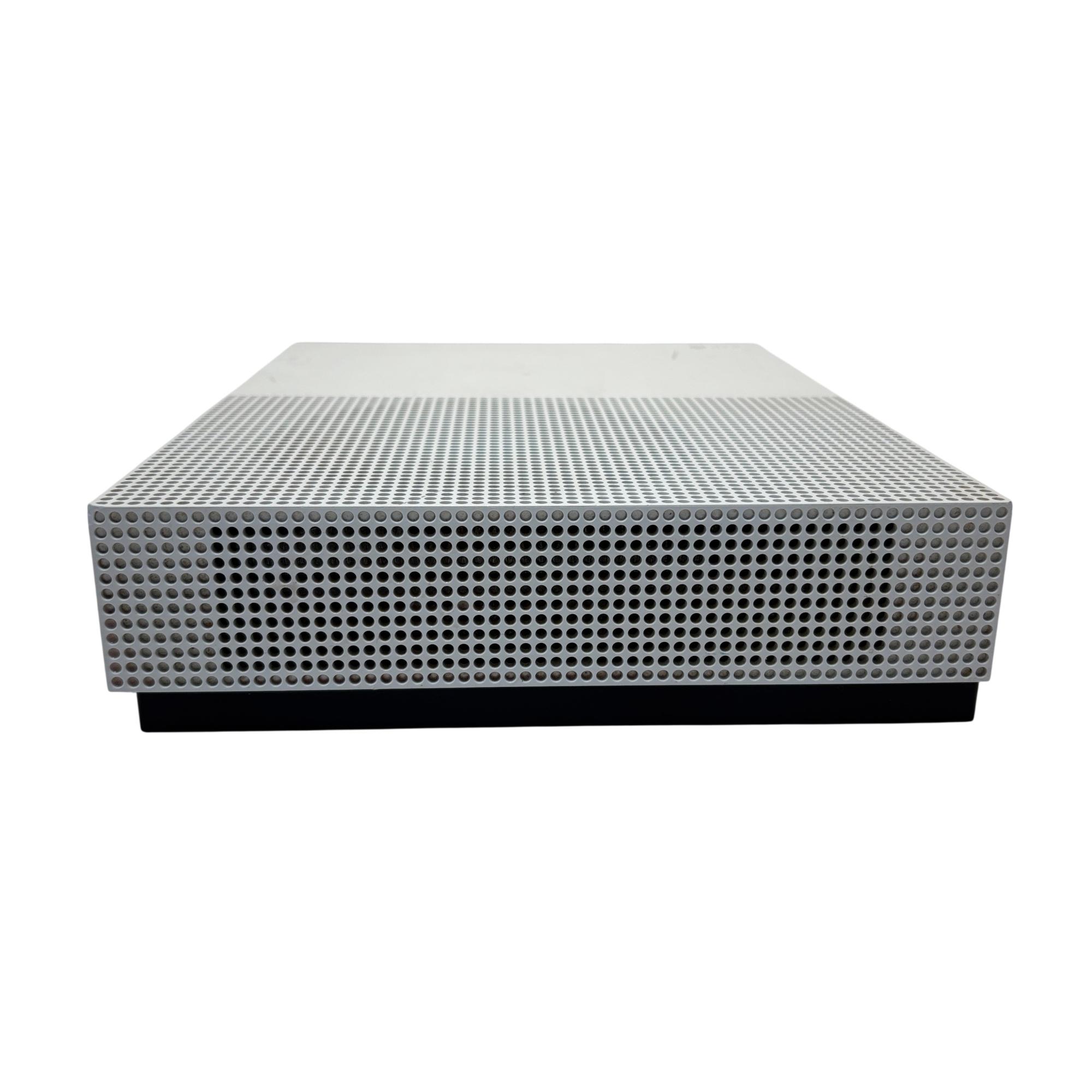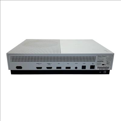 The Microsoft Xbox One S video game console features a sleek white design with multiple connectivity ports including HDMI input and output. This compact console supports high-definition gaming and media playback, delivering a seamless entertainment experience with a modern, user-friendly interface.