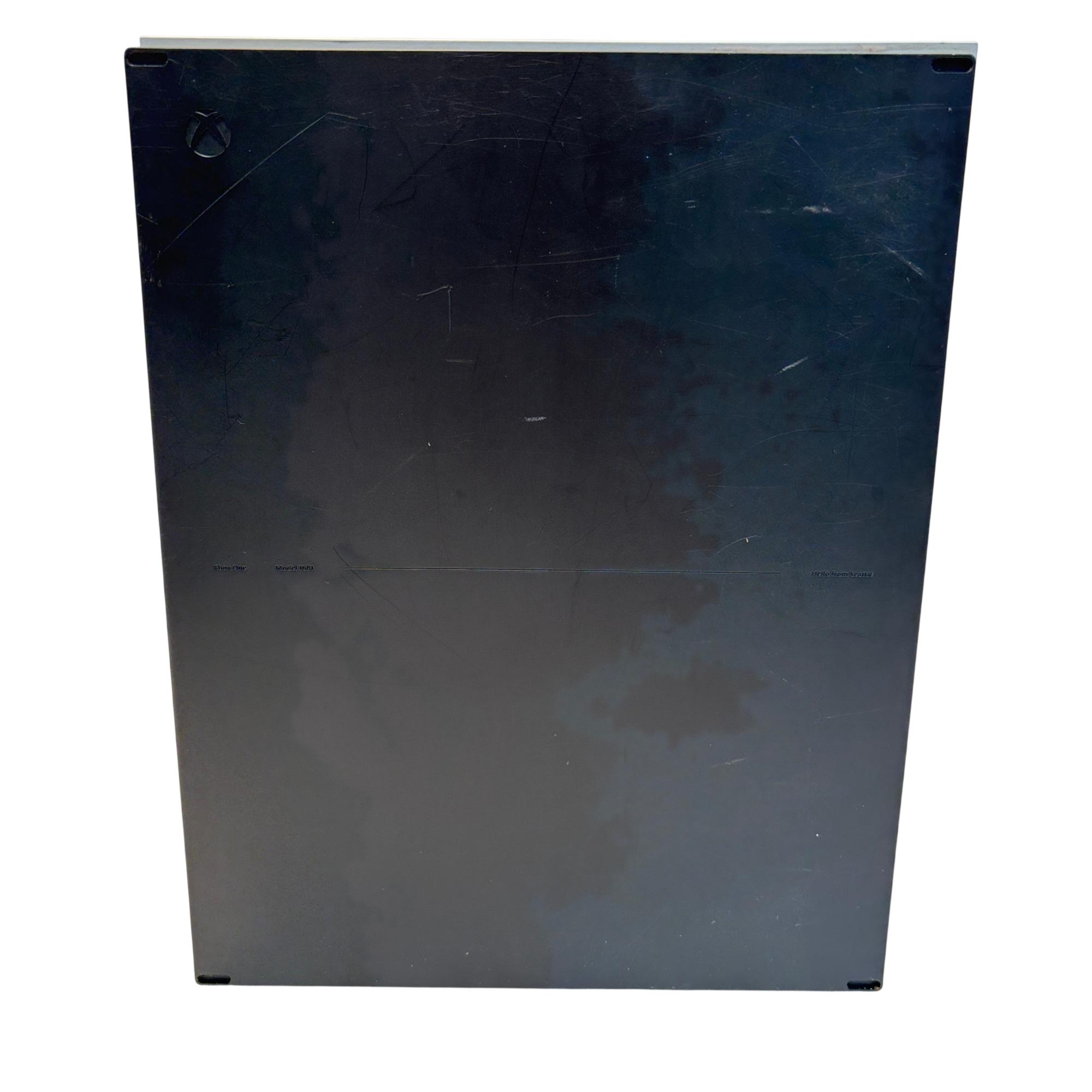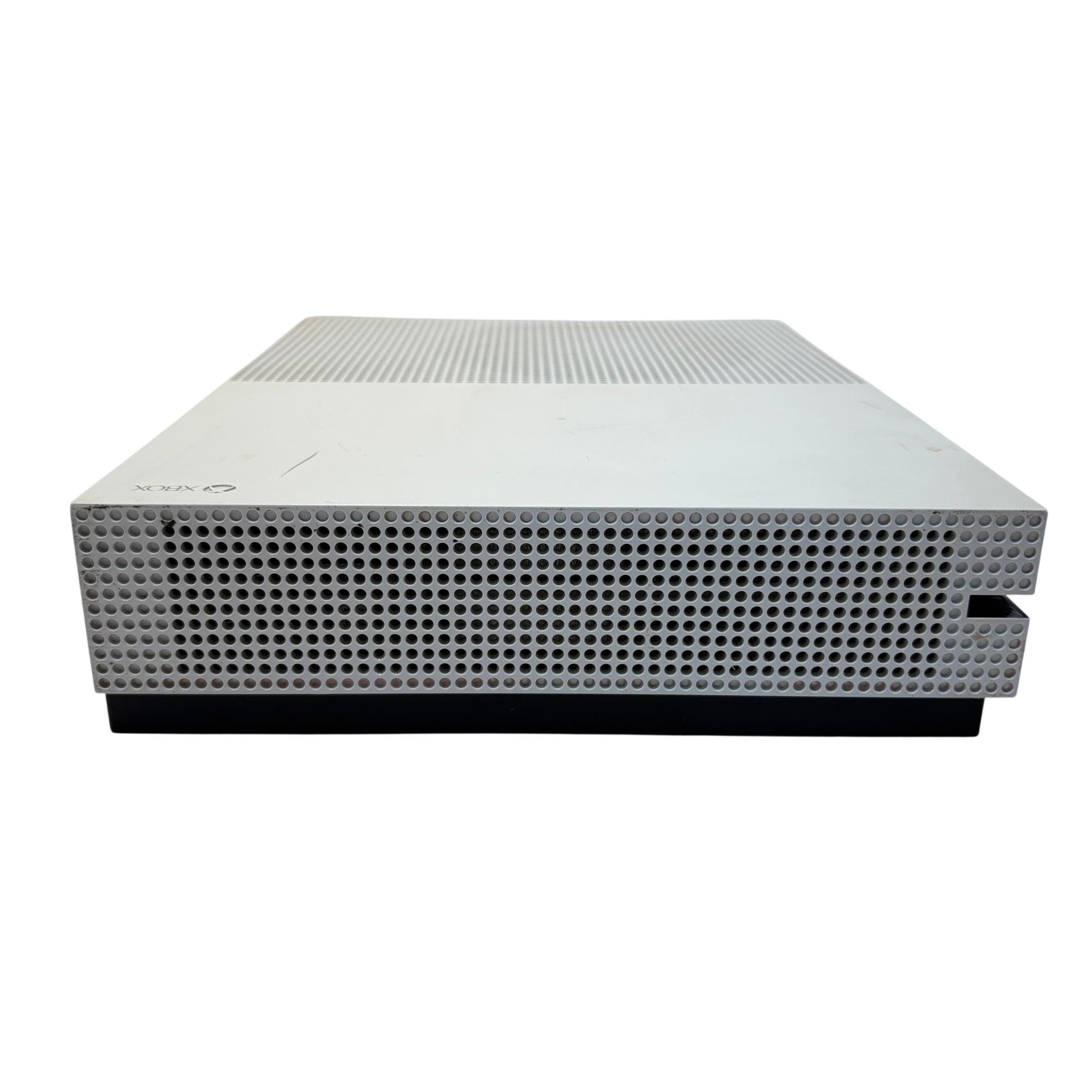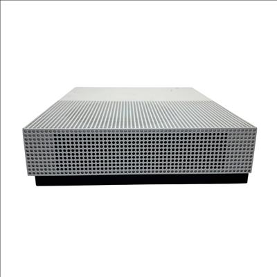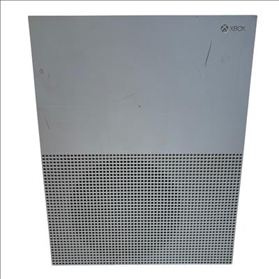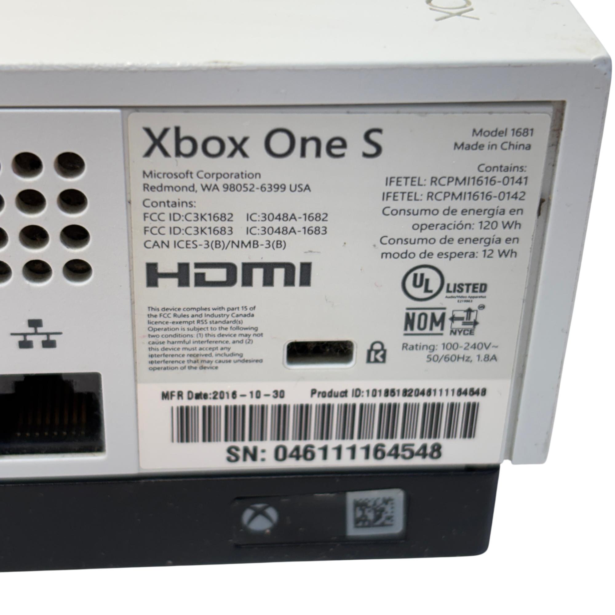 The Microsoft Xbox One S video game console features a sleek white design with multiple connectivity ports including HDMI input and output. This compact console supports high-definition gaming and media playback, delivering a seamless entertainment experience with a modern, user-friendly interface.