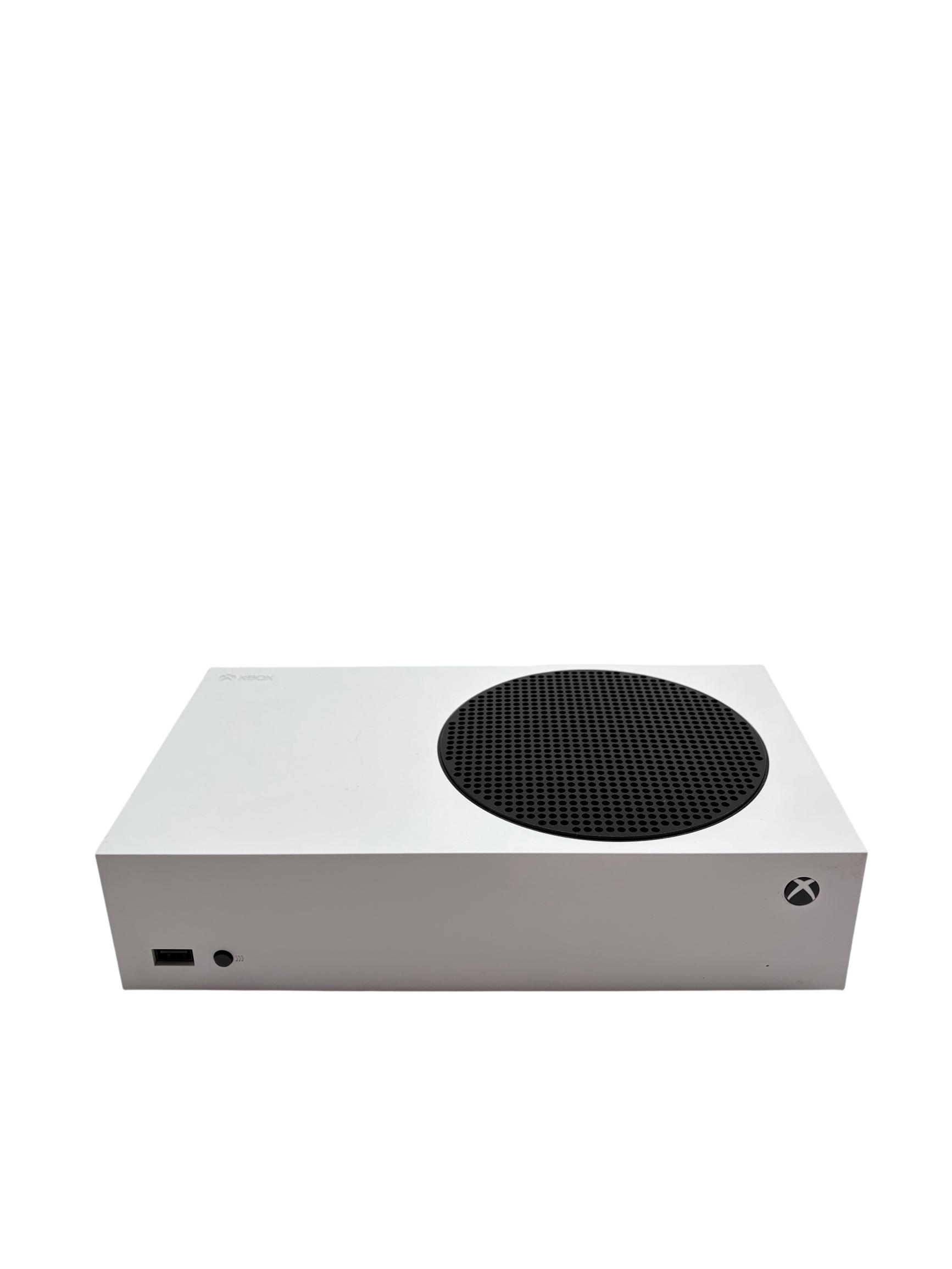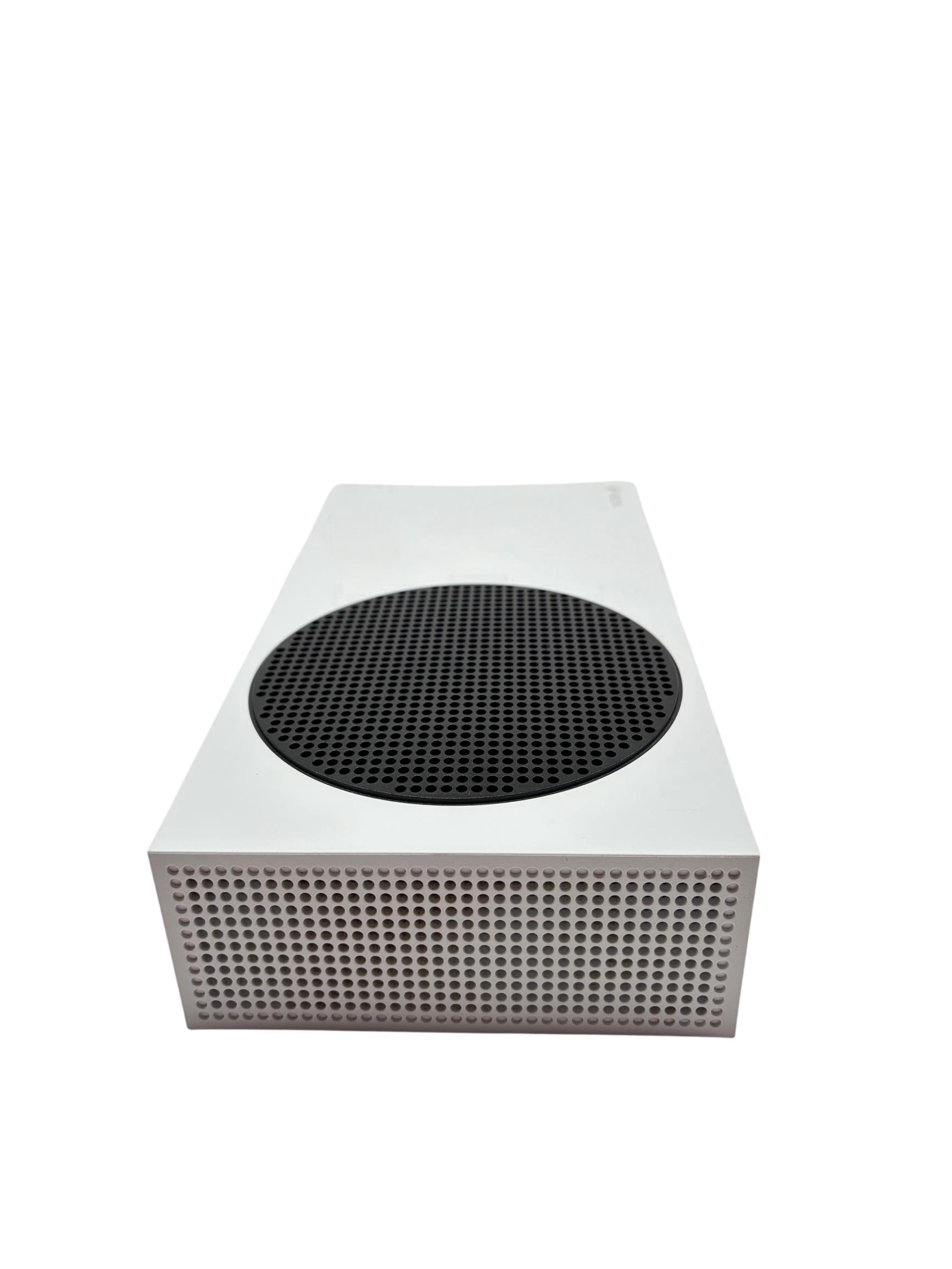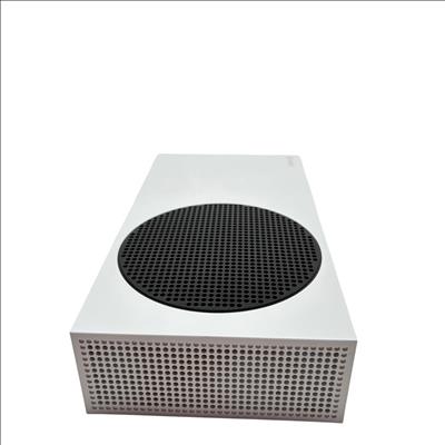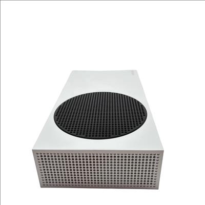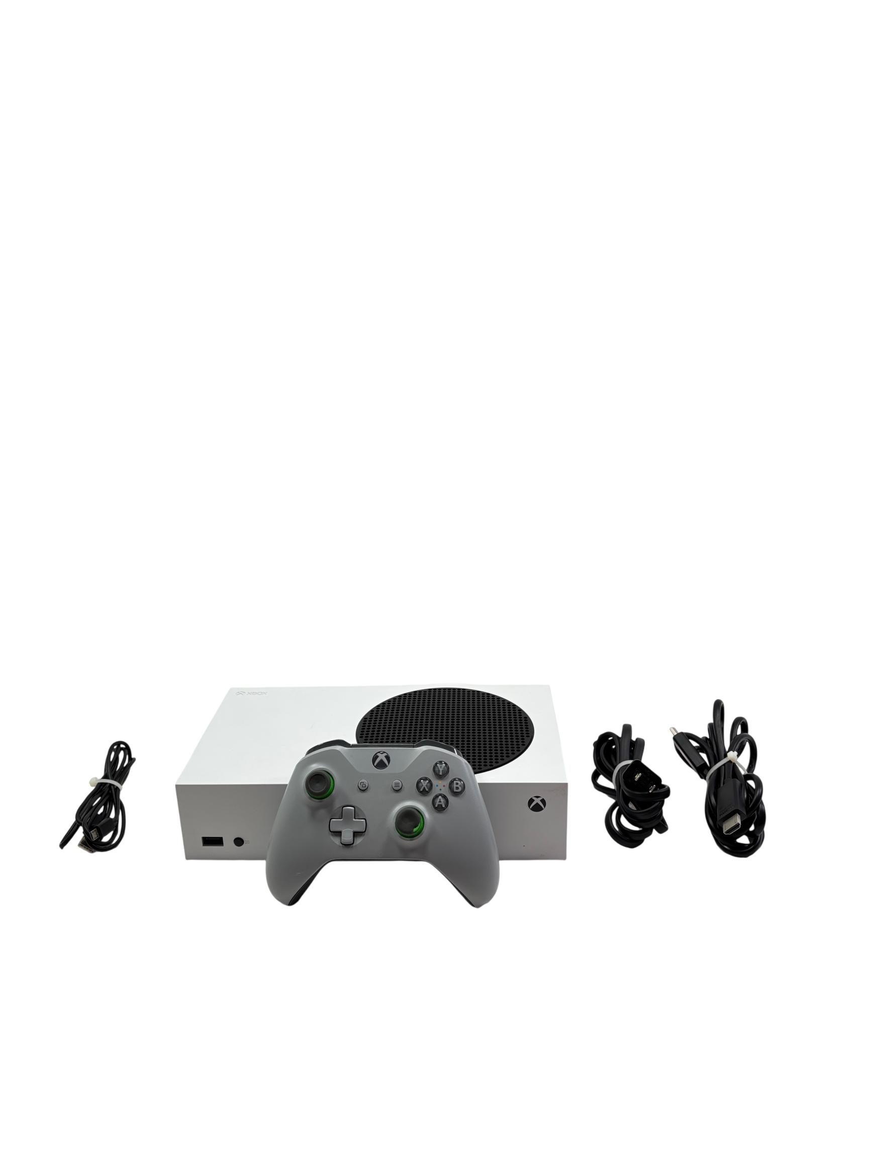 Microsoft Xbox Series S Console with Gray Wireless Controller offers a compact, high-performance gaming experience with sleek white casing and a distinctive black circular vent design. The console features advanced processing capabilities for seamless gameplay, paired with an ergonomically designed wireless controller in a stylish grey and green color scheme optimized for comfort and precision control.