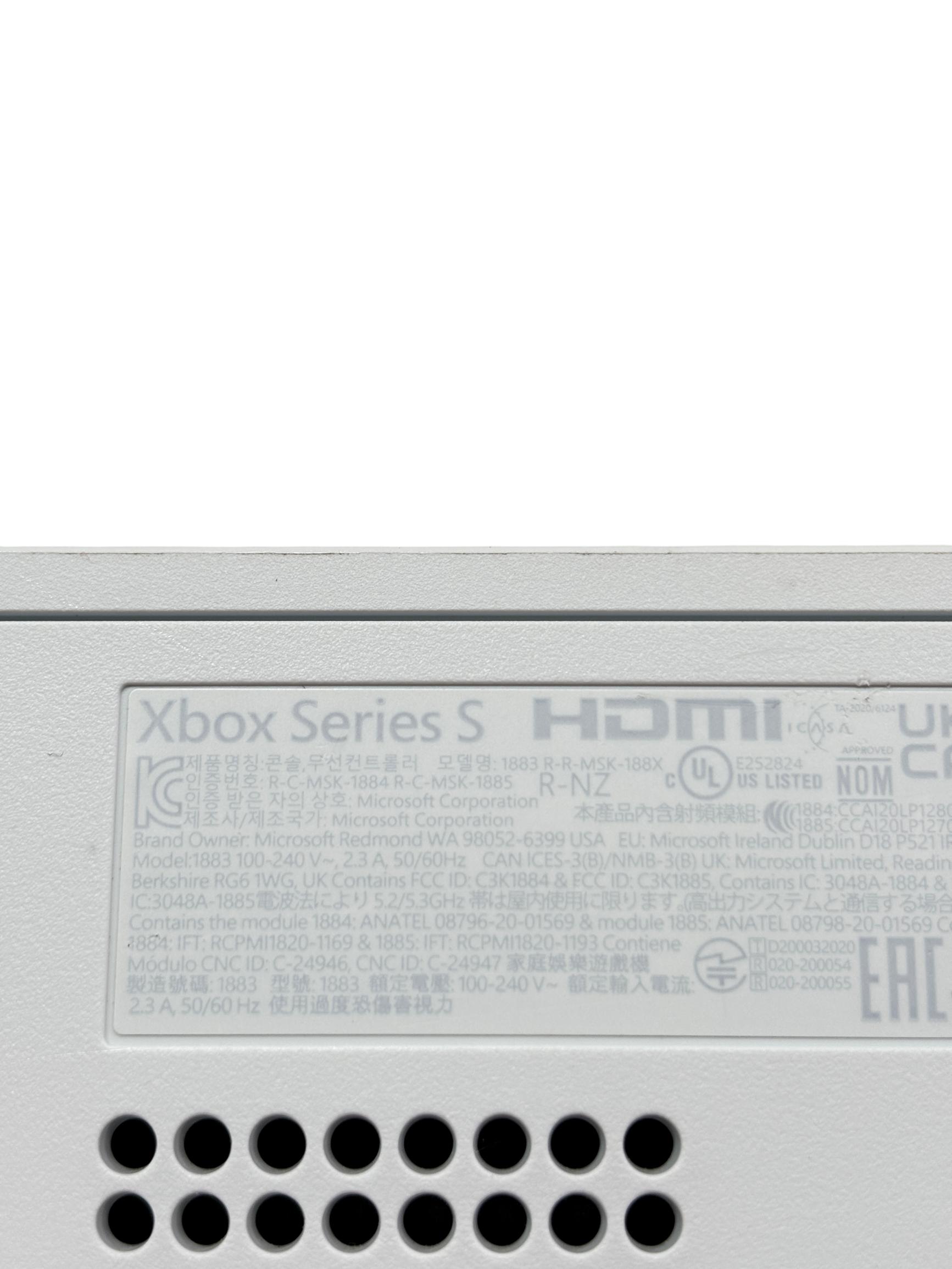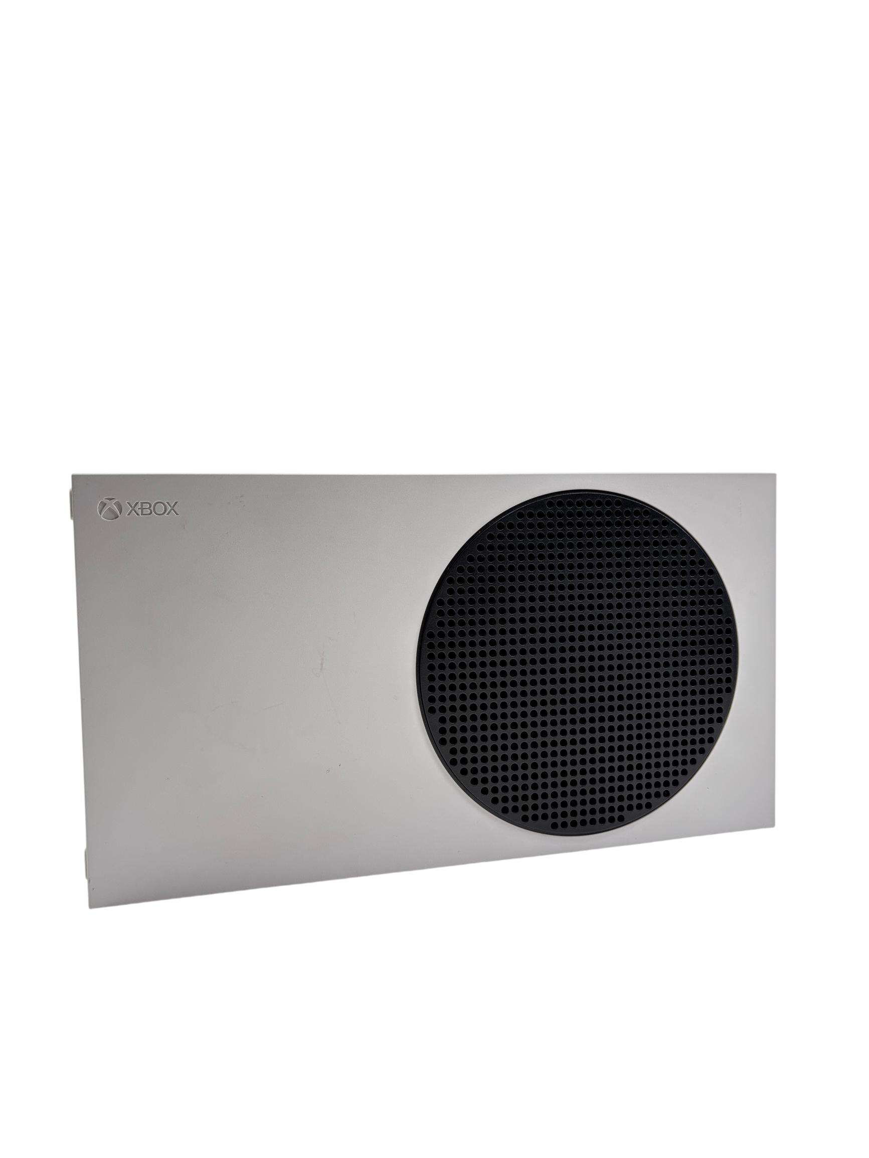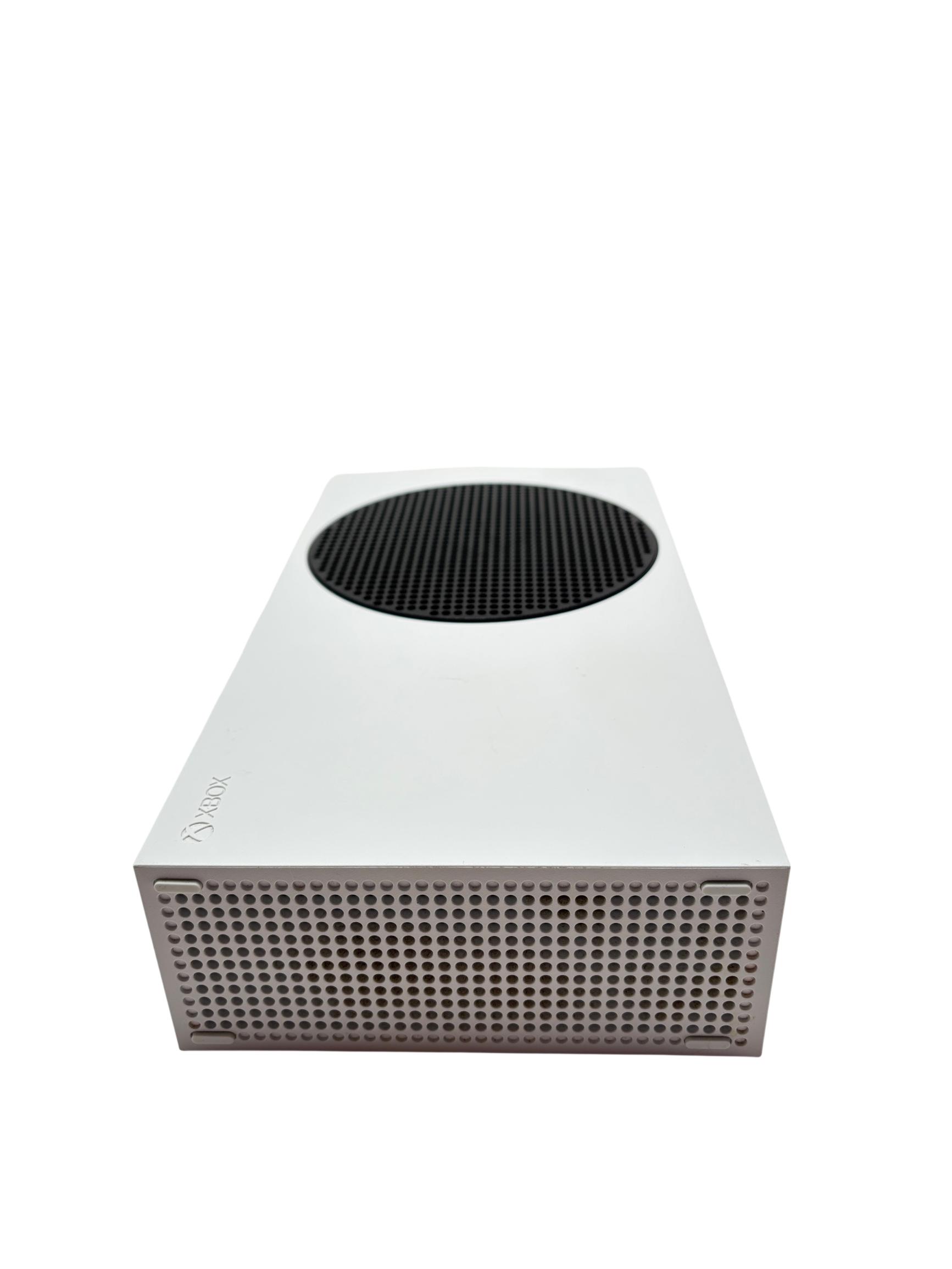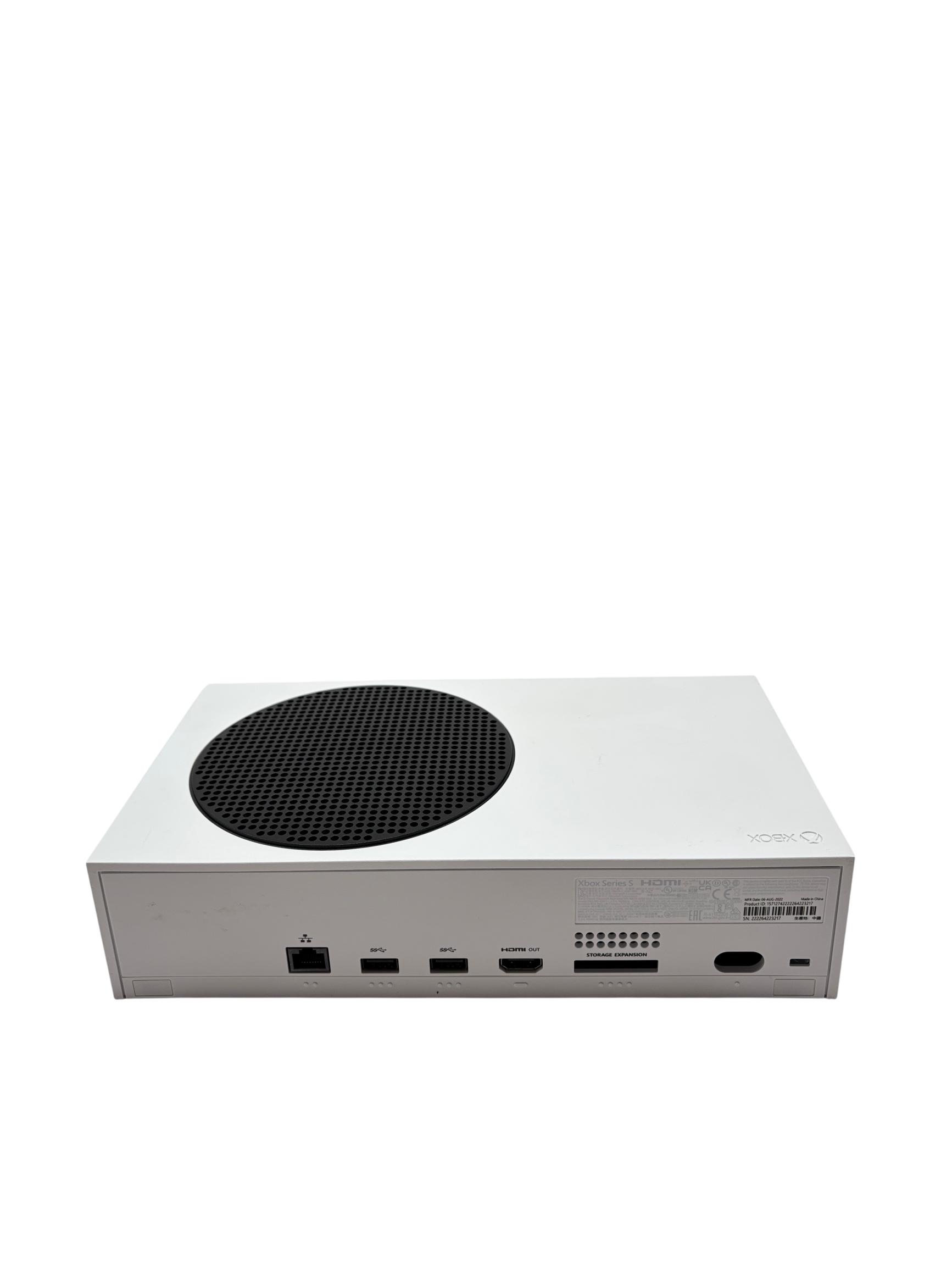 Microsoft Xbox Series S Console with Gray Wireless Controller offers a compact, high-performance gaming experience with sleek white casing and a distinctive black circular vent design. The console features advanced processing capabilities for seamless gameplay, paired with an ergonomically designed wireless controller in a stylish grey and green color scheme optimized for comfort and precision control.