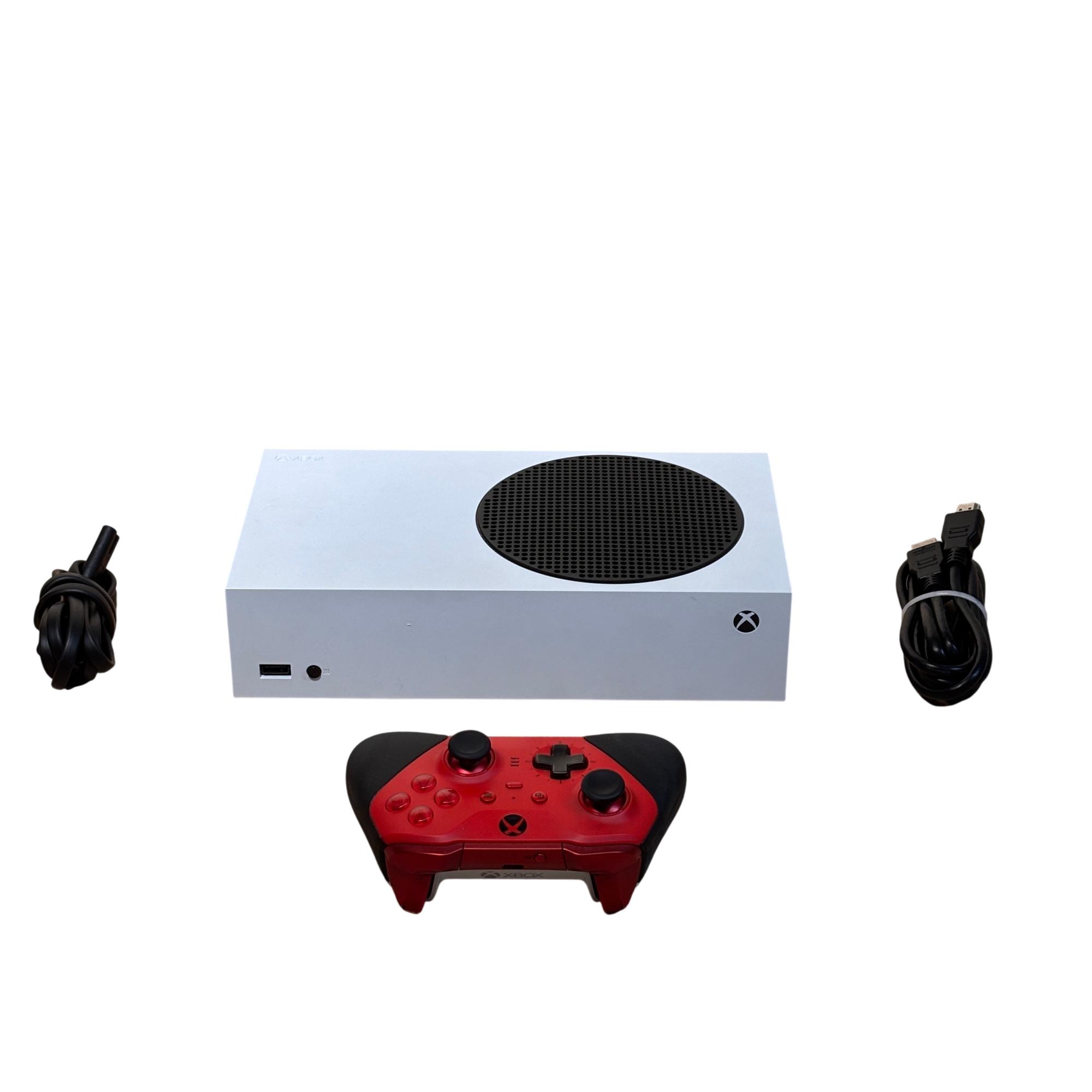 Microsoft Xbox Series S 1883 is a compact all-digital gaming console featuring 512GB of internal storage and an elegant white design with a distinctive black circular detail on top. It delivers next-generation performance optimized for seamless gameplay and quick load times, complemented by a red Elite wireless controller and versatile storage expansion options.