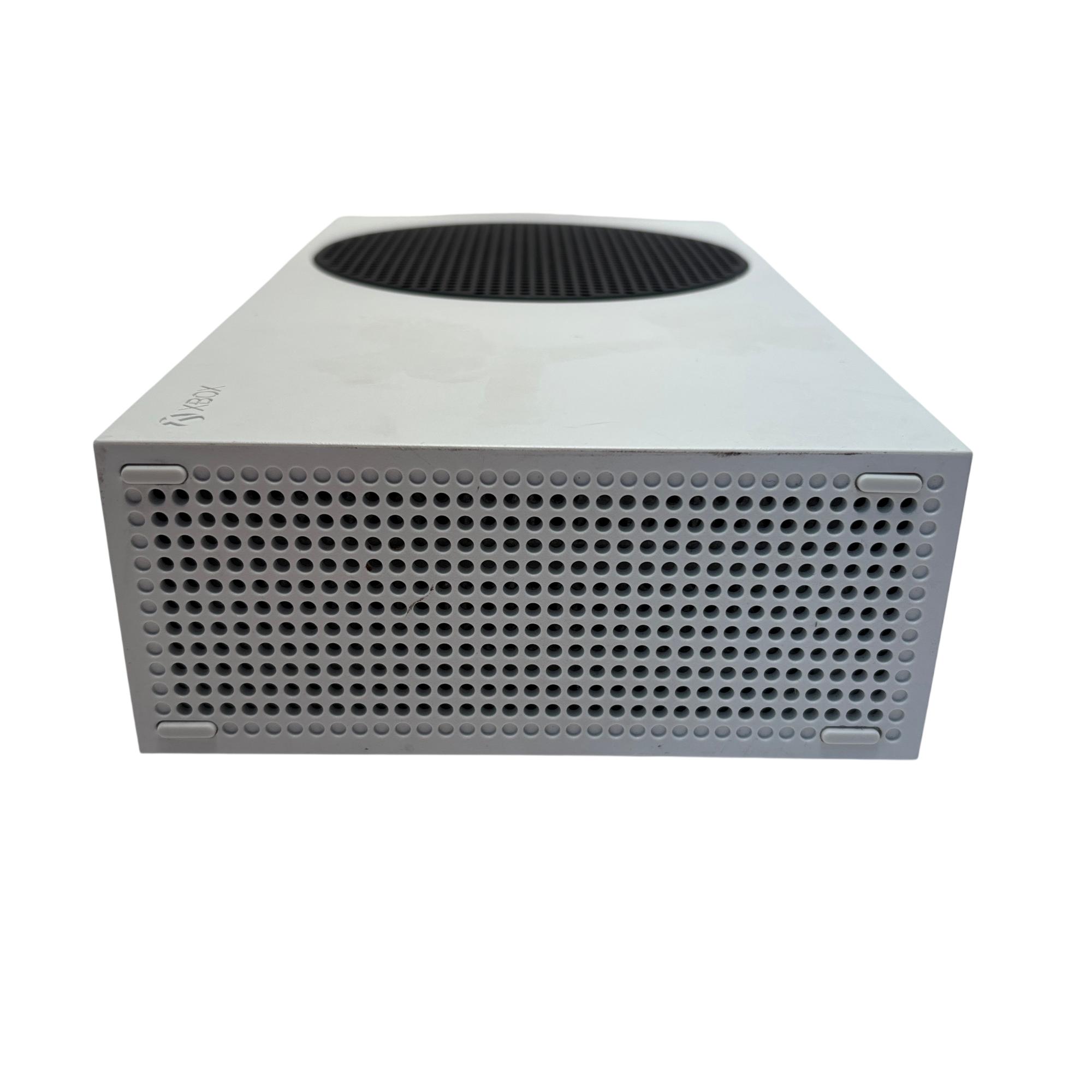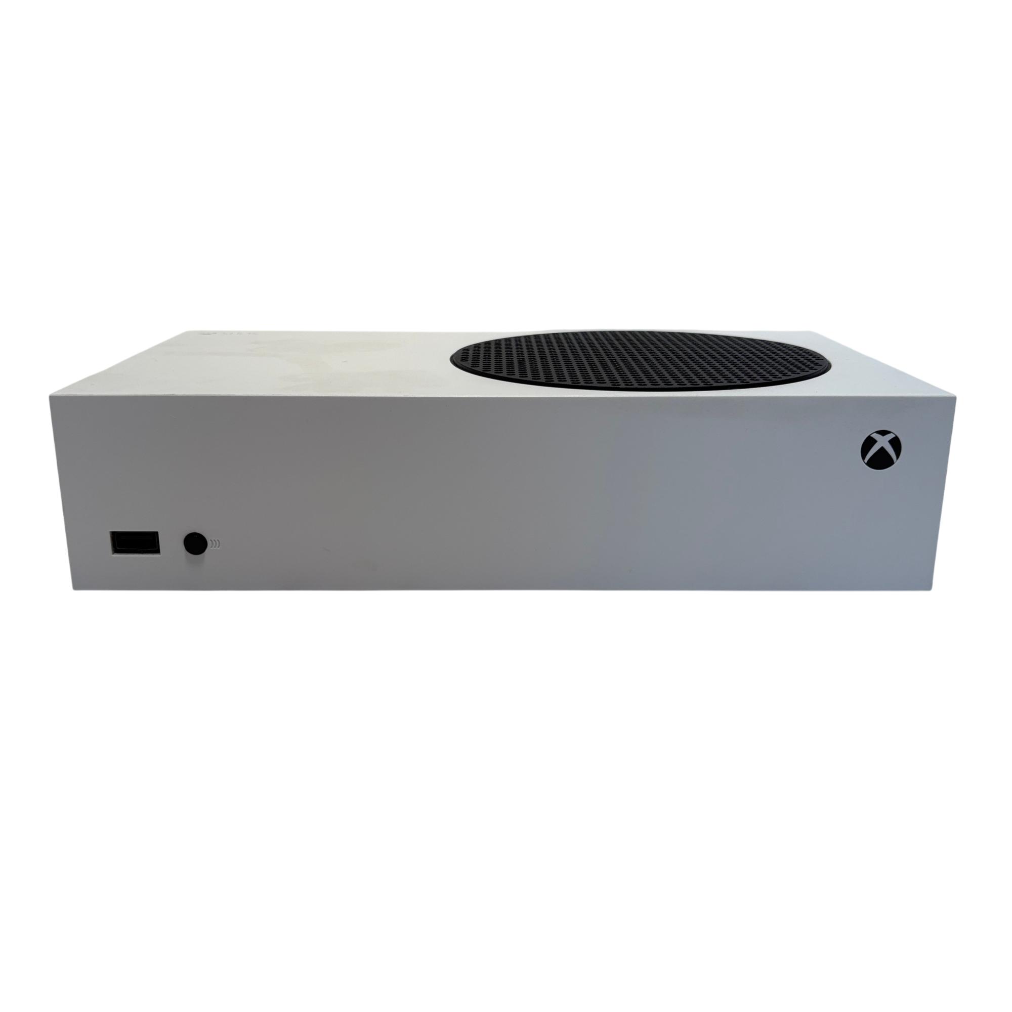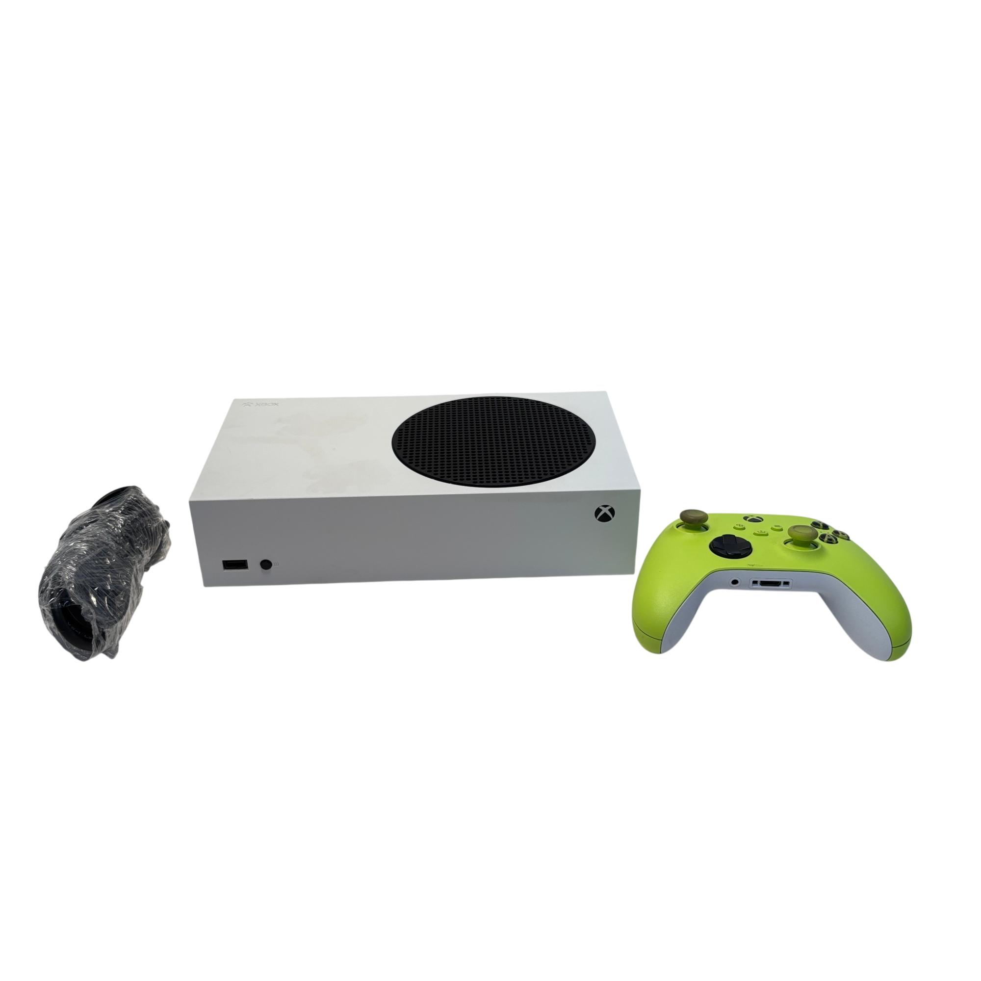 The Microsoft Xbox Series S Digital Edition Console with Green Controller offers a sleek, compact design with a white rectangular body featuring a distinct black vent and circular accent. This all-digital console delivers next-generation gaming performance with ample 512GB storage and HDMI output, optimized for seamless gameplay and fast load times. Its modern aesthetic complements any entertainment setup while providing an immersive digital gaming experience.