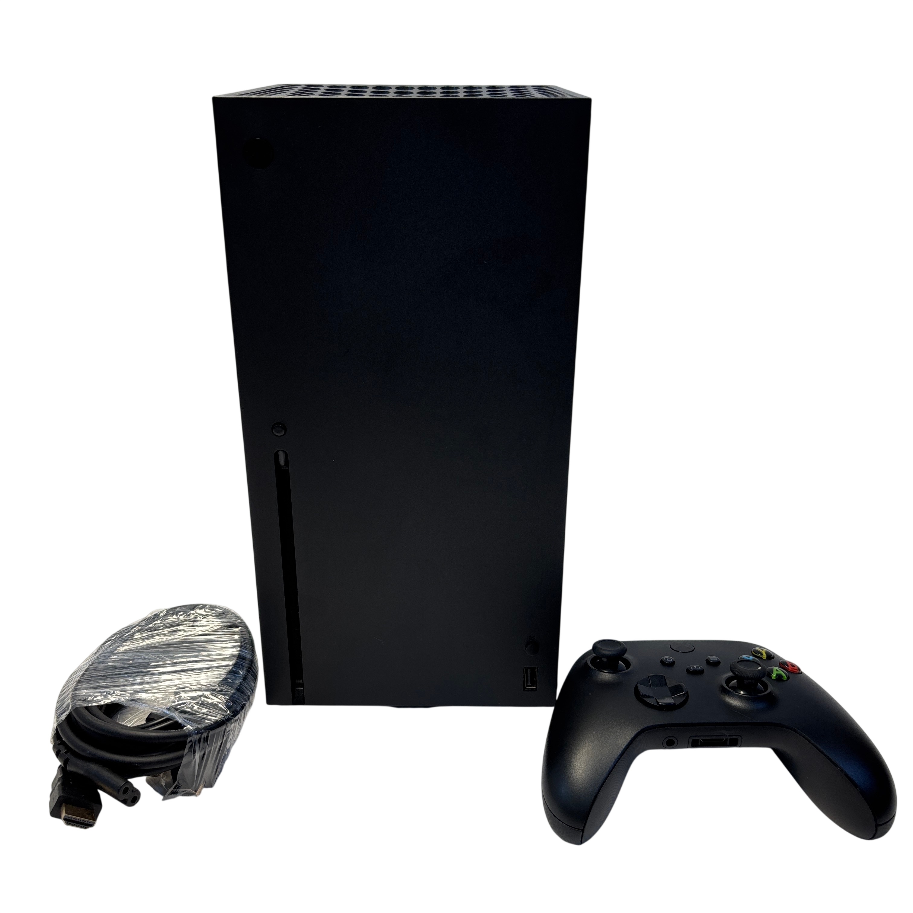 The Microsoft Xbox Series X is a high-performance video game console designed for immersive 4K gaming experiences. This black console features a compact tower design and comes complete with a wireless controller, power cable, and HDMI cable. With its powerful hardware and fast SSD storage, the Xbox Series X delivers smooth gameplay and quick load times, making it ideal for serious gamers. The set includes everything needed to start gaming right out of the box.