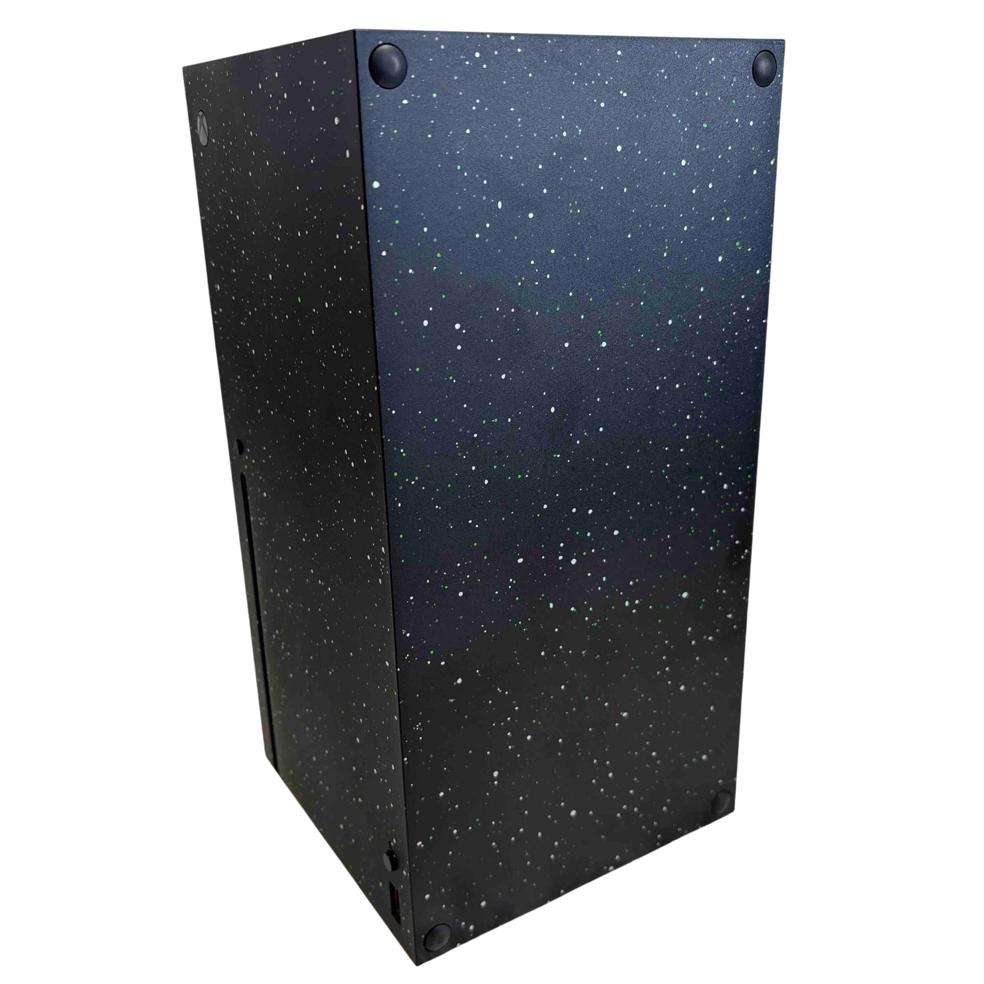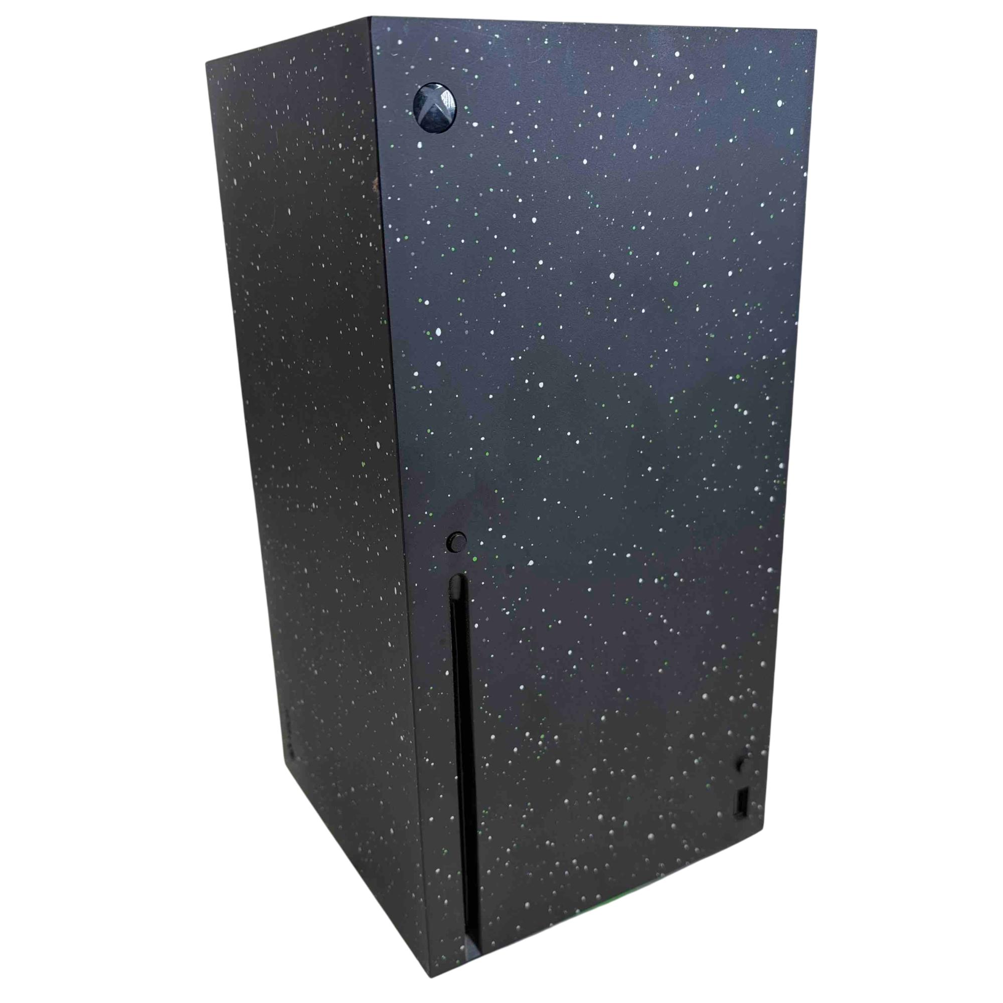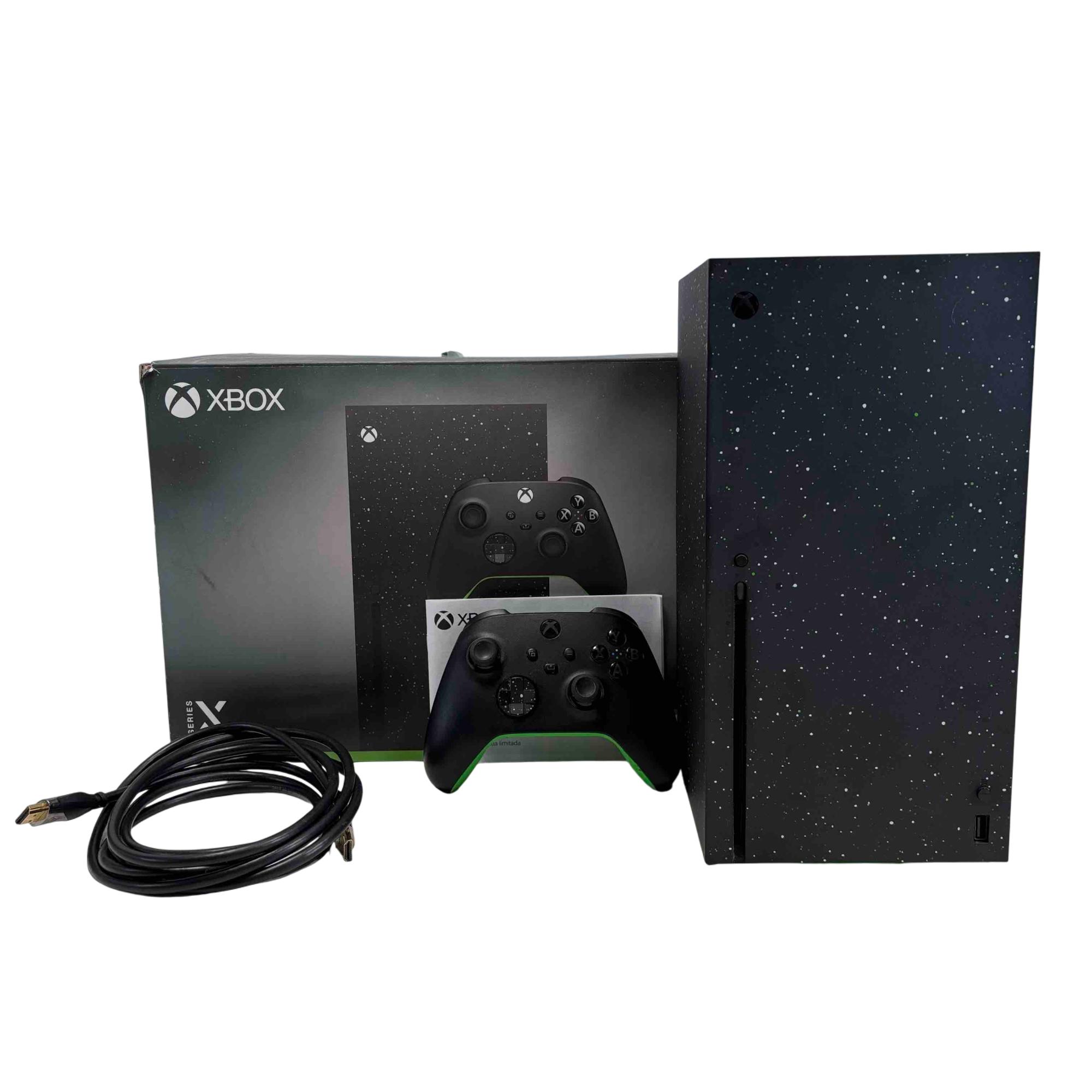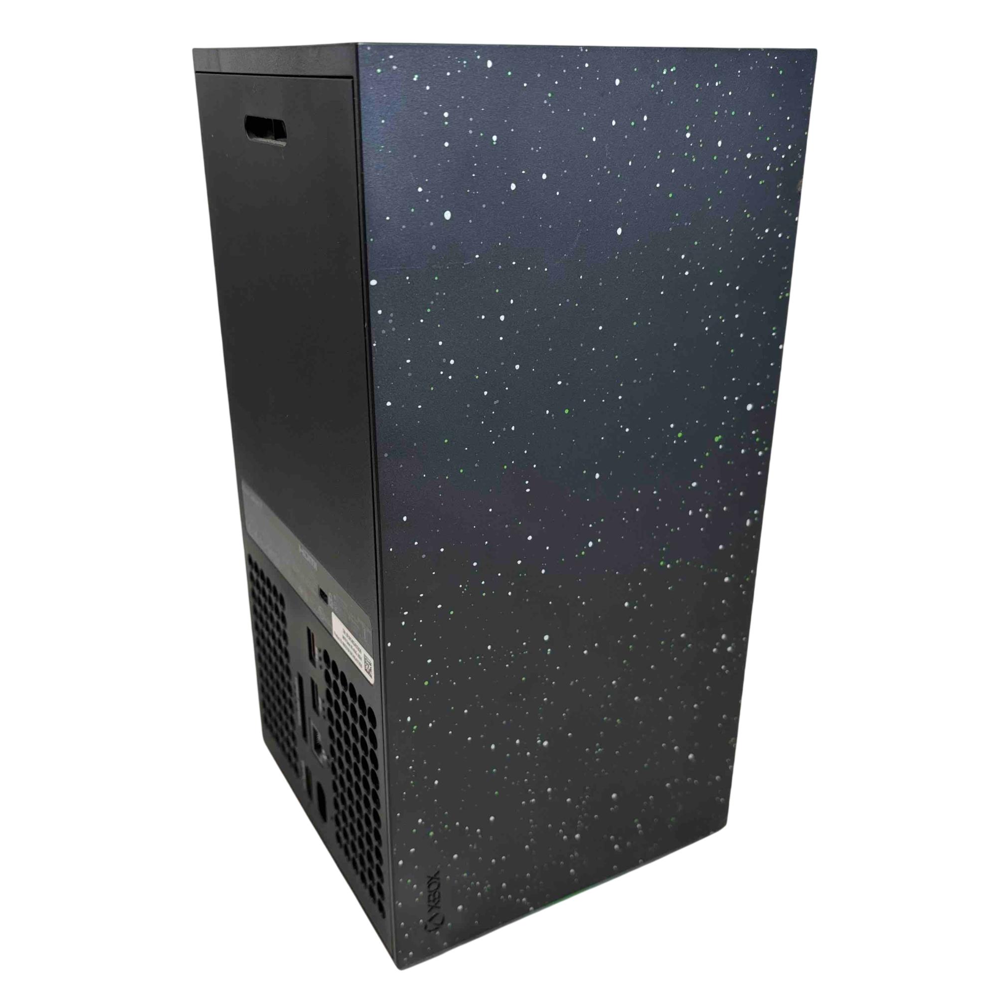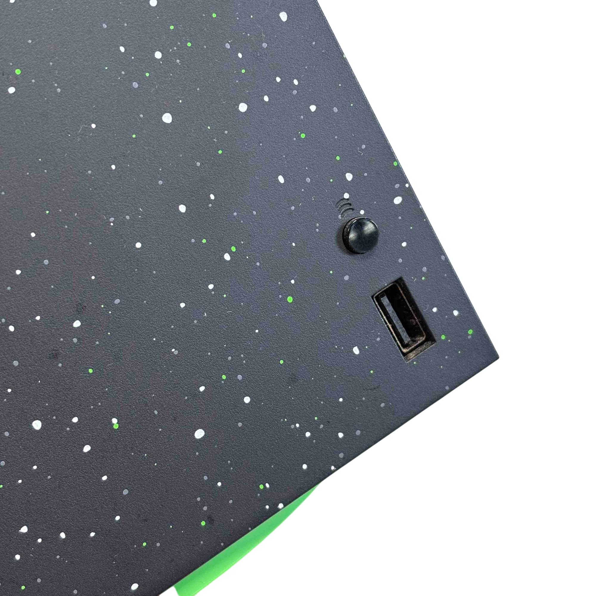The Microsoft Xbox Series X 1882 Galaxy Black Special Edition Video Game Console features a powerful 2TB SSD for ultra-fast game loading and seamless 4K UHD gaming. This black, white, and green console offers high performance with support for HDMI connectivity and advanced cooling, delivering an immersive gaming experience.