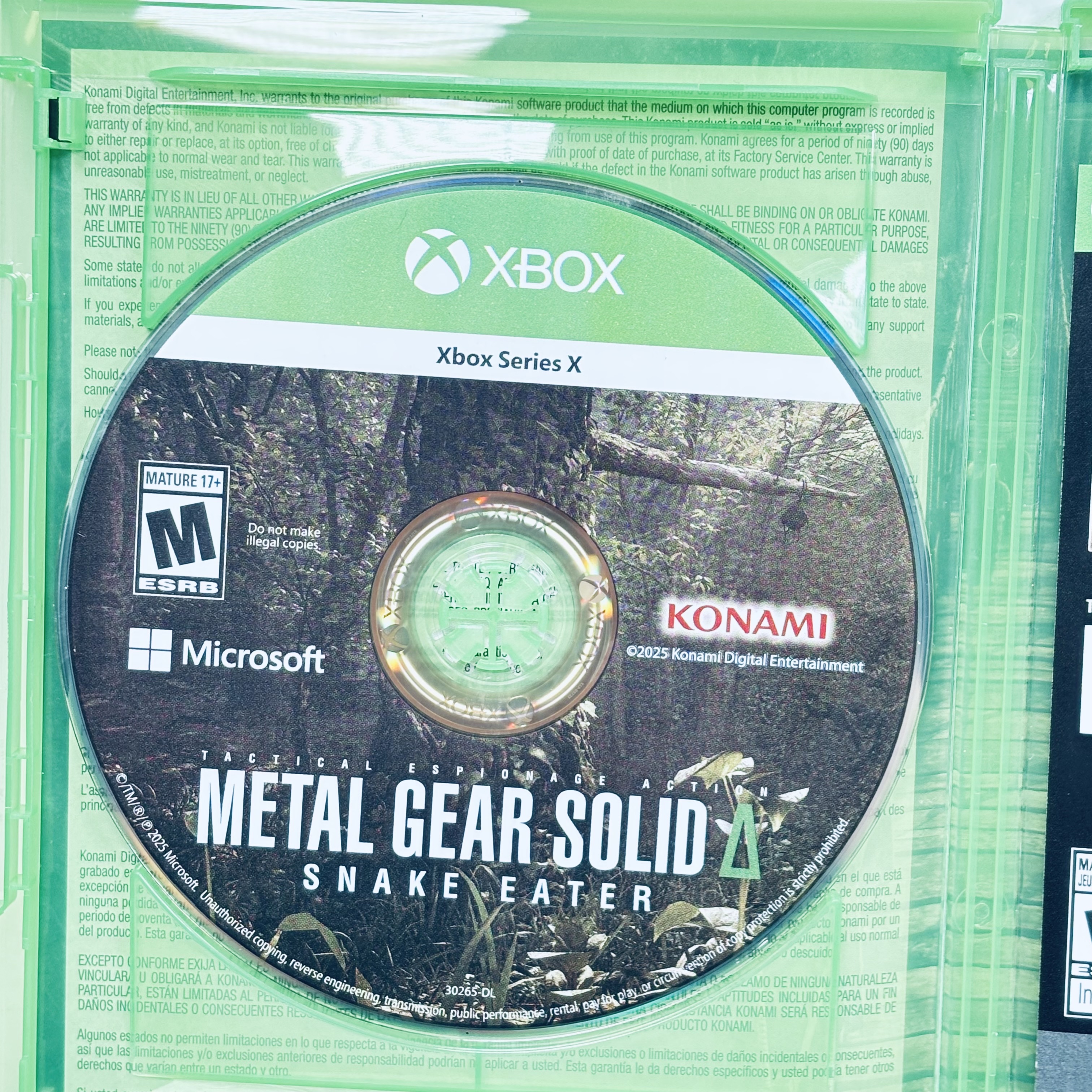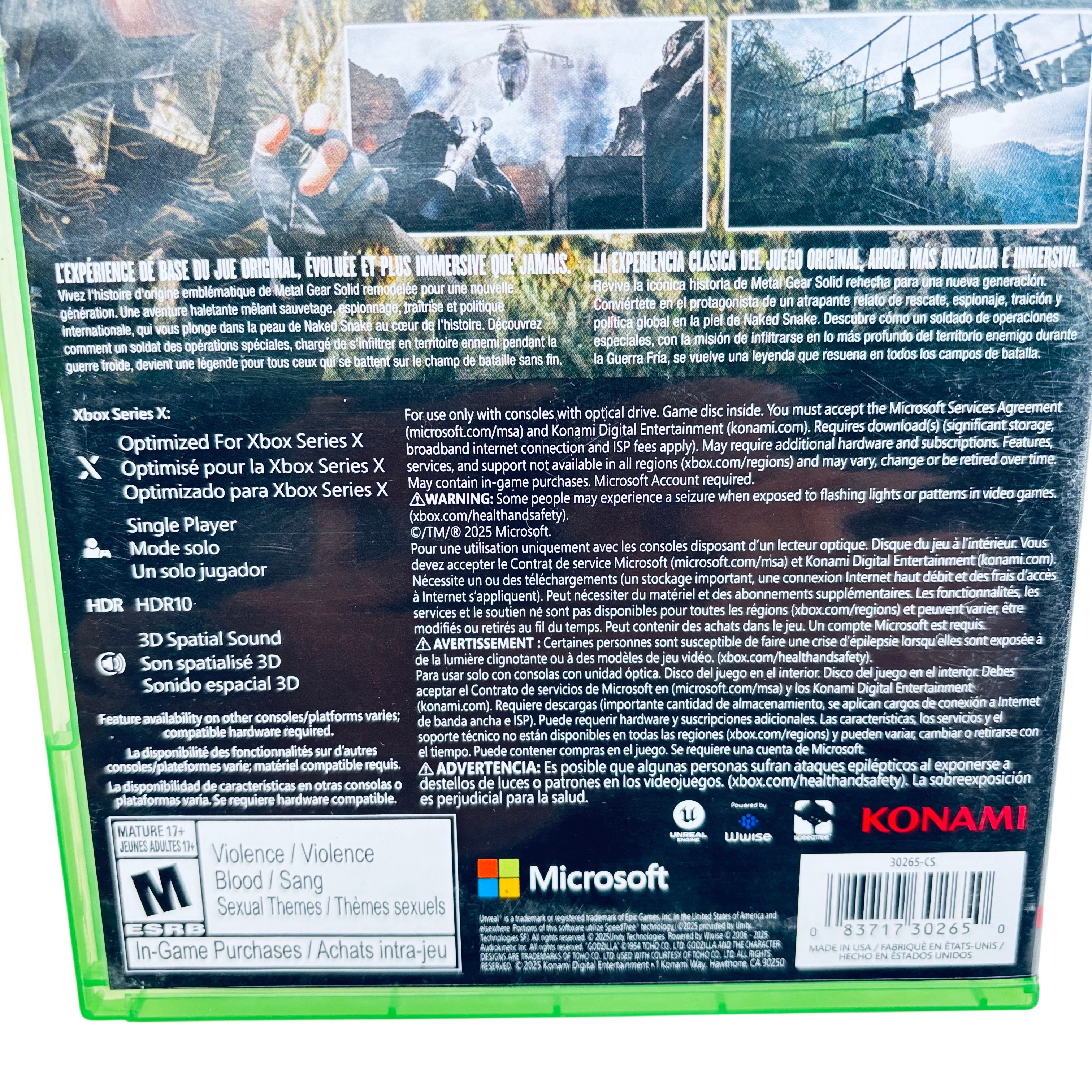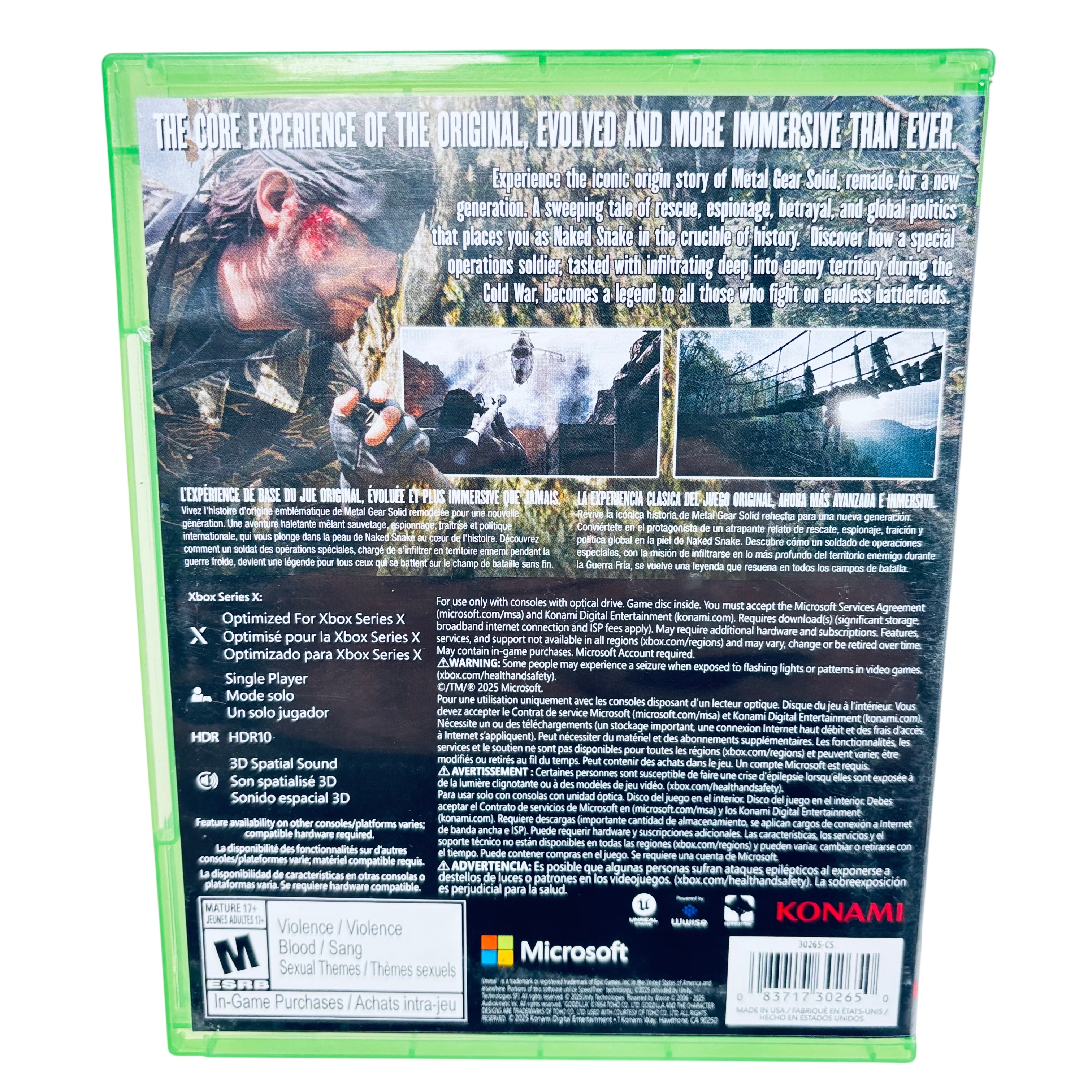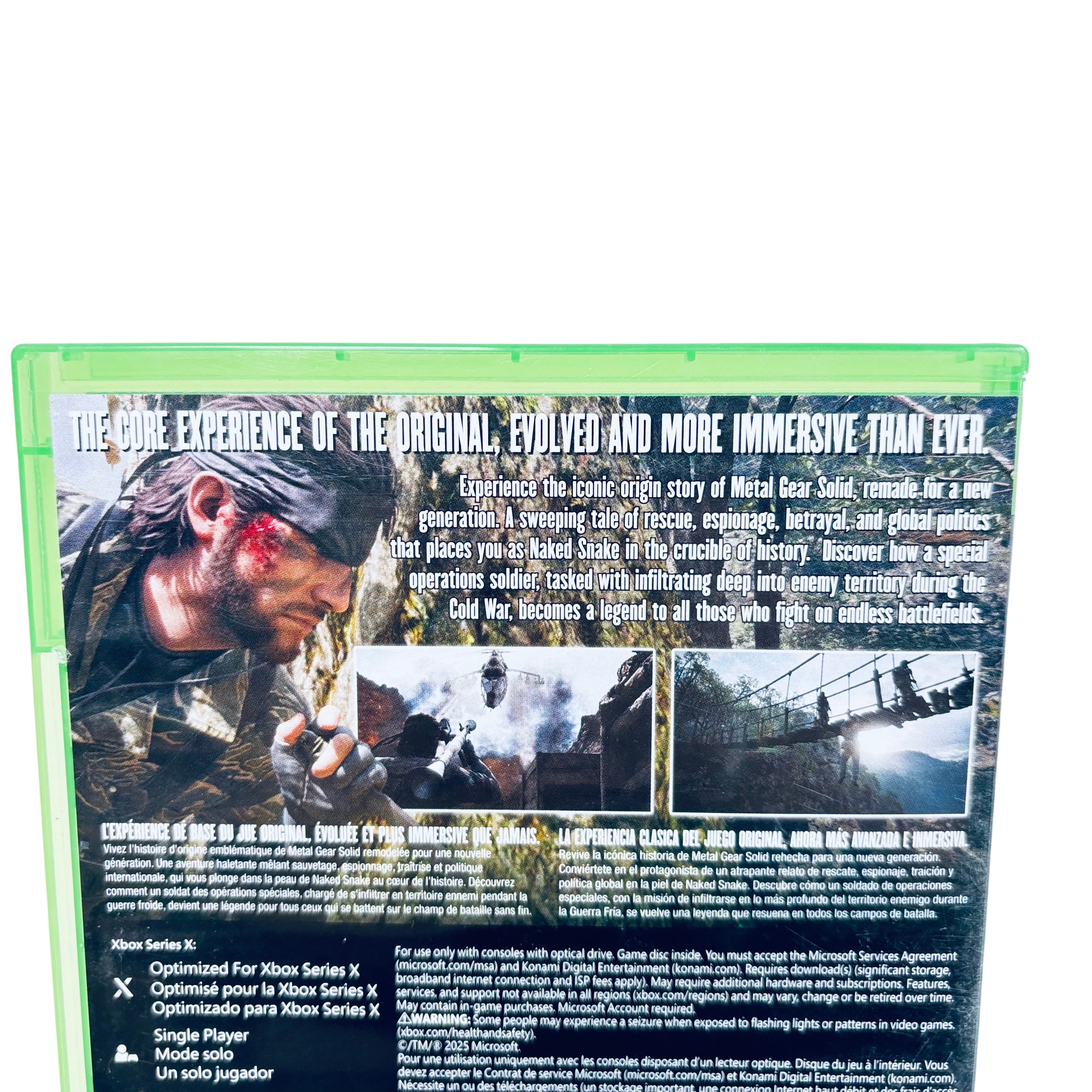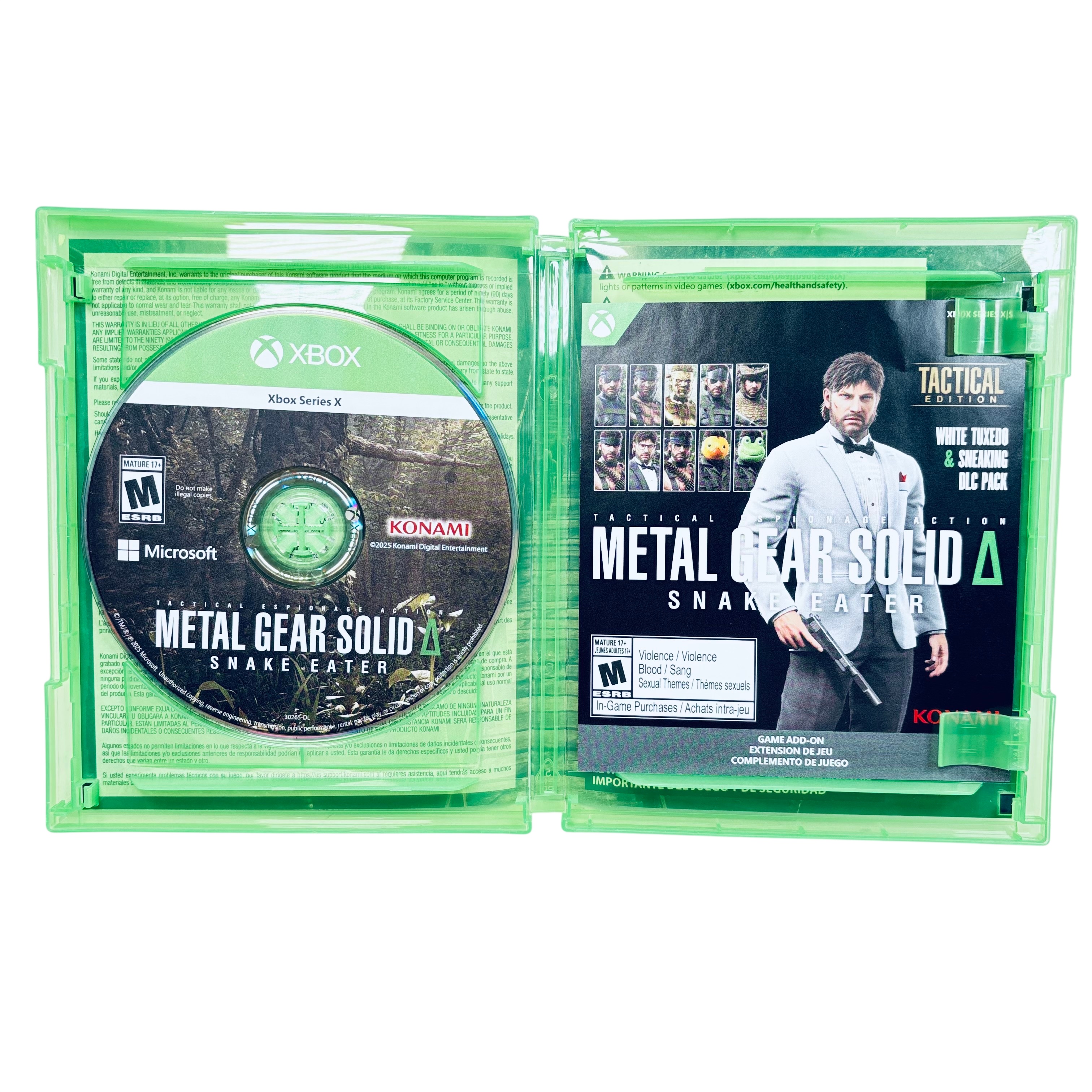 Microsoft Metal Gear Solid Snake Eater Tactical Edition for Xbox Series X delivers an immersive tactical espionage experience optimized for next-gen consoles. This single-player game features HDR10 and 3D spatial sound for enhanced visual and audio fidelity. The game disc is included inside a green Xbox case, rated Mature 17+ by ESRB, and supports in-game purchases. Dive into the iconic story of Naked Snake with updated graphics and gameplay designed for Xbox Series X players.