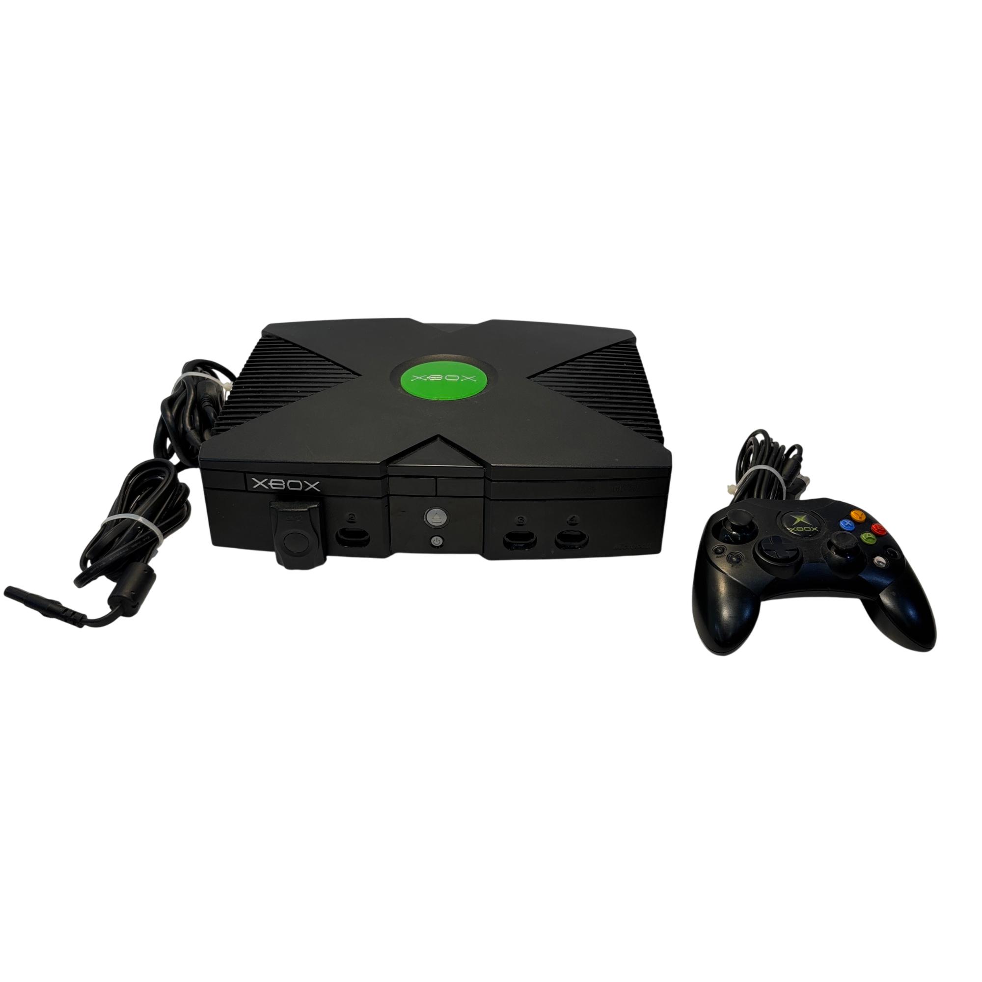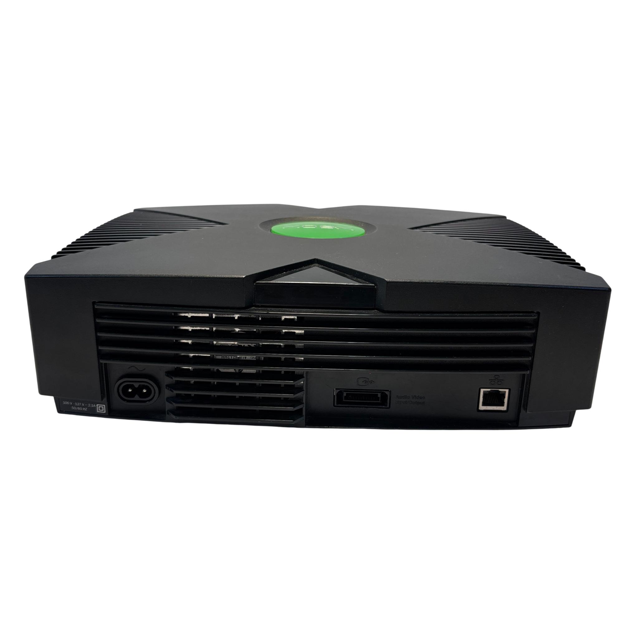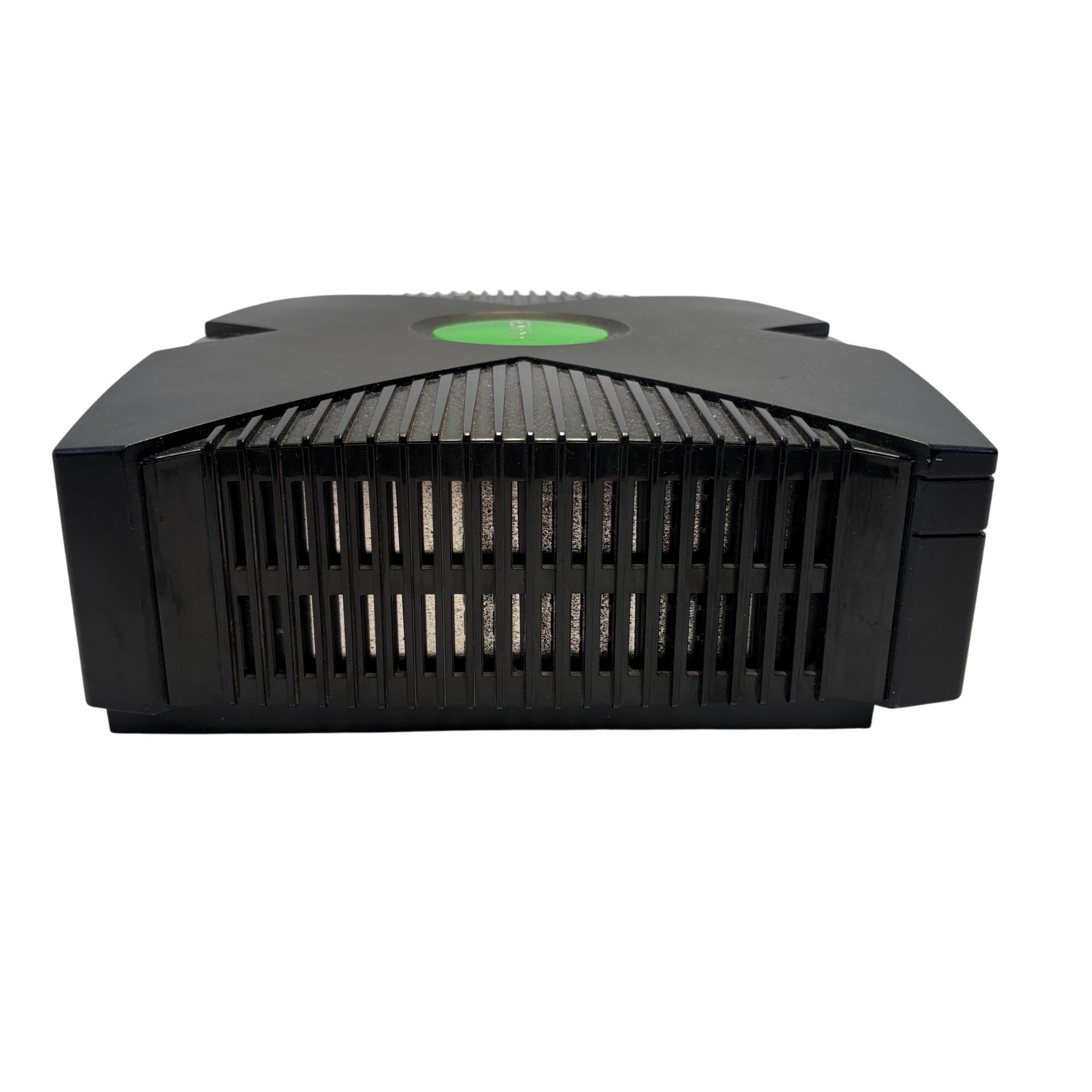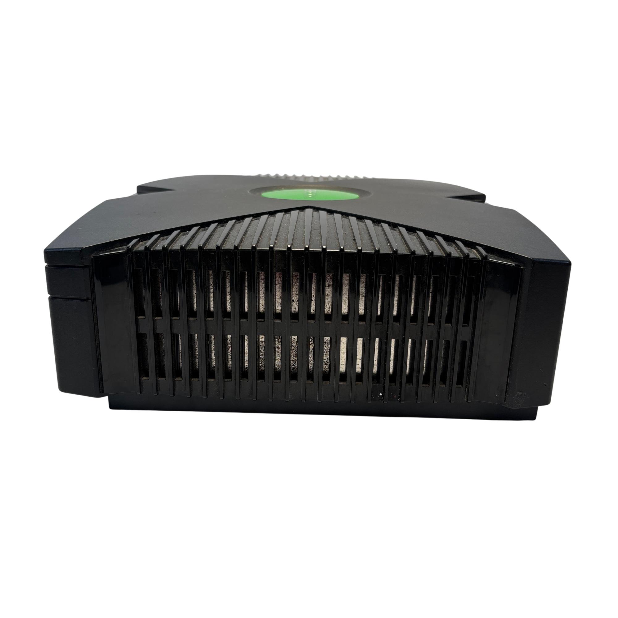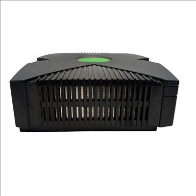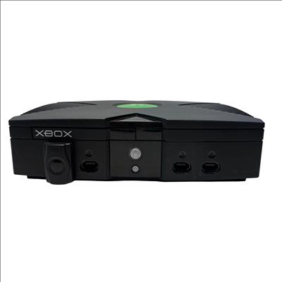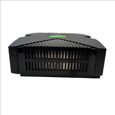 The Microsoft Xbox is a black gaming system featuring a distinctive green circular logo on its side. Designed for immersive gameplay, this console offers a robust build and multiple ports for various AV connections, delivering classic video game entertainment with reliable performance.