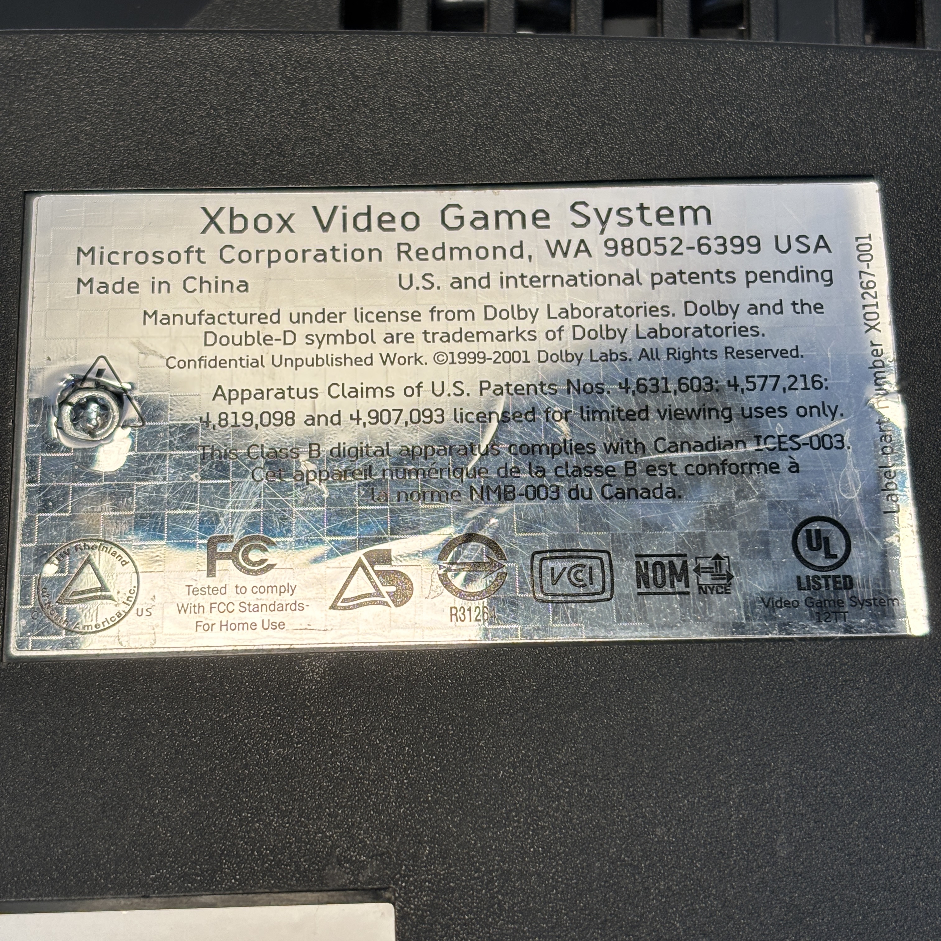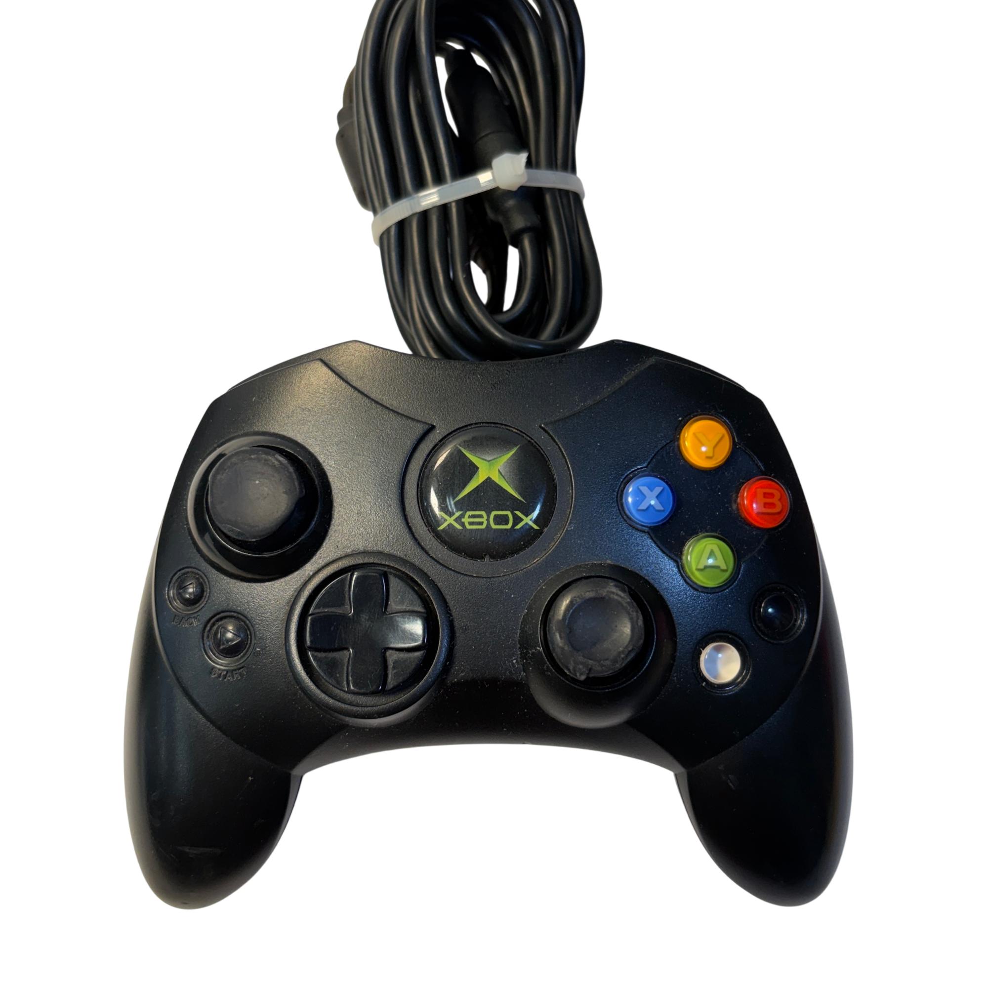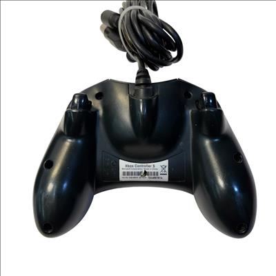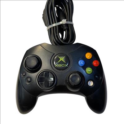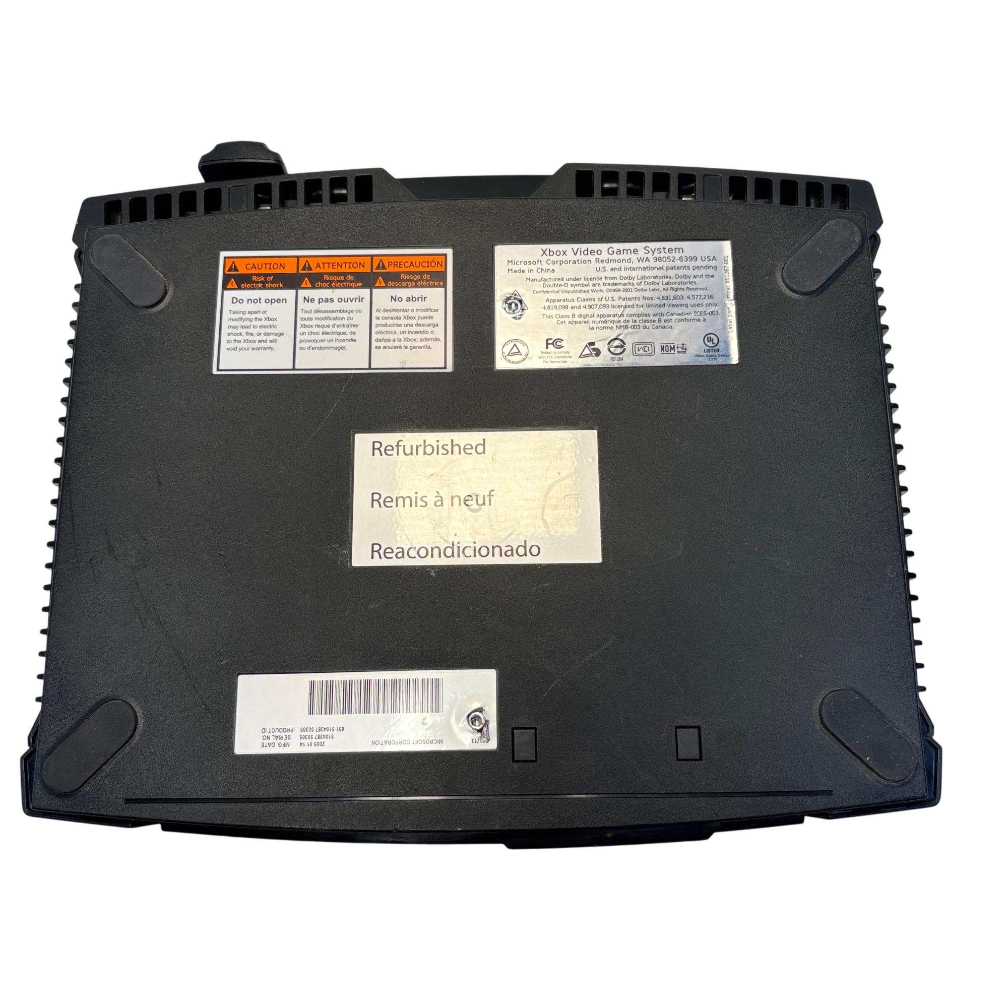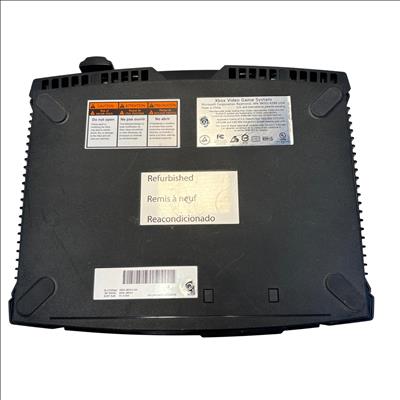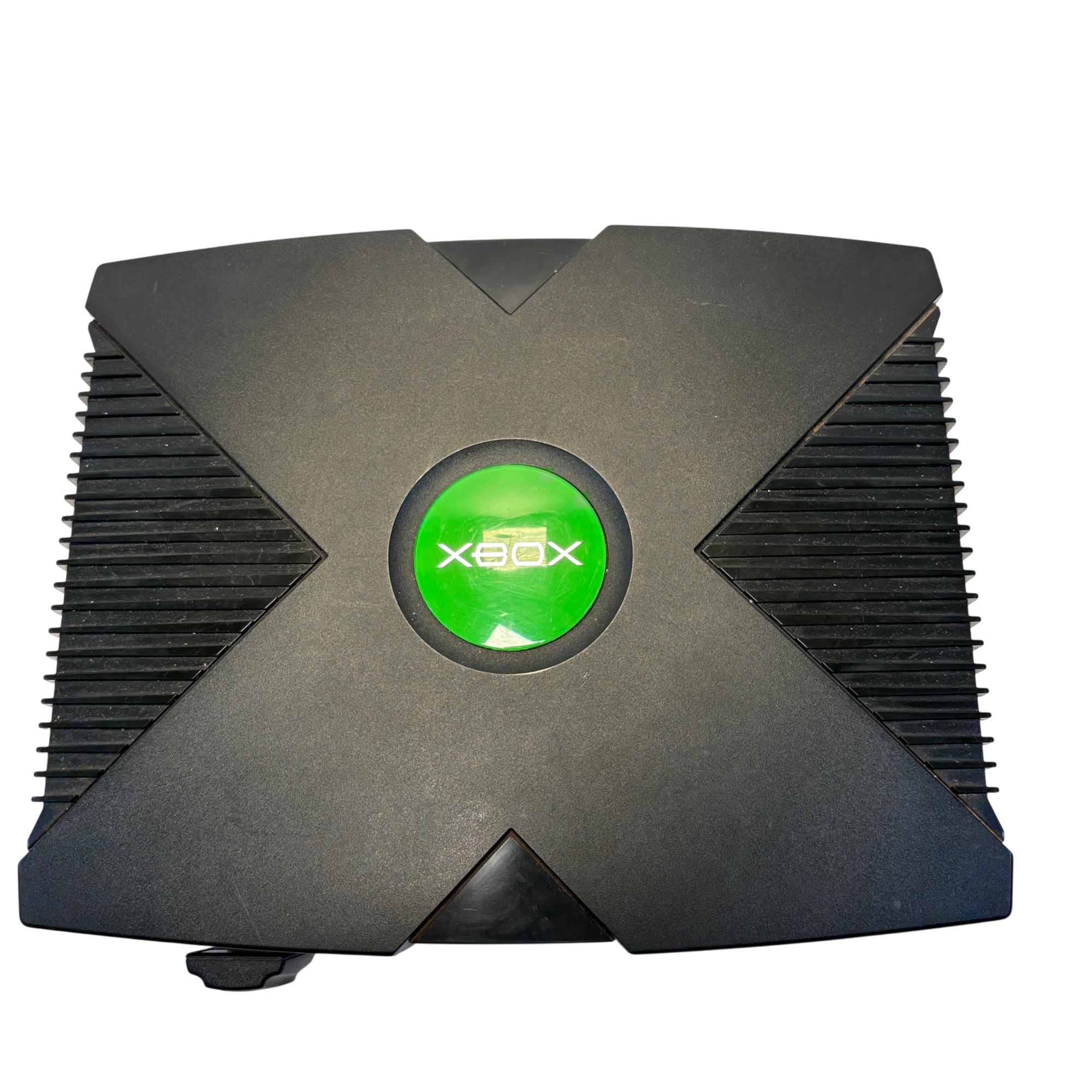 The Microsoft Xbox is a black gaming system featuring a distinctive green circular logo on its side. Designed for immersive gameplay, this console offers a robust build and multiple ports for various AV connections, delivering classic video game entertainment with reliable performance.