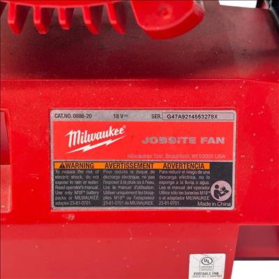 The Milwaukee 0886-20 M18 18-Volt Lithium-Ion Cordless Jobsite Fan delivers powerful airflow with up to 284 CFMs and 18 MPH maximum velocity. Its 120-degree adjustable head with nine stopping positions allows precise control of airflow direction. With three speed settings—high, medium, and low—this fan offers versatile performance for any jobsite, ensuring efficient cooling and ventilation.