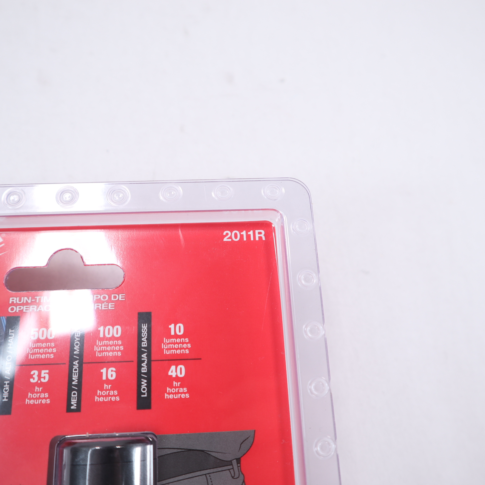 3 Light Output Modes: High mode: 500-Lumens- 3.5 hours; Medium mode: 100-Lumens - 16 hours; Low mode: 10-Lumens- 40 hours
