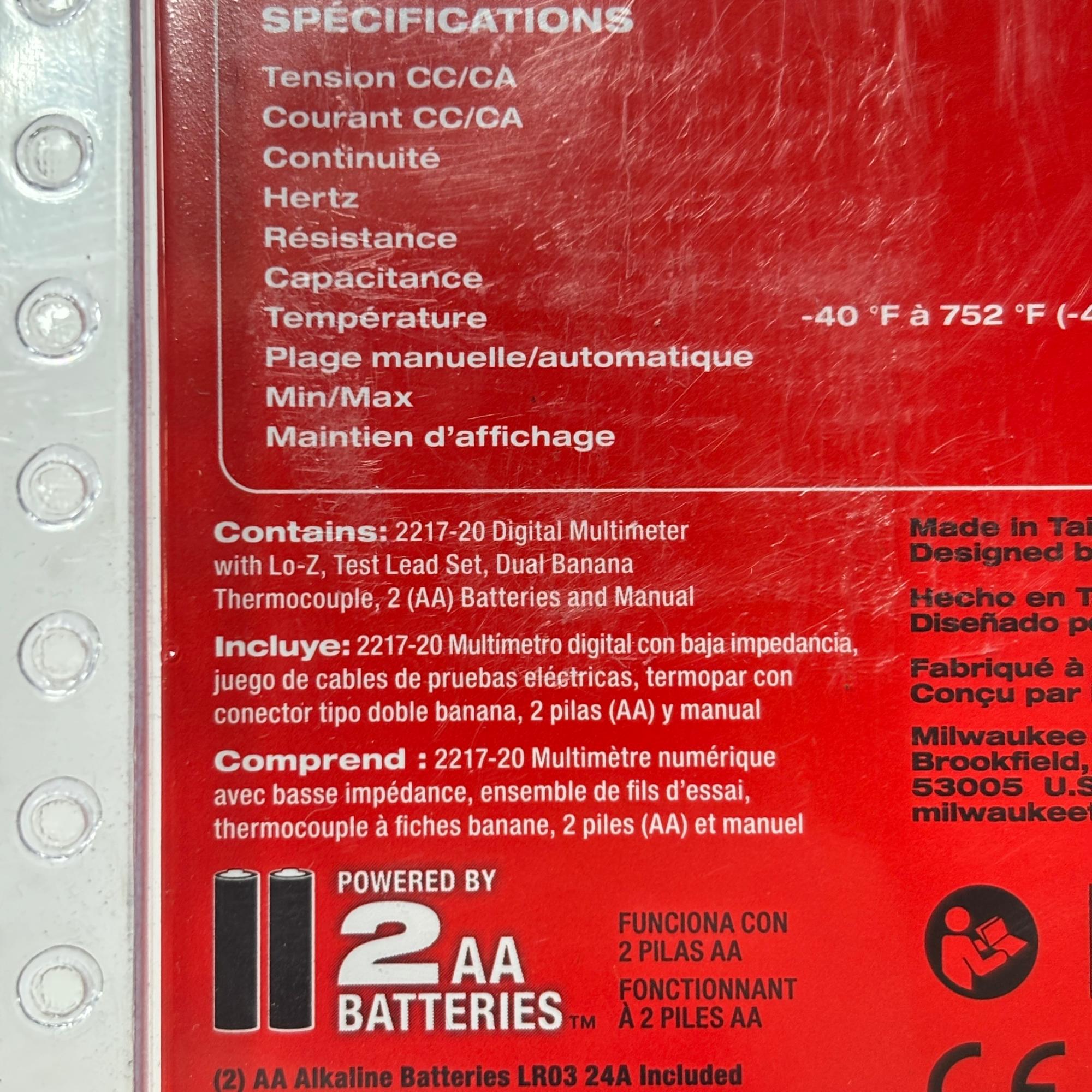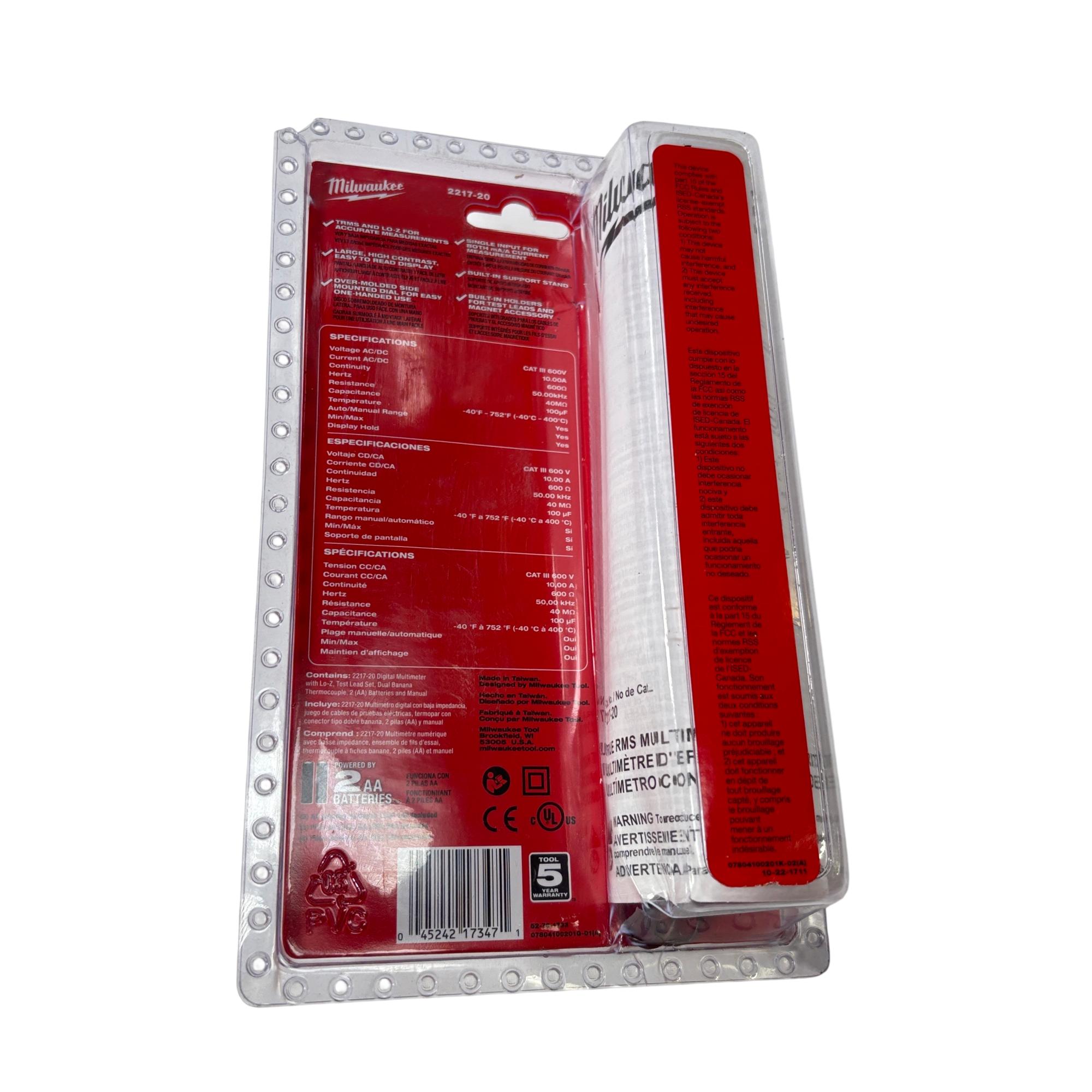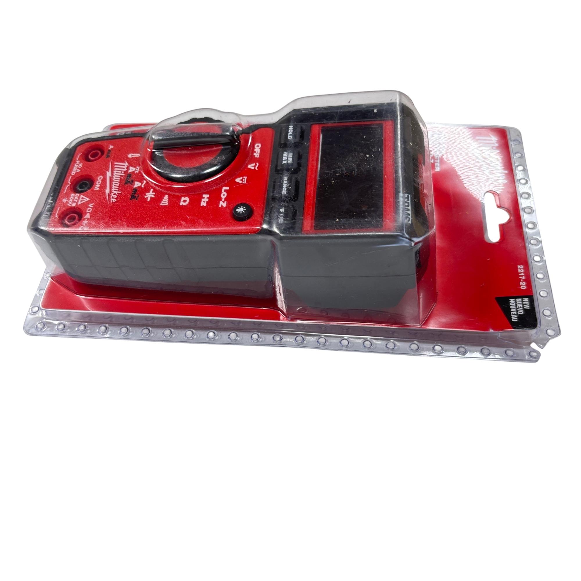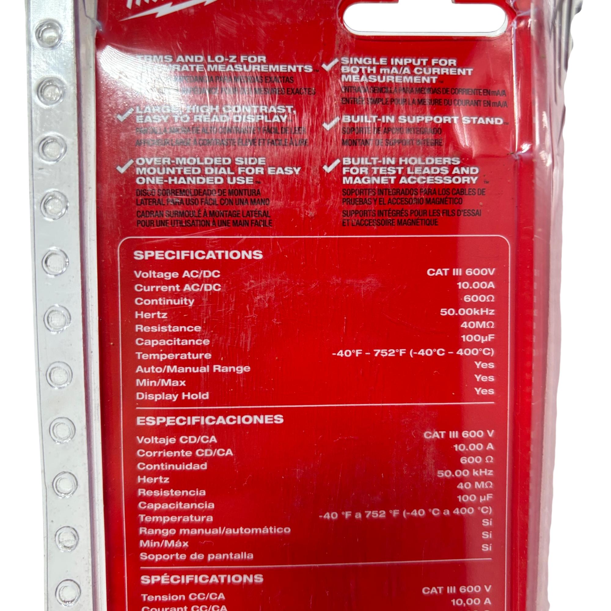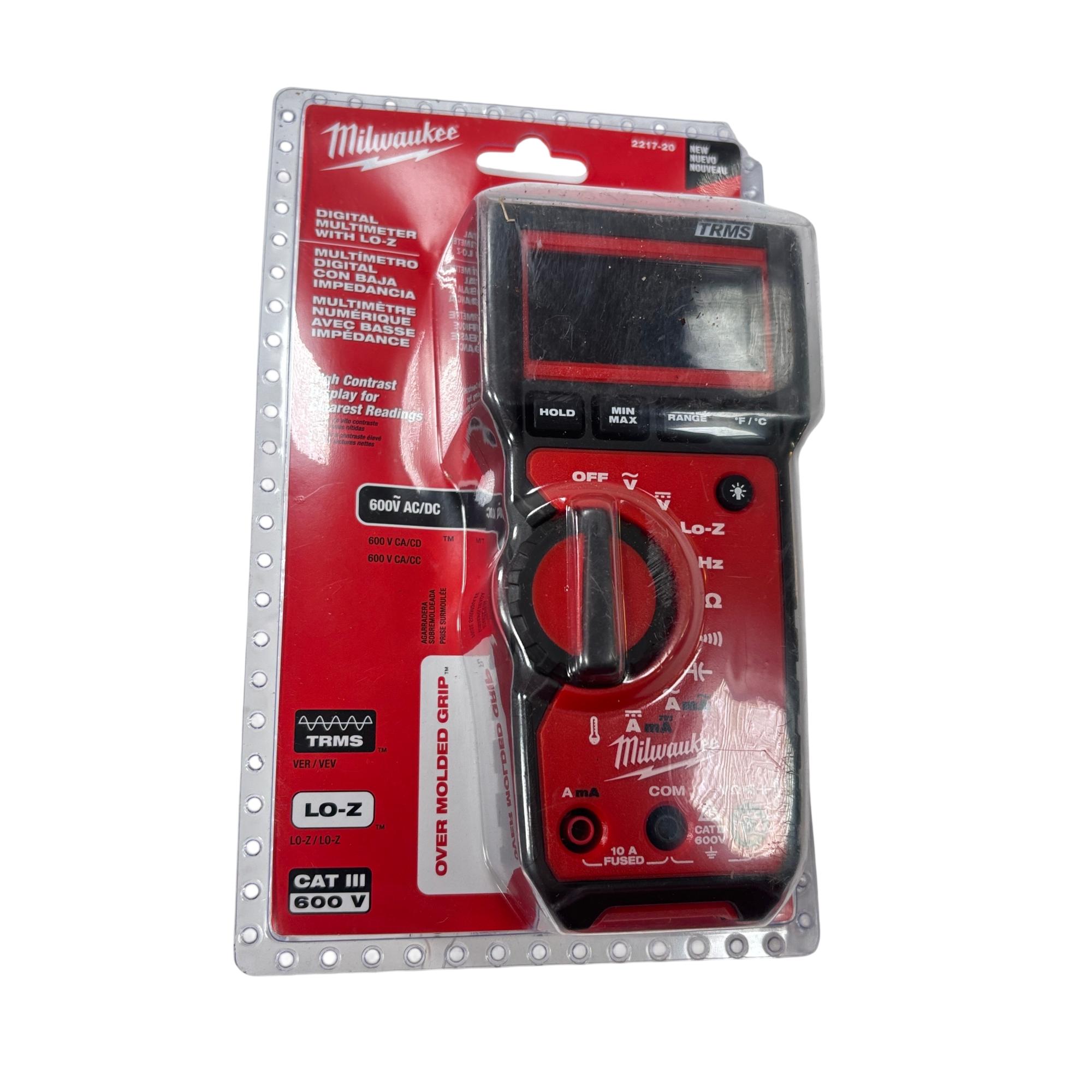Milwaukee 2217-20 Digital Multimeter with Lo-Z offers precise measurements for voltage, current, resistance, capacitance, and temperature within a wide range of industrial applications. Featuring a large high-contrast display, built-in support stand, auto/manual ranging, and a mounted dial for easy one-handed operation, this multimeter meets CAT III 600V safety standards and supports AC/DC testing up to 10A.