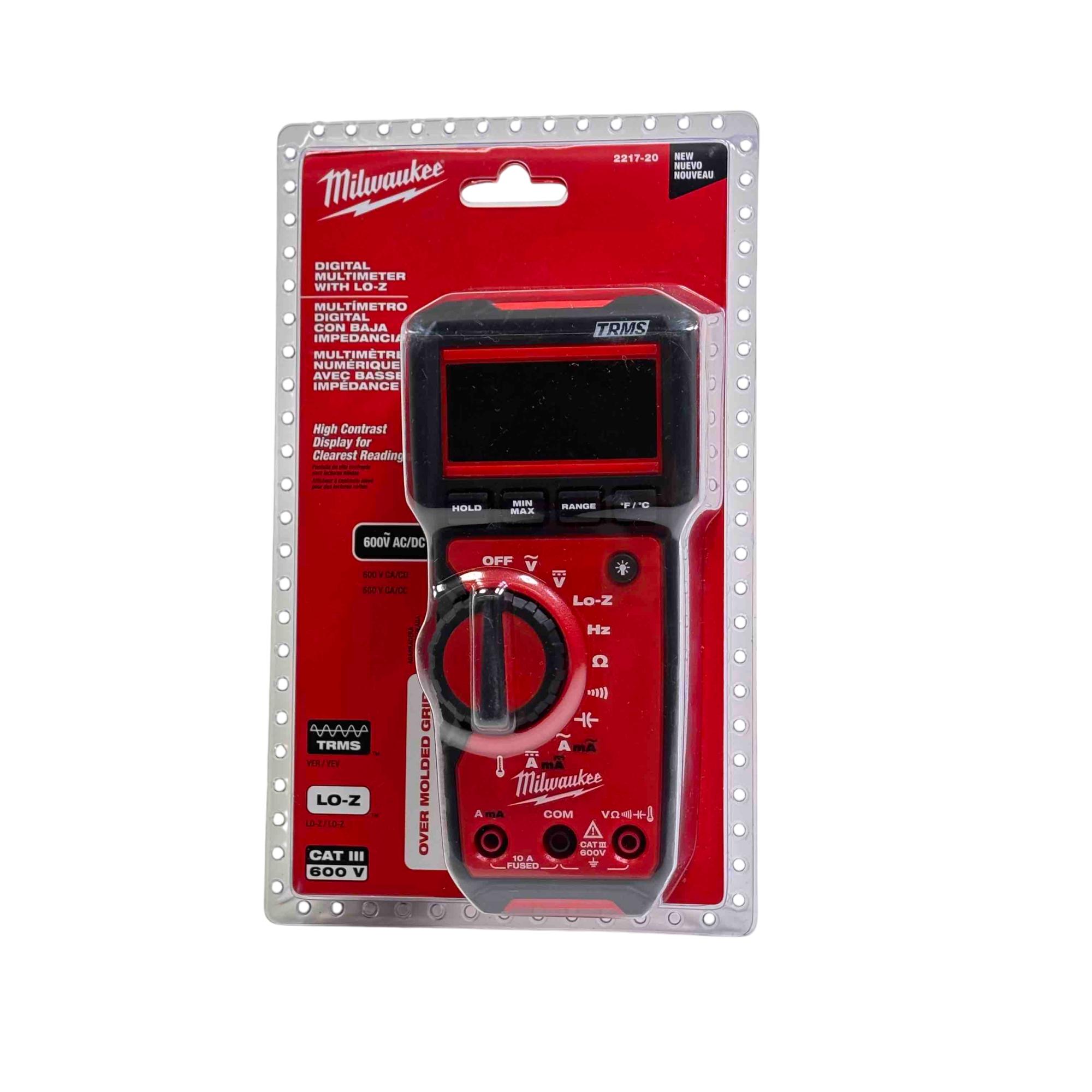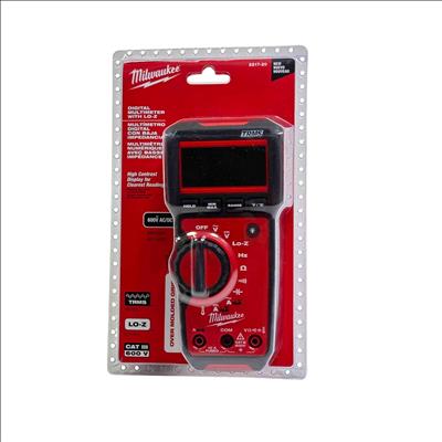 Milwaukee 2217-20 Digital Multimeter with Lo-Z TRMS, CAT III 600V features a high-contrast display for clear readings and measures up to 600V AC/DC with true RMS accuracy. This rugged multimeter includes auto-range capability, low impedance (Lo-Z) mode to prevent ghost voltages, and supports measurements of voltage, current, resistance, frequency, and continuity in a durable over-molded grip design optimized for industrial use.
