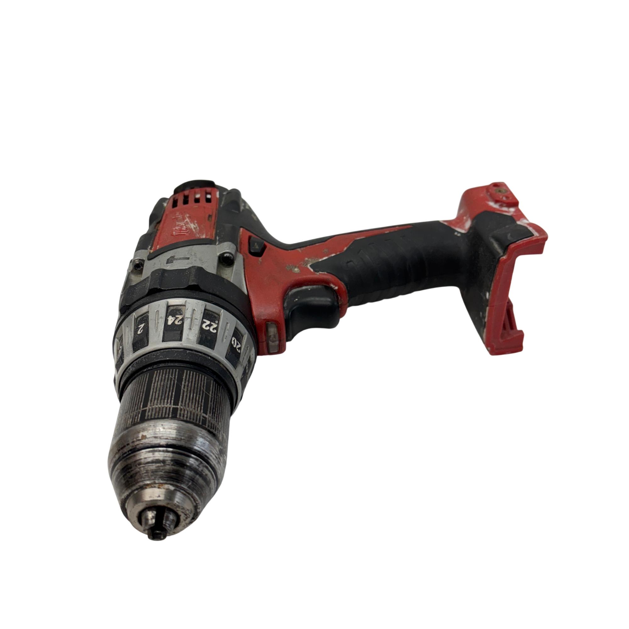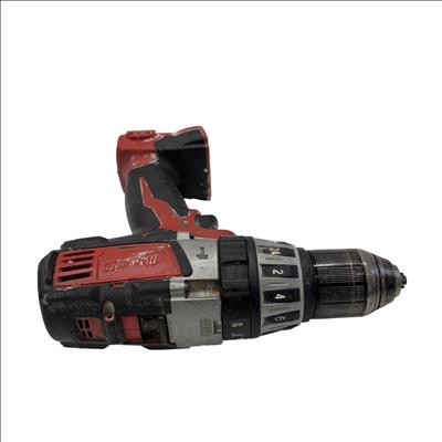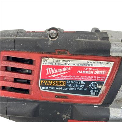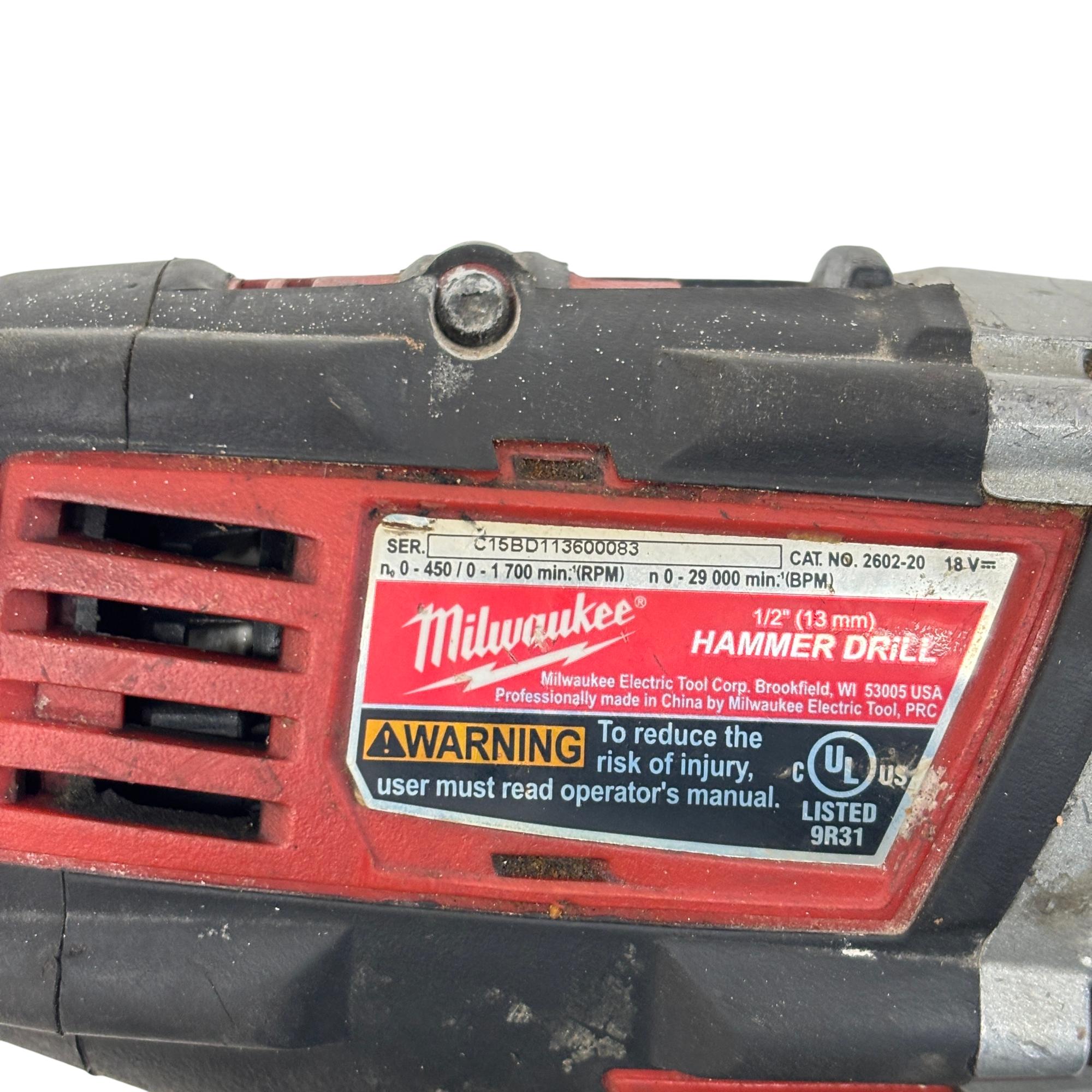 Milwaukee 2602-20 M18 18V Lithium-Ion Cordless 1/2" Hammer Drill/Driver delivers powerful performance with a high-speed motor capable of reaching up to 1700 RPM. This versatile tool features a durable red and black design optimized for heavy-duty drilling and driving tasks, suitable for professional and DIY use.