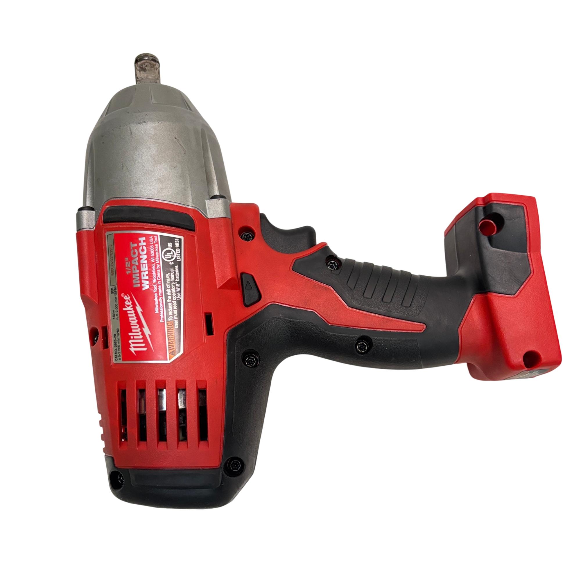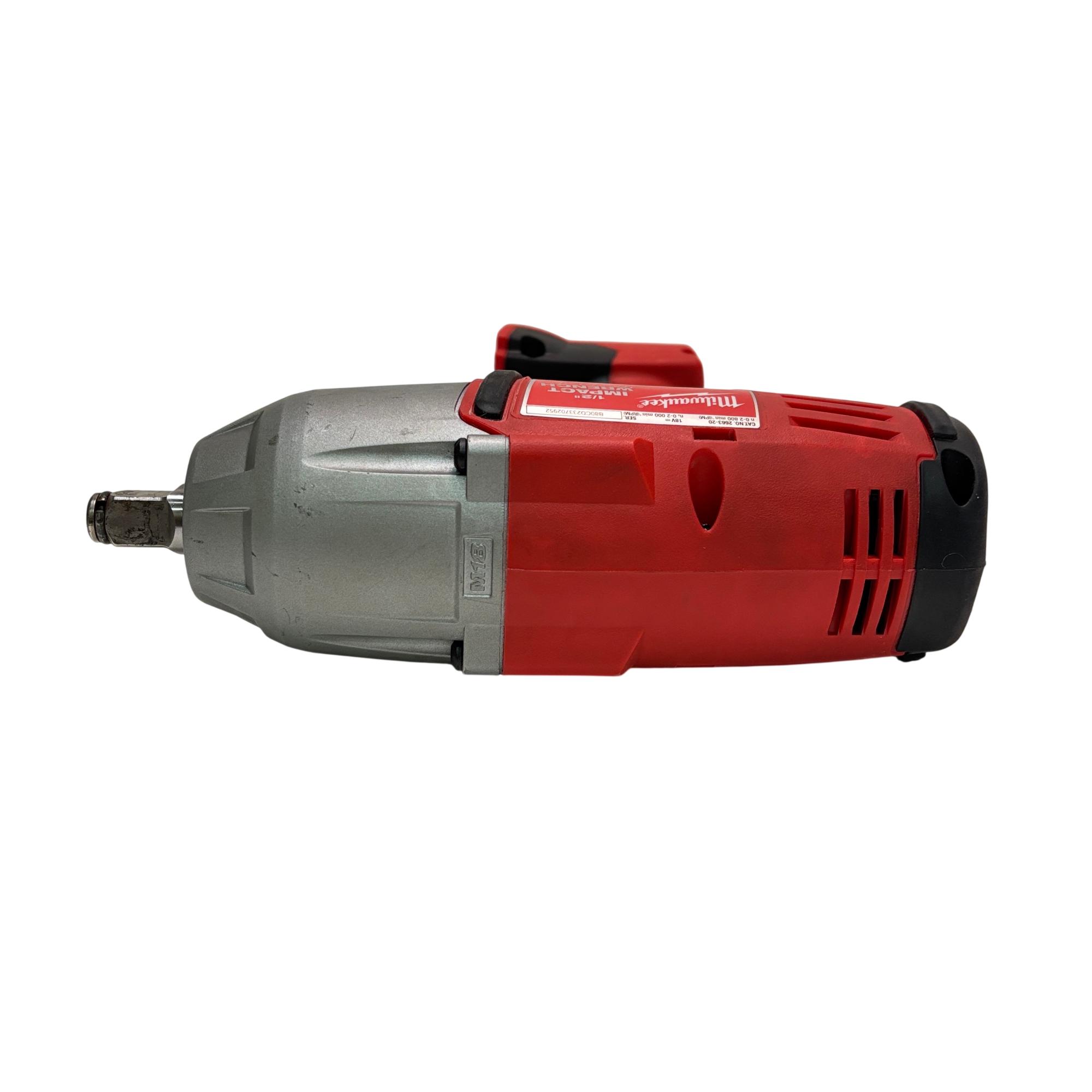 Milwaukee 2663-20 M18 18V Cordless 1/2" High Torque Impact Wrench offers powerful performance with high torque suitable for heavy-duty fastening and loosening applications. Featuring a compact, ergonomic design in red and black, this cordless impact wrench provides enhanced control and durability for professional use on various job sites.